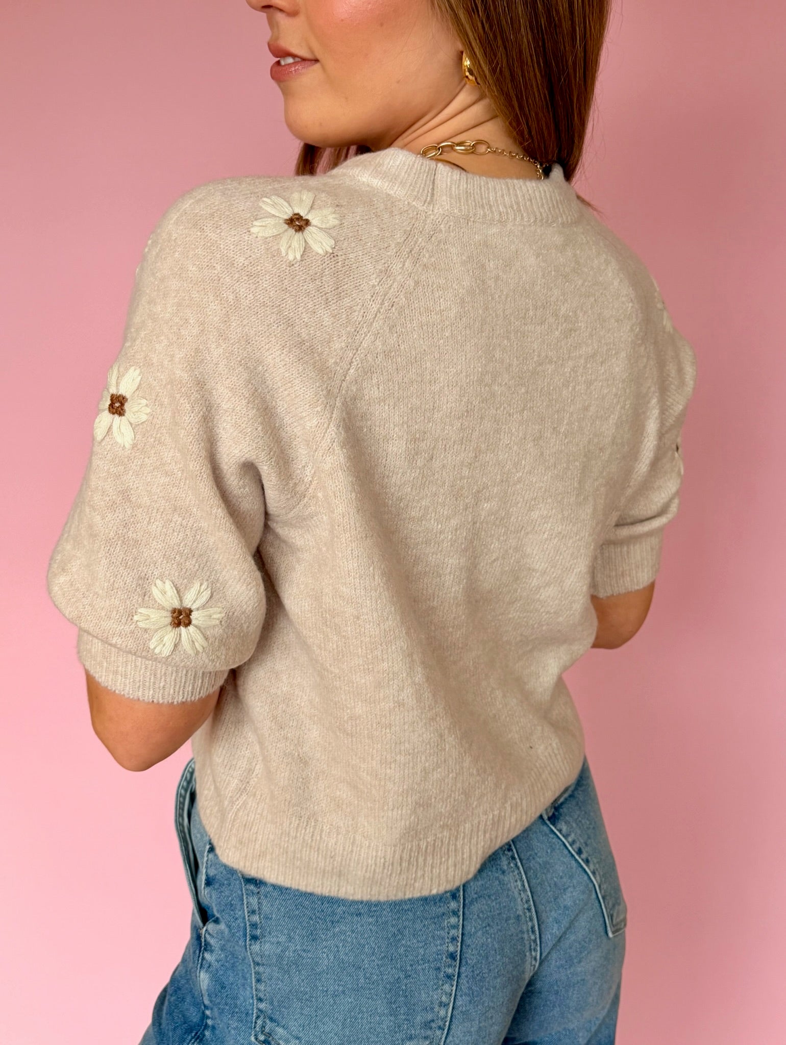 Meet your new wardrobe favorite—a playful knit tee that pairs adorable daisy embroidery with irresistible softness. Dressed in a warm, natural tone with a cozy round neck and short sleeves, this sweater top is your secret weapon for turning any outfit into something special. Feminine, fun, and impossibly easy to style.