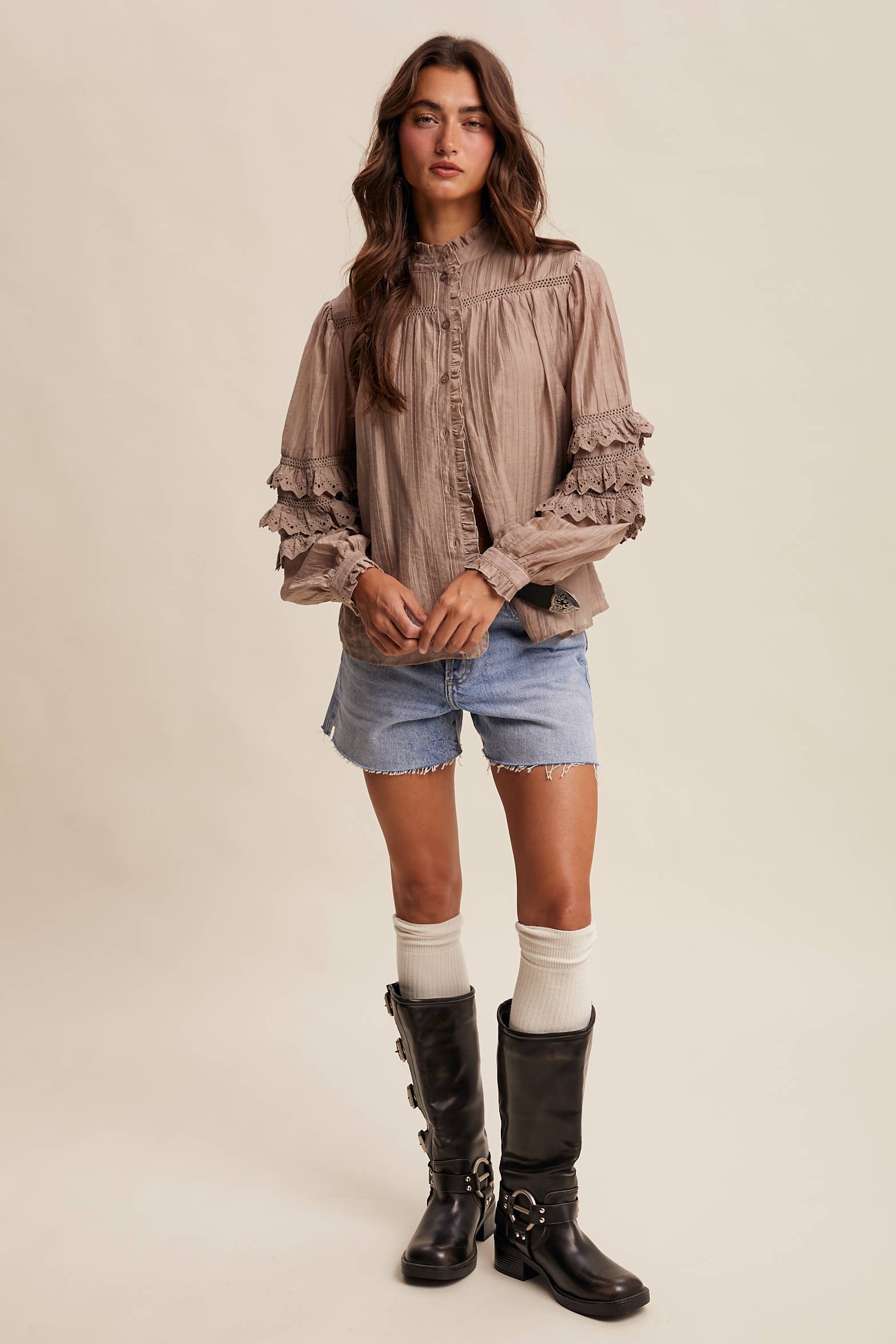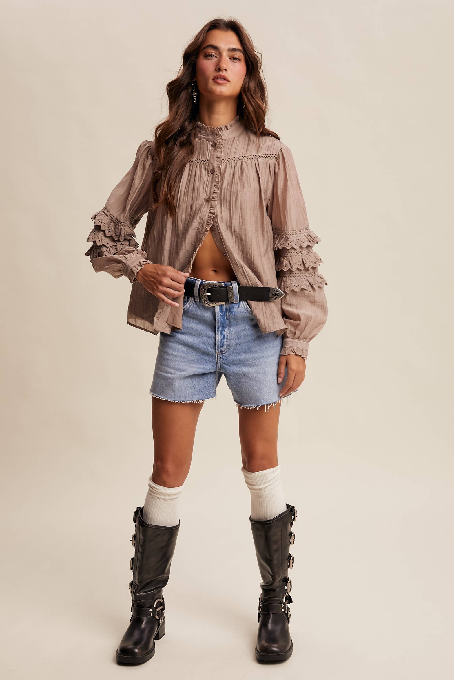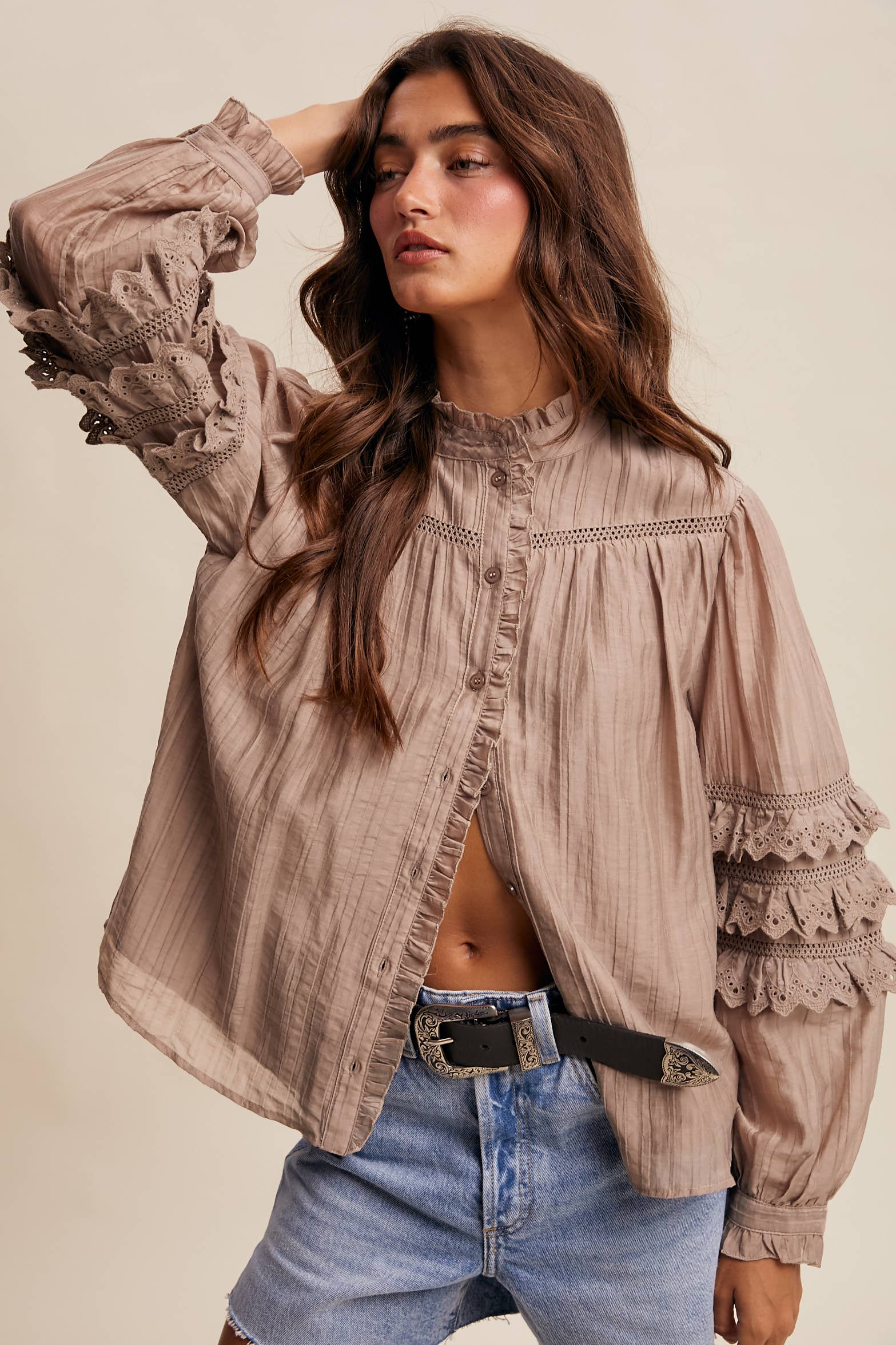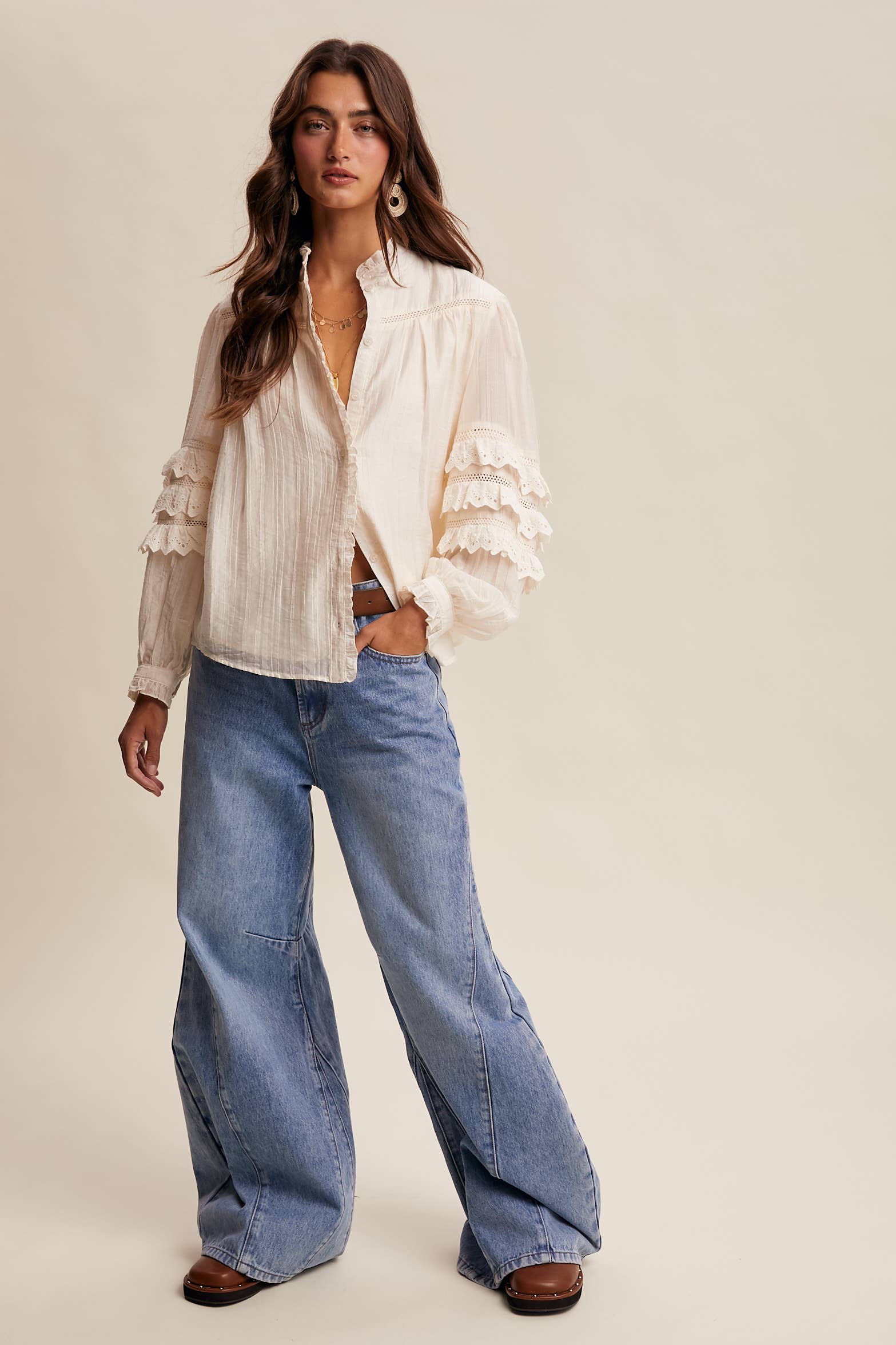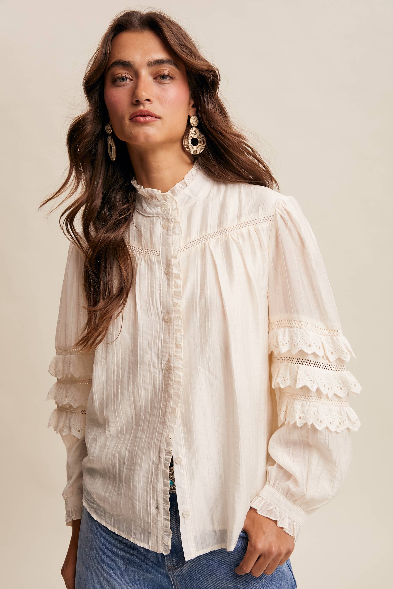 Embrace effortless elegance with this charming blouse that marries vintage romance with modern comfort. Crafted from soft, textured fabric adorned with tonal pintucks, it features delicate lace inserts across the chest and cascading eyelet ruffles on the sleeves for undeniable charm. The relaxed fit, gathered yoke, and lined body create a flattering, breathable silhouette perfect for tucking into denim or layering under your favorite pieces. Button-front closure makes dressing a breeze, while the intricate details—from mini ruffles framing the collar to ladder lace accents—add that sweet, vintage-inspired touch you'll love.