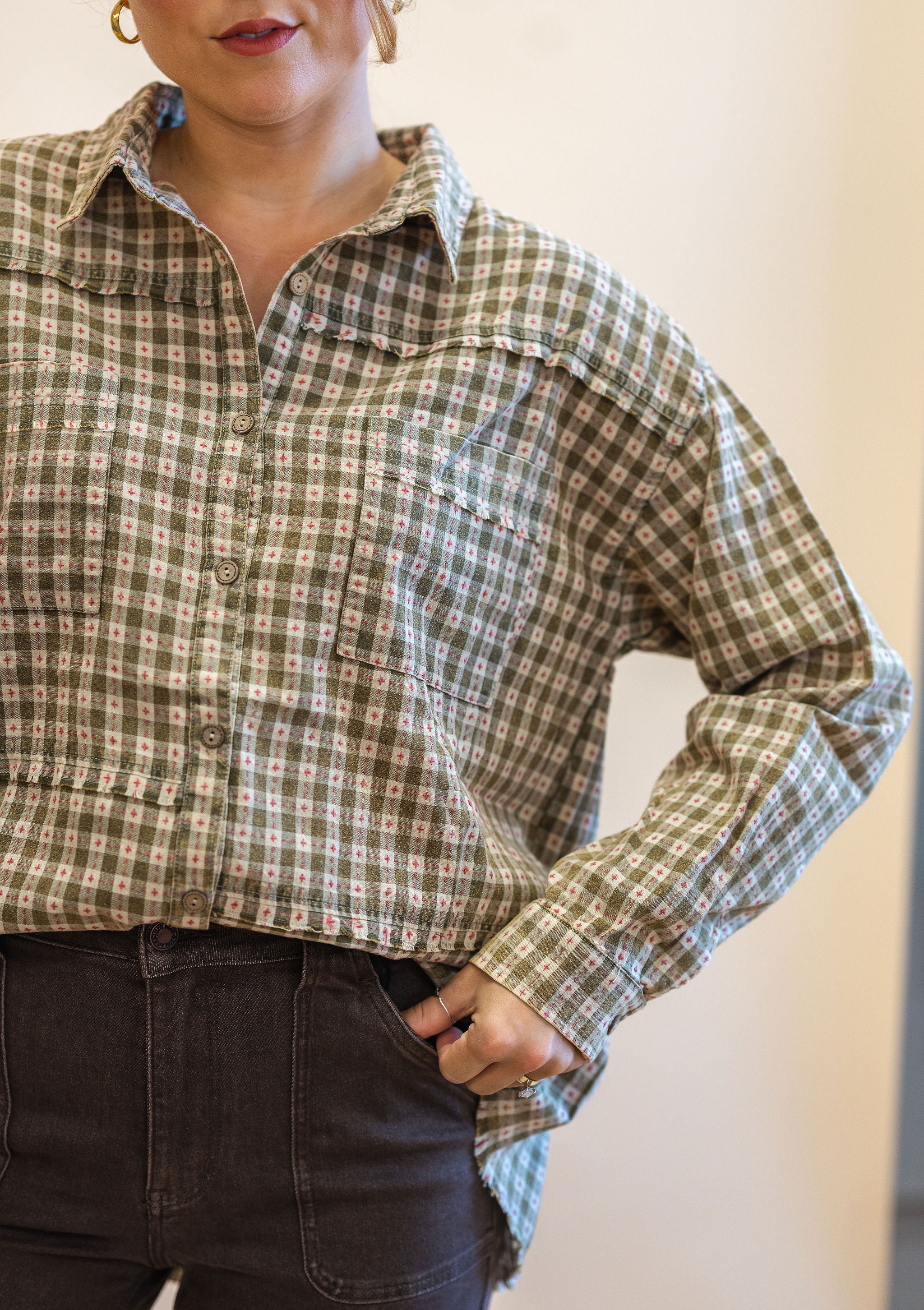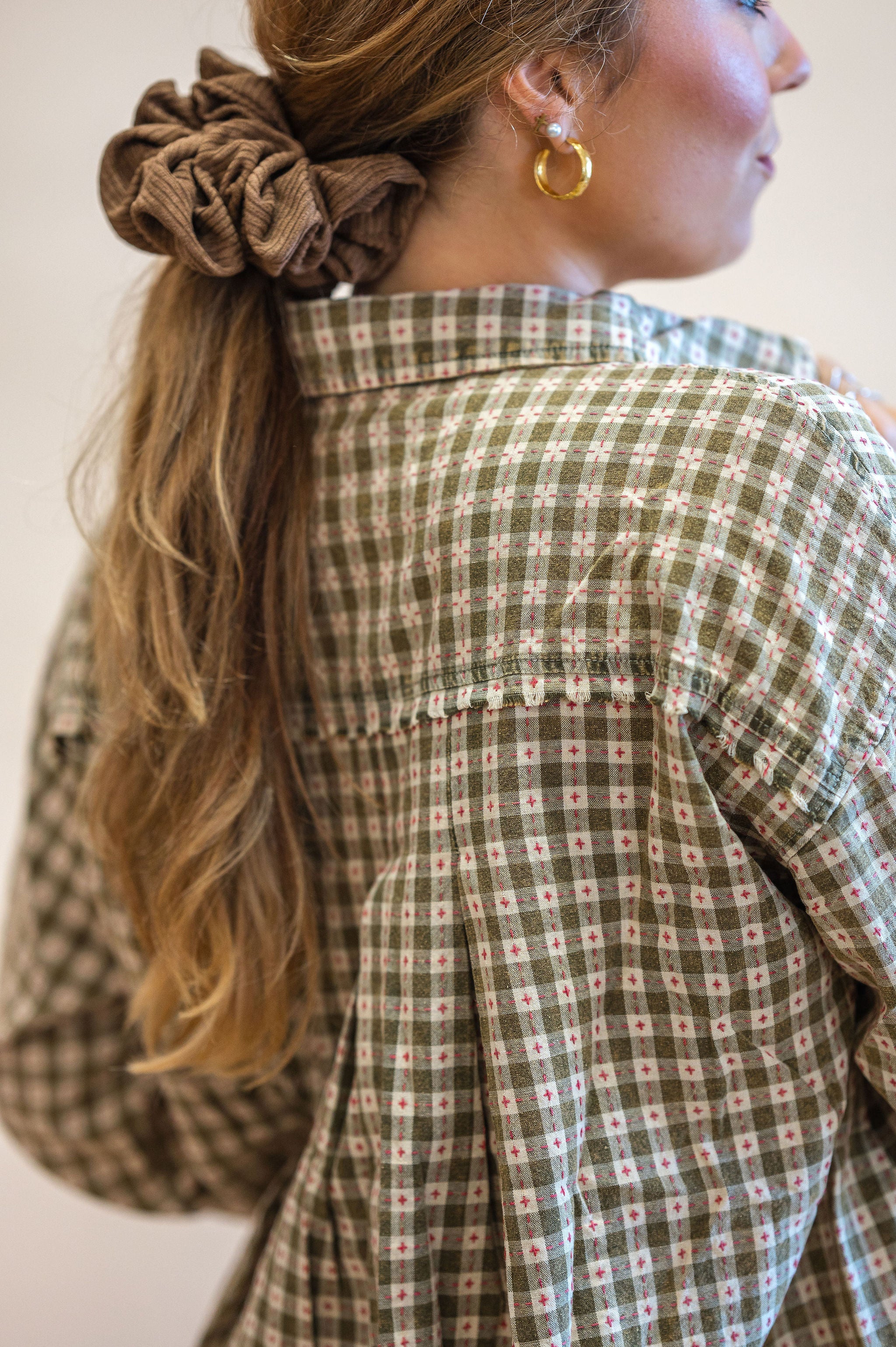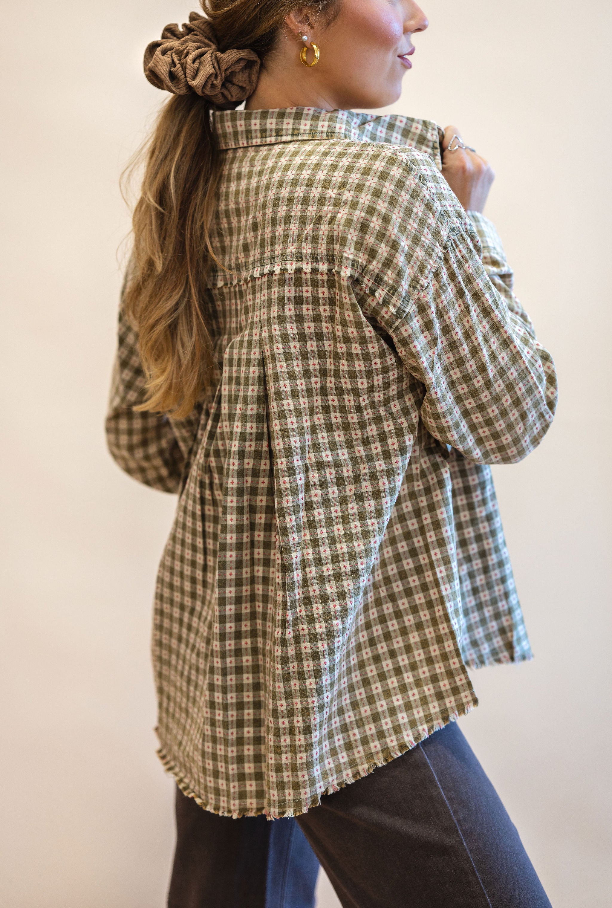Capture the essence of fall with the Scarecrow Season Flannel Shirt. This flowy, button-down flannel features a delightful gingham pattern in soft sage, cream, and pink hues. Perfectly cute and cozy, it’s an easy choice for chilly days when you want to feel playful and stylish.