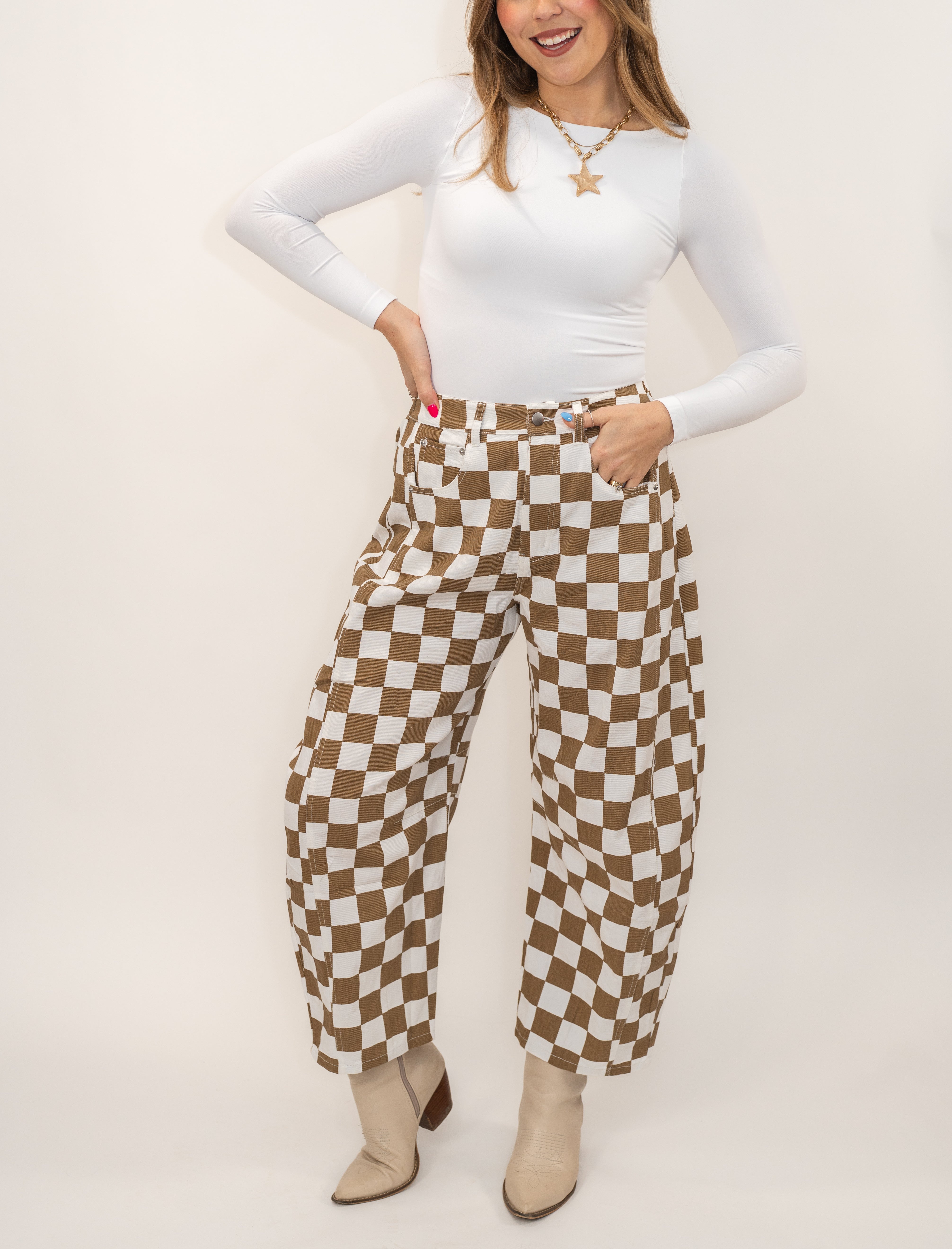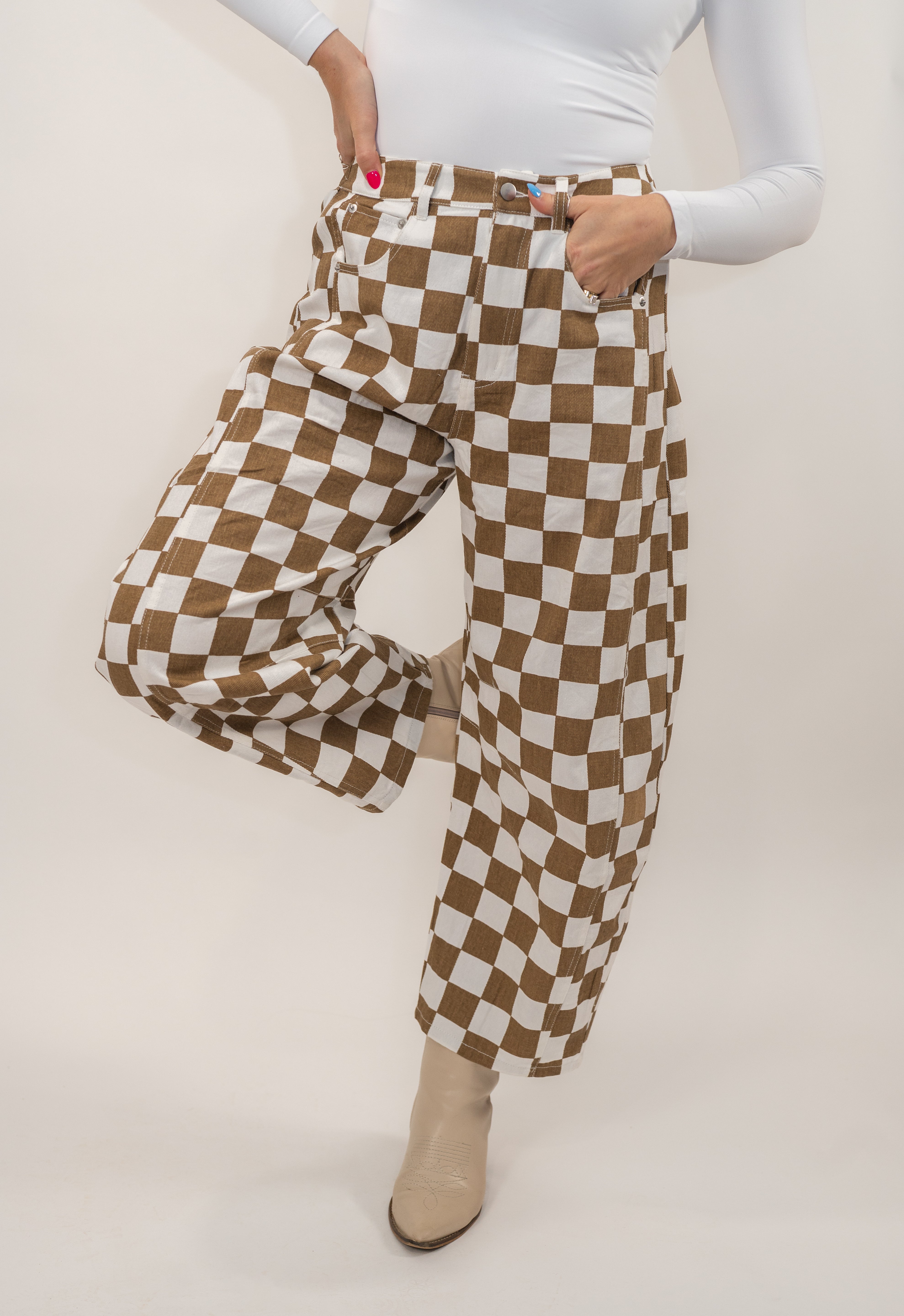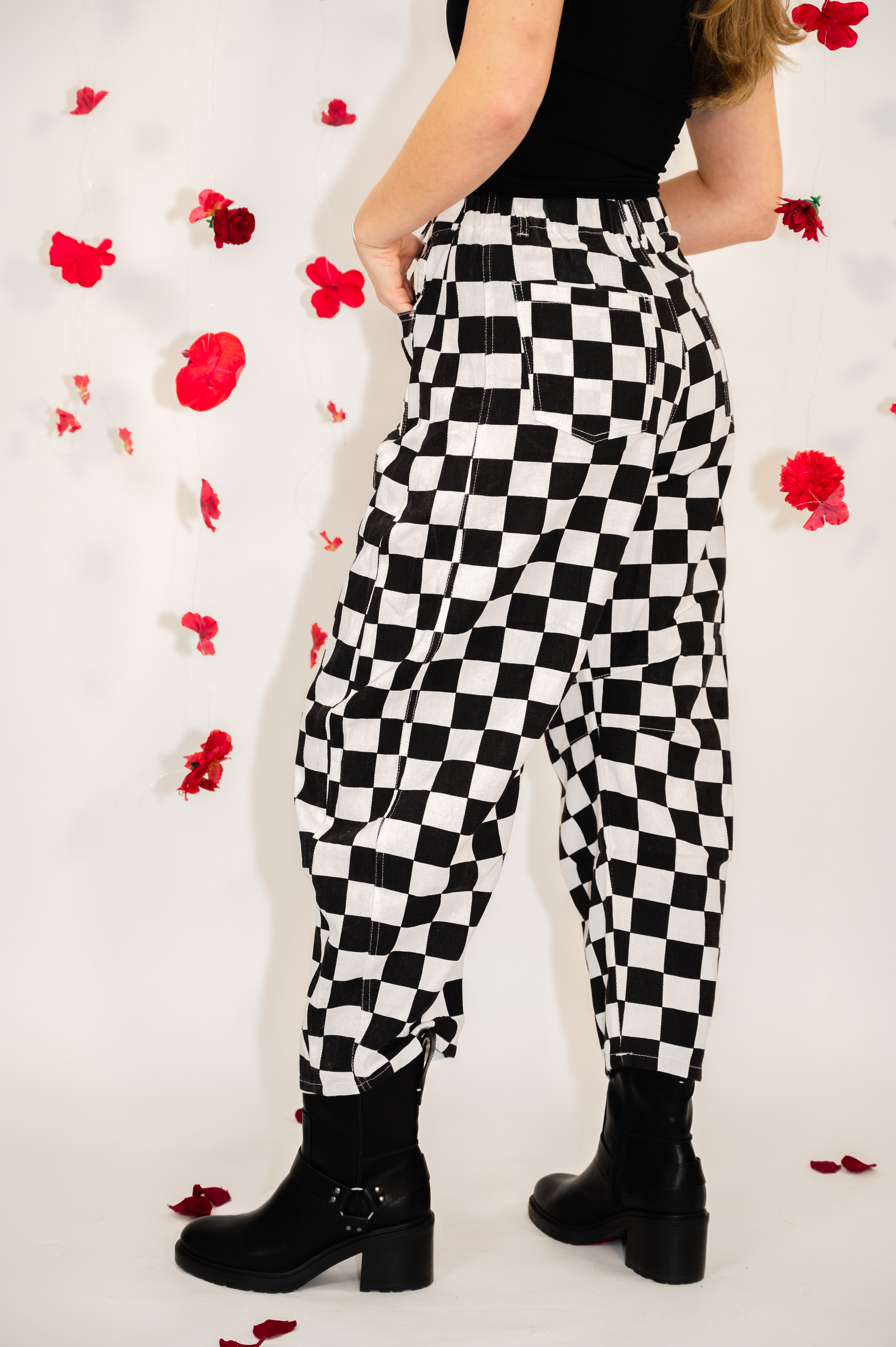 Rock a fun, coordinated look with these checkered printed barrel denim pants—perfect for matching moments with your little one. The playful pattern brings personality to any outfit, while the elastic waistband keeps comfort front and center. Whether you're heading out for a casual day or creating adorable mommy-and-me memories, these pants deliver style that's as easygoing as it is cute.