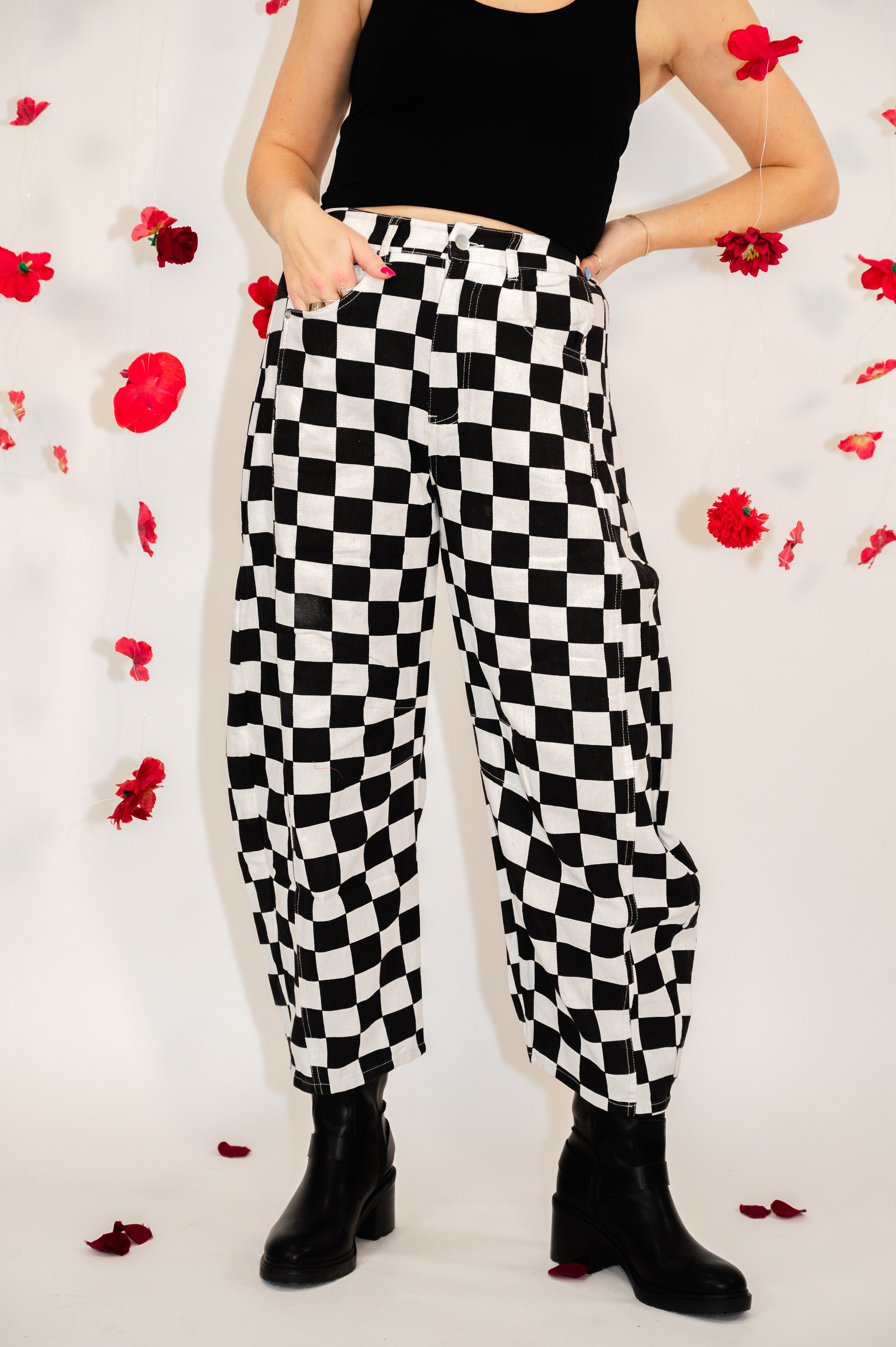 Checkered Printed Barrel Denim Pants