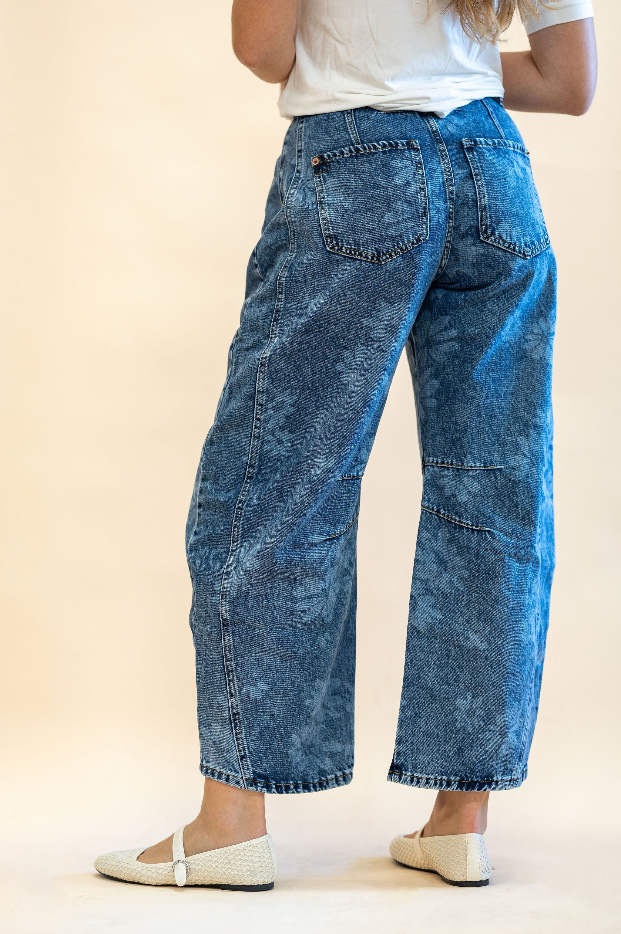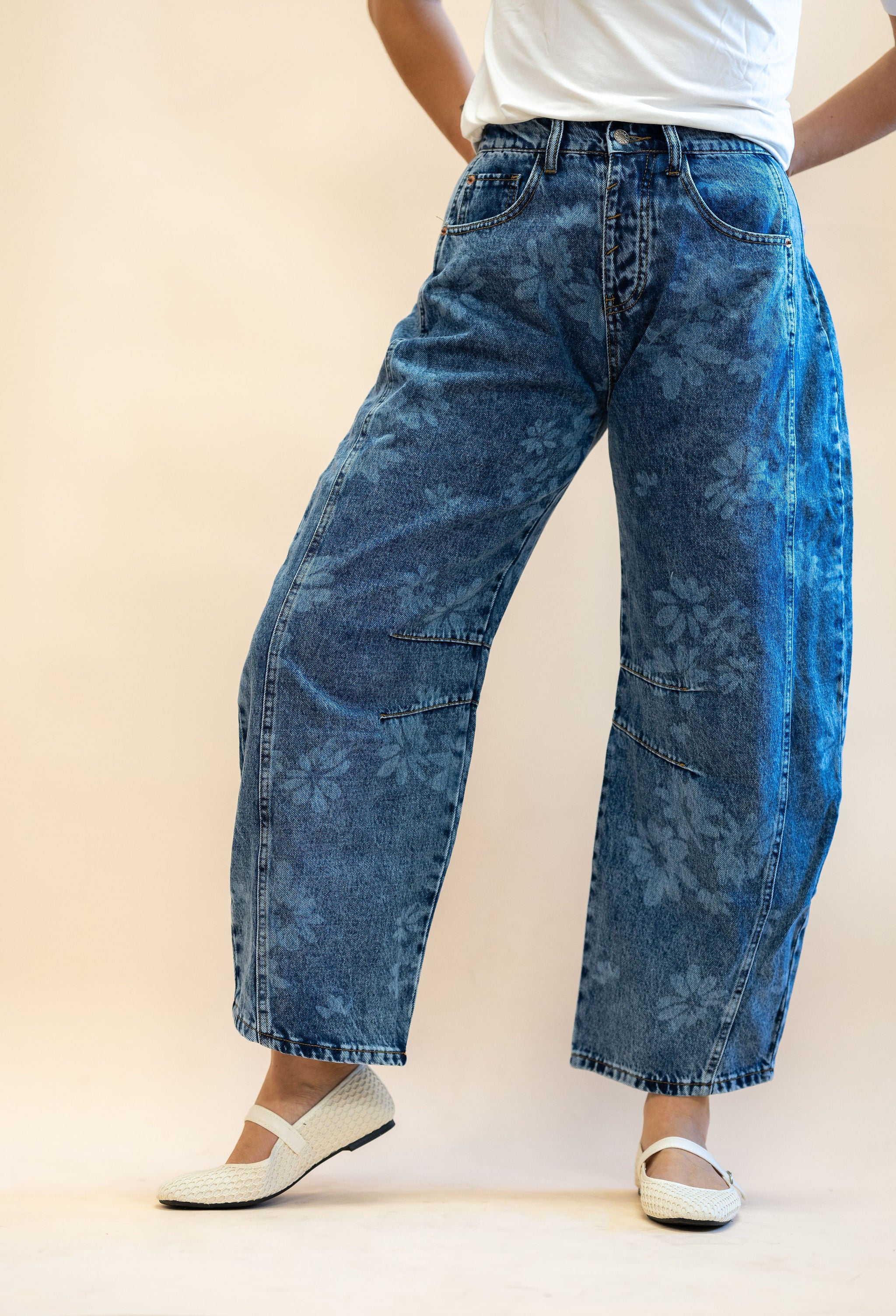 These Denim Washed Floral Print Barrel Jeans bring a playful twist to classic denim with their vibrant floral bleach pattern. Featuring a relaxed, loose fit and a unique barrel-leg silhouette, they offer both comfort and style. The high/mid-rise and roomy, curved legs provide freedom to move, while four practical pockets add utility. Perfect for creating a casual boho-chic look, pair them with an oversized sweatshirt and slip-on sandals for effortless flair. Add this fun, artful piece to your denim collection for a fresh, bold statement.