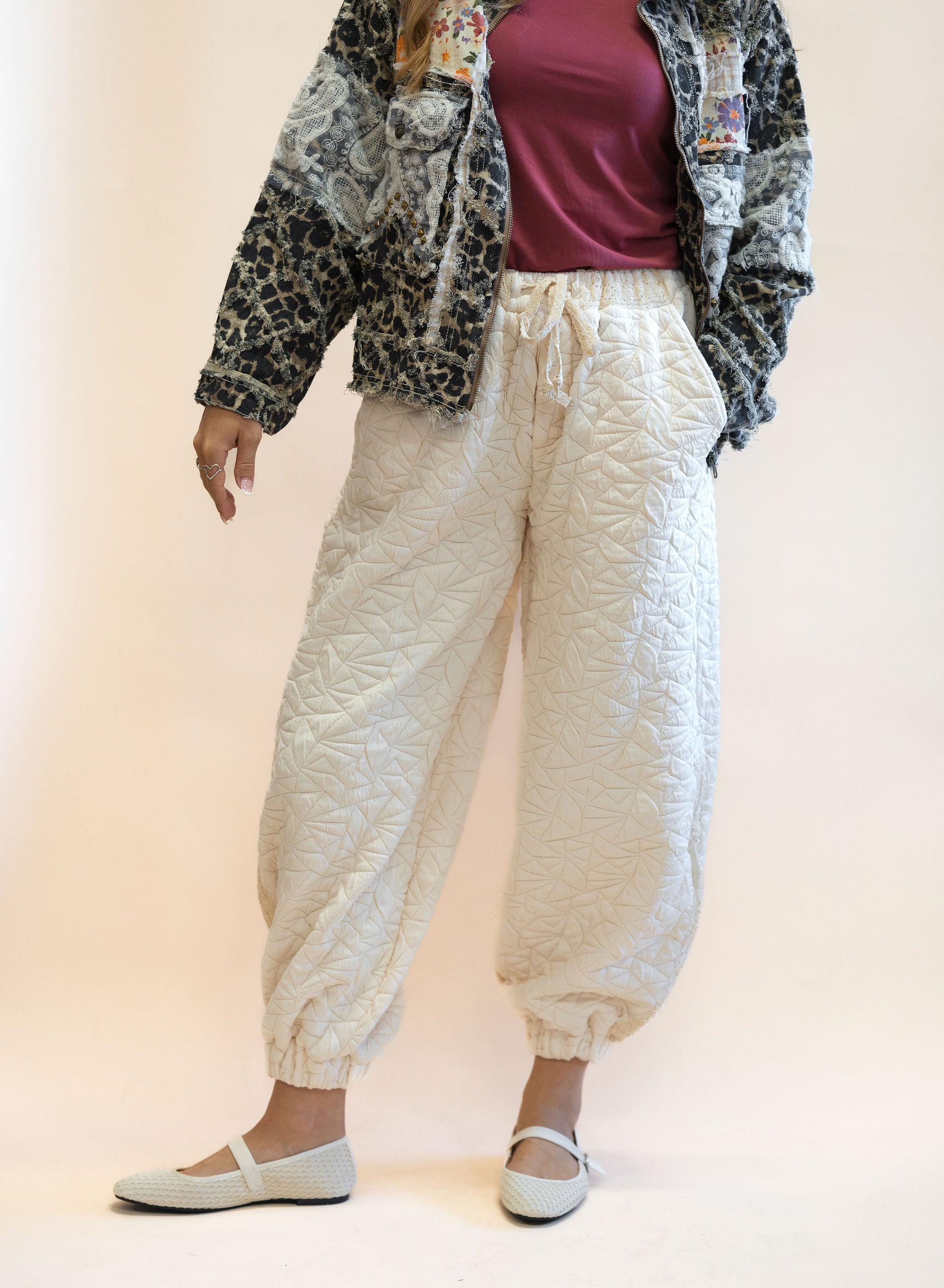 Stay comfy and cute in these POL Cream Quilted Balloon Pants. These playful joggers feature a cozy quilted texture and a fun balloon shape that adds extra flair. The elastic drawstring waist lets you find the perfect fit, making them ideal for relaxed days or casual adventures.