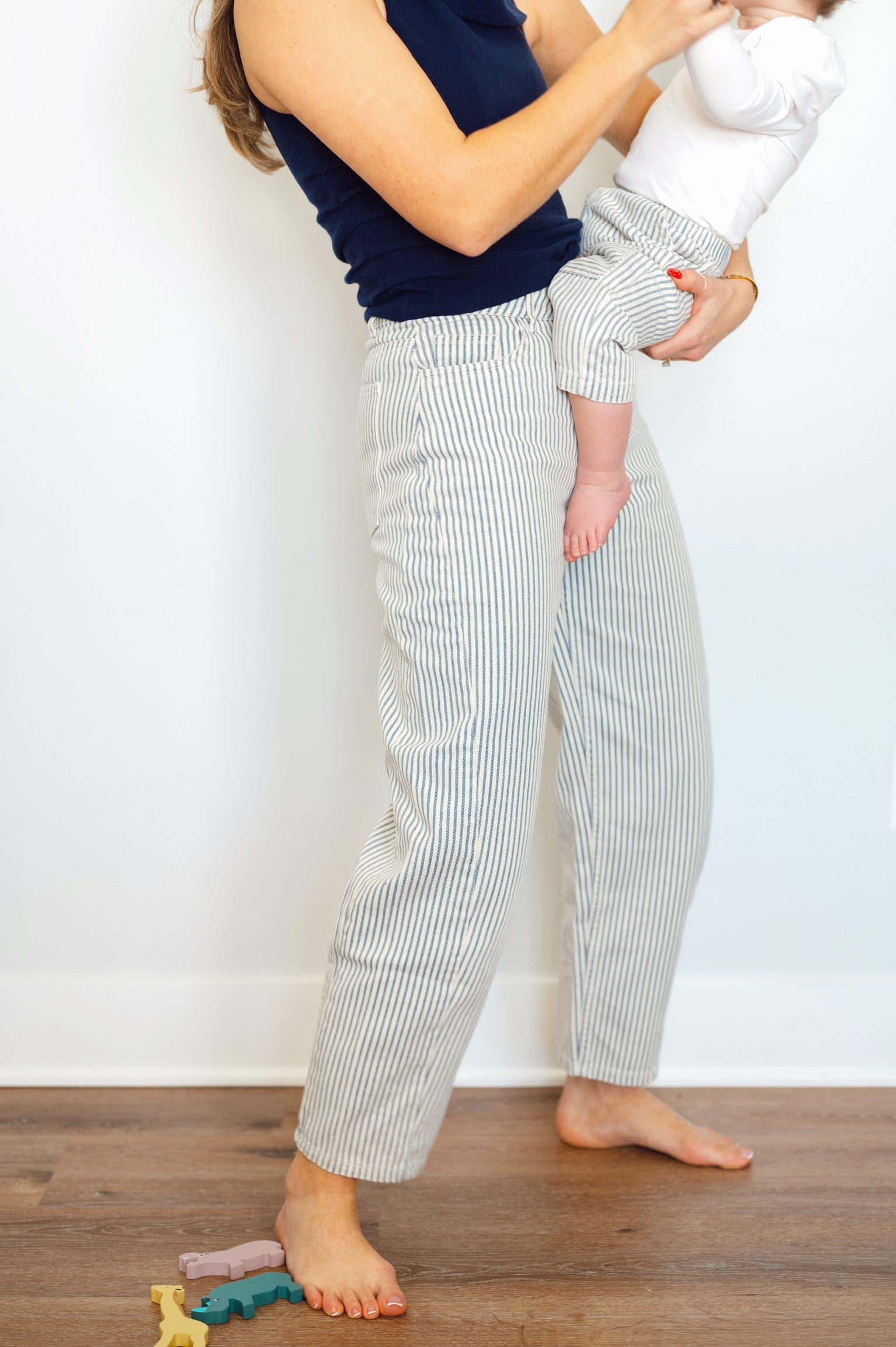 Introducing Rylee + Cru's Barrel Pants in Natural—the relaxed-fit essential that works as hard as you do. With a flattering high-rise cut and that signature railroad stripe print, these natural denim pants deliver comfort without compromise. Bonus: coordinate yours with your little one's for matching moments that'll make you smile. Effortless style, all day long.