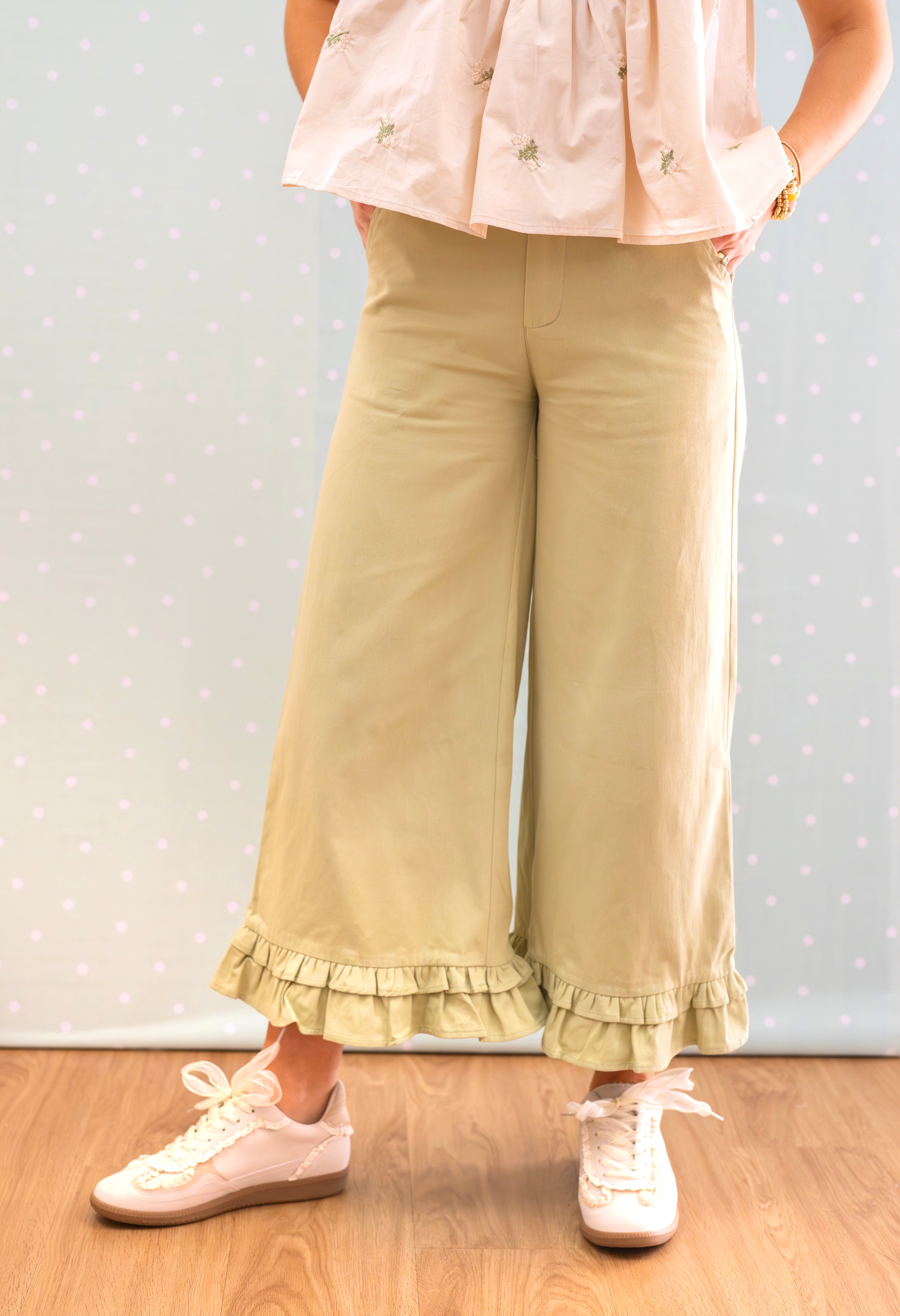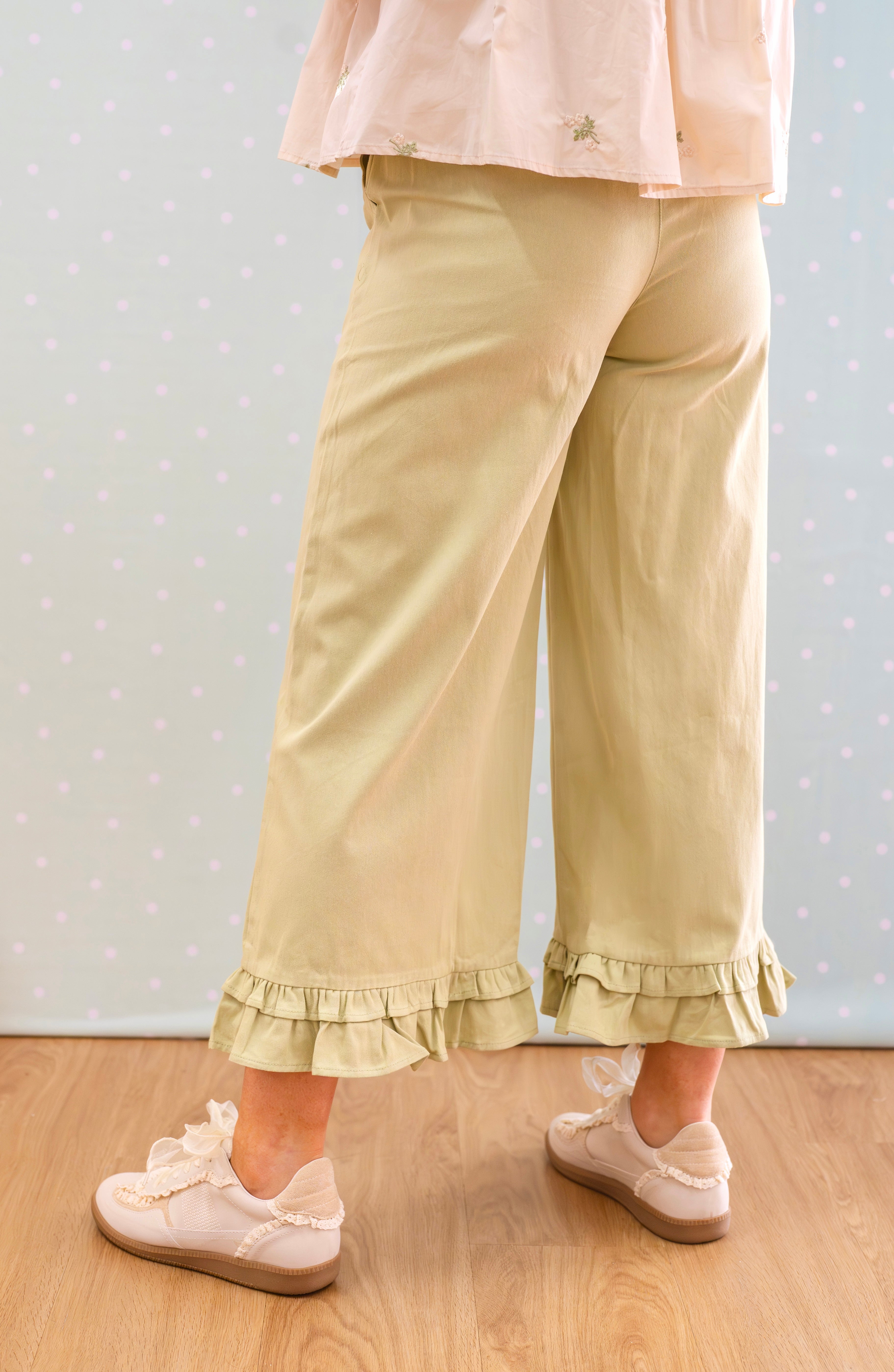 Spin through your day in style with these wide-leg twill pants featuring a charming double ruffle hem in soft ecru cream. Effortlessly versatile, they transition seamlessly from the office to weekend adventures—dress them up with heels or keep it casual with sneakers. A playful staple that works as hard as you do.