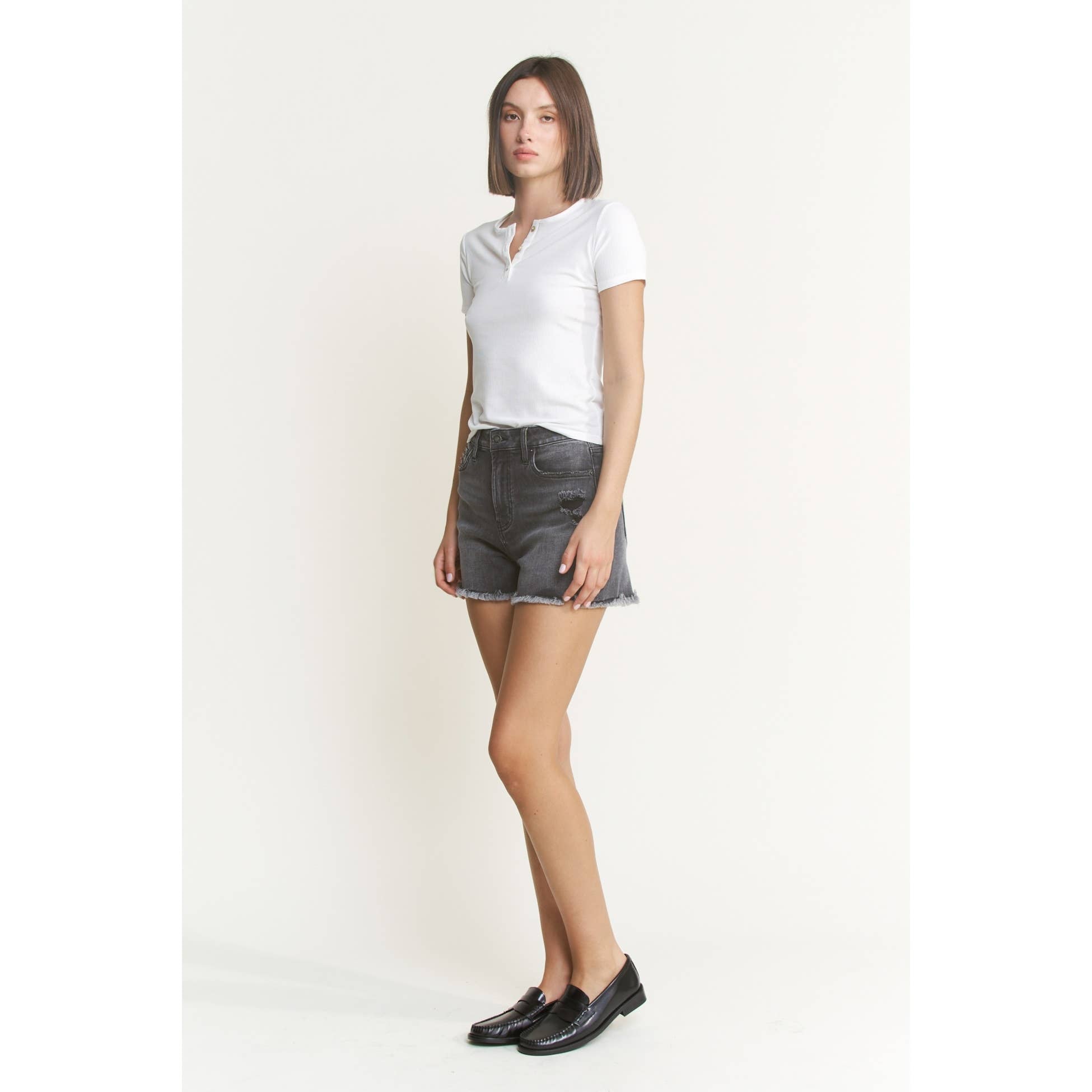 Mica Super High Rise Distressed Shorts: Washed Black