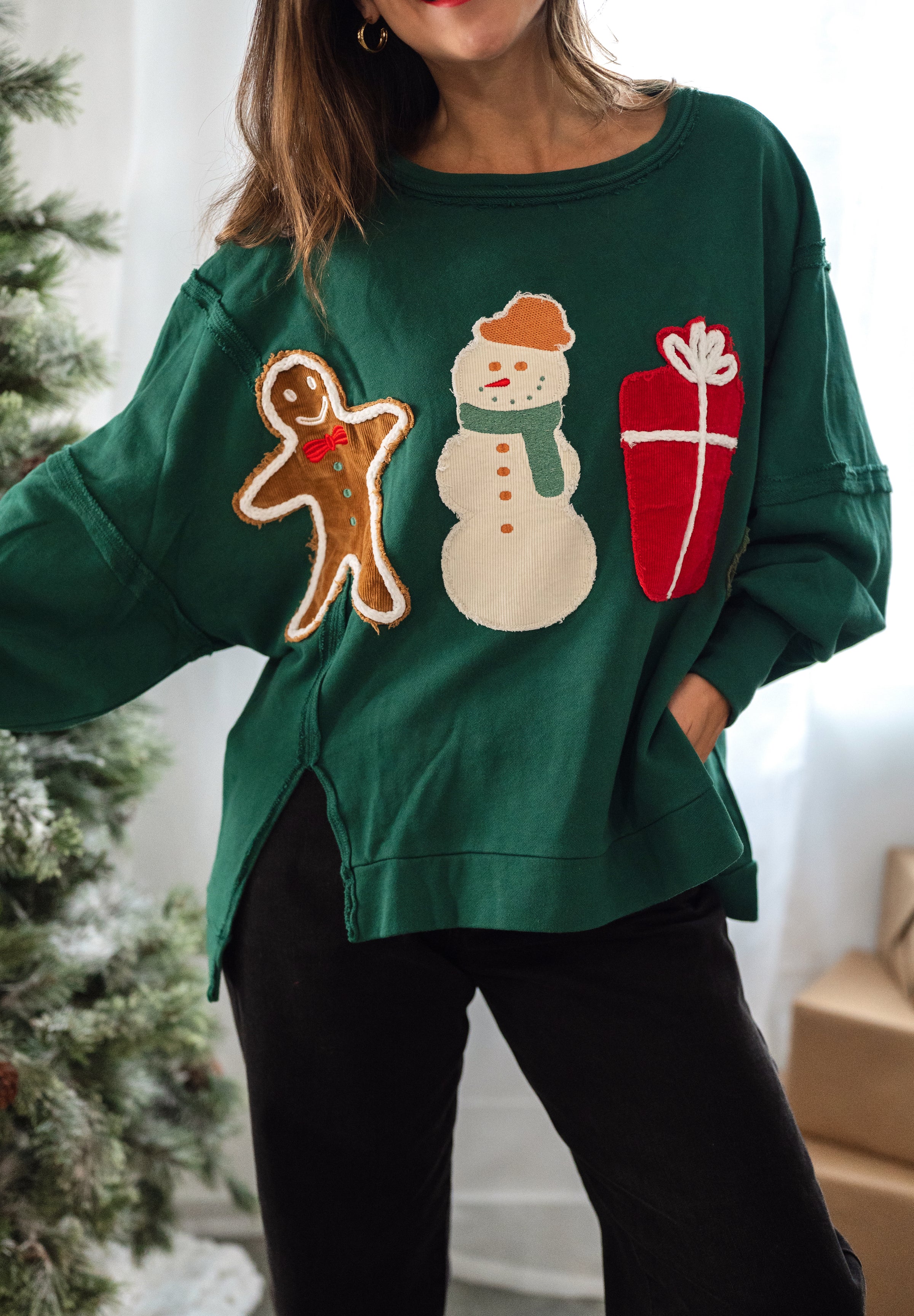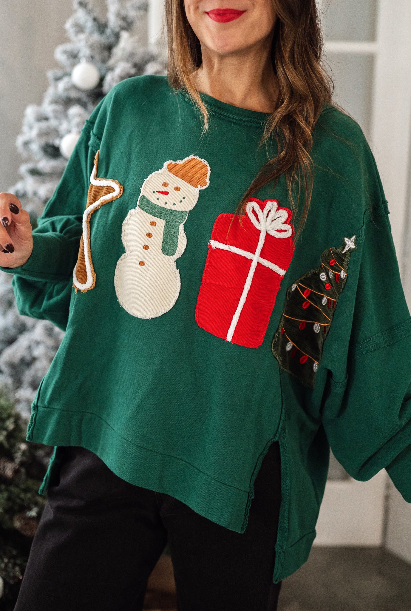 Deck yourself out in festive flair with this playful crewneck sweatshirt featuring charming corduroy Christmas patches. The cozy French terry fabric keeps things comfortable while the high-low hem adds a fun twist to the classic silhouette. Long sleeves and a round neckline complete this holiday-ready essential that's perfect for spreading seasonal cheer in style.