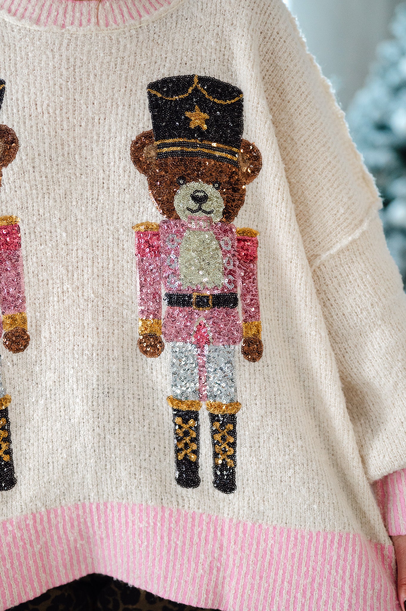 Get festive with this playful sweater featuring adorable sequin bear nutcracker details that shimmer and shine. The two-tone ribbed knit construction adds visual interest, while the textured bumpy knit keeps things cozy and fun. Complete with a classic round neckline and long sleeves, it's the perfect holiday statement piece that brings whimsy and warmth together.