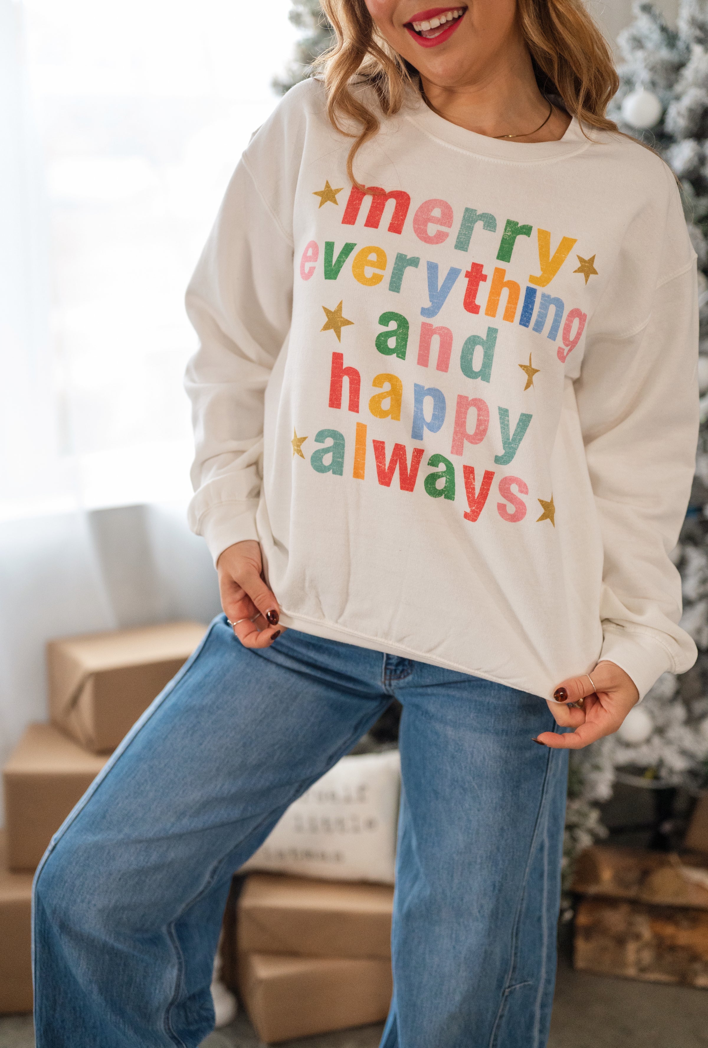 Celebrate every moment with the Merry Everything and Happy Always crewneck! Crafted from premium cotton, this graphic sweatshirt blends cozy comfort with stylish vibes. Featuring unisex sizing and a timeless fit, it’s perfect for spreading cheer all year round.