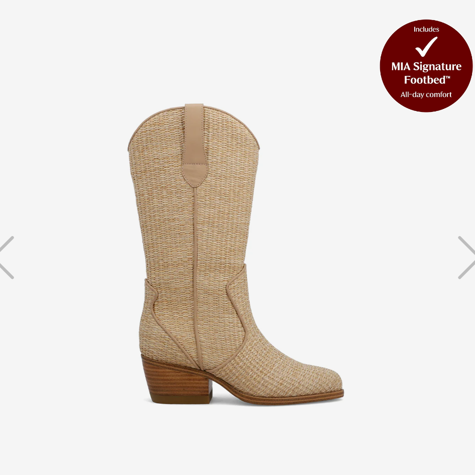 Step into festival season with our MIA Jenah Raffia Cowgirl Boot! This sassy little number blends boho vibes with western kick, featuring unique raffia and leather detailing that's begging to be shown off. The comfy 2.2-inch heel and signature MIA footbed keep you dancing all day, while perfectly complementing your favorite raffia accessories. Your feet just found their new festival bestie!