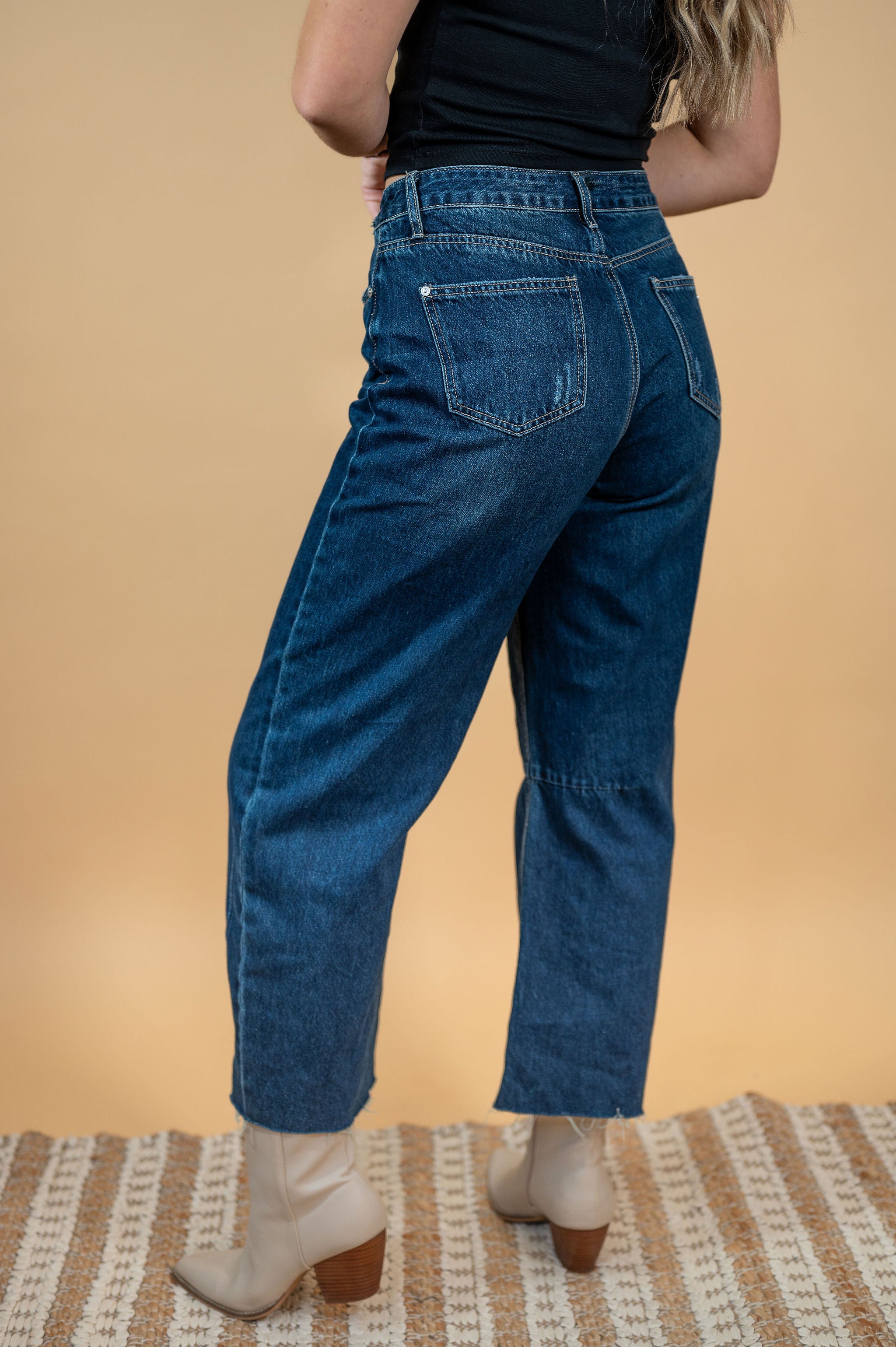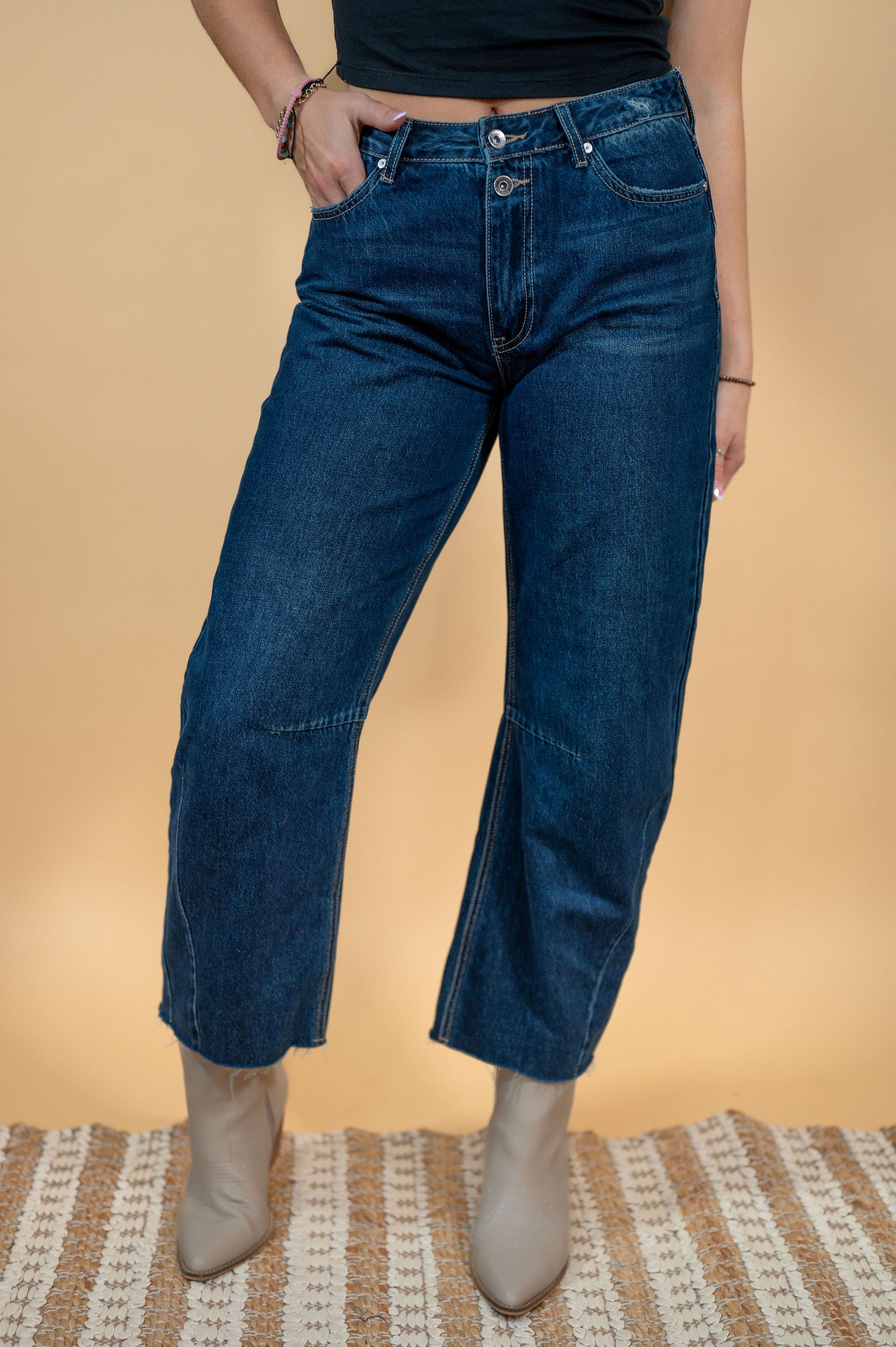 Be cool and chic in our Piper High Rise Vintage Dark Wash Barrel Jean. The barrel jean (horseshoe) cut is so on trend. With a non-stretch fit, double button and zipper fly, these cropped jeans feature a raw hem for a touch of boho flair. Perfectly high-waisted, these jeans are the ultimate vintage must-have. (Be the envy of all your friends, trust us!