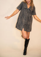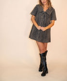 Rock a bold look with this leopard-printed denim mini dress that's equal parts fun and flirty. The classic collar and tie-front detail add personality to an easy-wearing silhouette that's perfect for casual outings or dressed-up occasions. With its relaxed fit and eye-catching animal print, this piece is your go-to for making a statement without trying too hard.