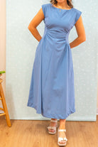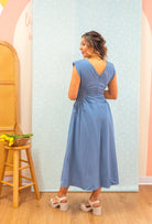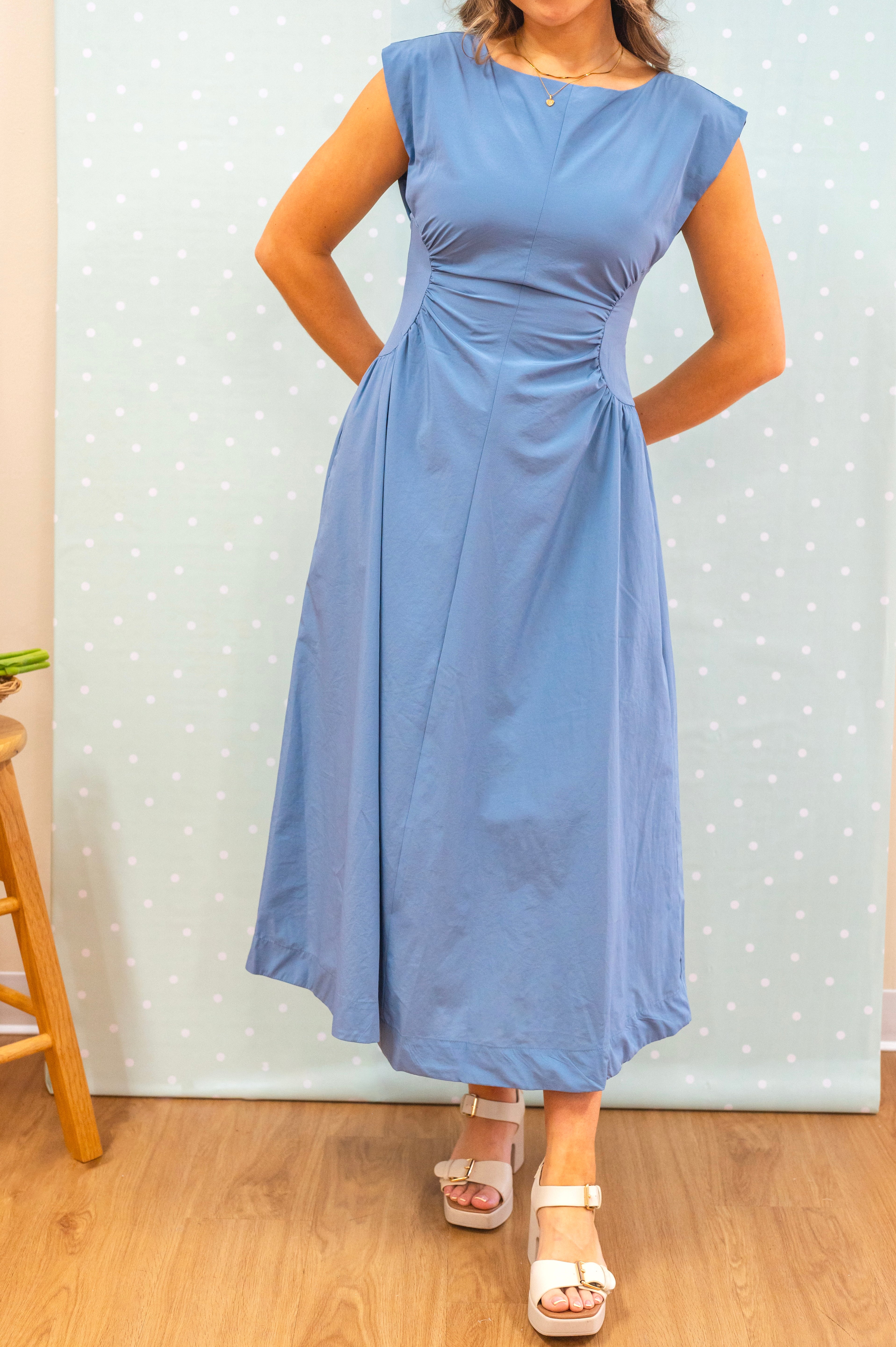 Meet your new favorite dress! This midi dress features a flattering silhouette with sculpted side panels that hug you just right, paired with a sweet round neckline and surprise V-neck back detail. Wrapped in the most gorgeous soft dusty blue, it's the kind of piece that feels both cute and sophisticated. Style it with sandals for weekend vibes, slip-ons for casual errands, or heels when you want to turn heads—this dress does it all with playful charm.