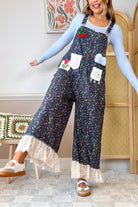 Embrace your fun side in these precious wide-leg overalls, decked out with delicate lace ruffles, artisan patch embellishments, practical front pockets, and customizable straps for effortless charm.