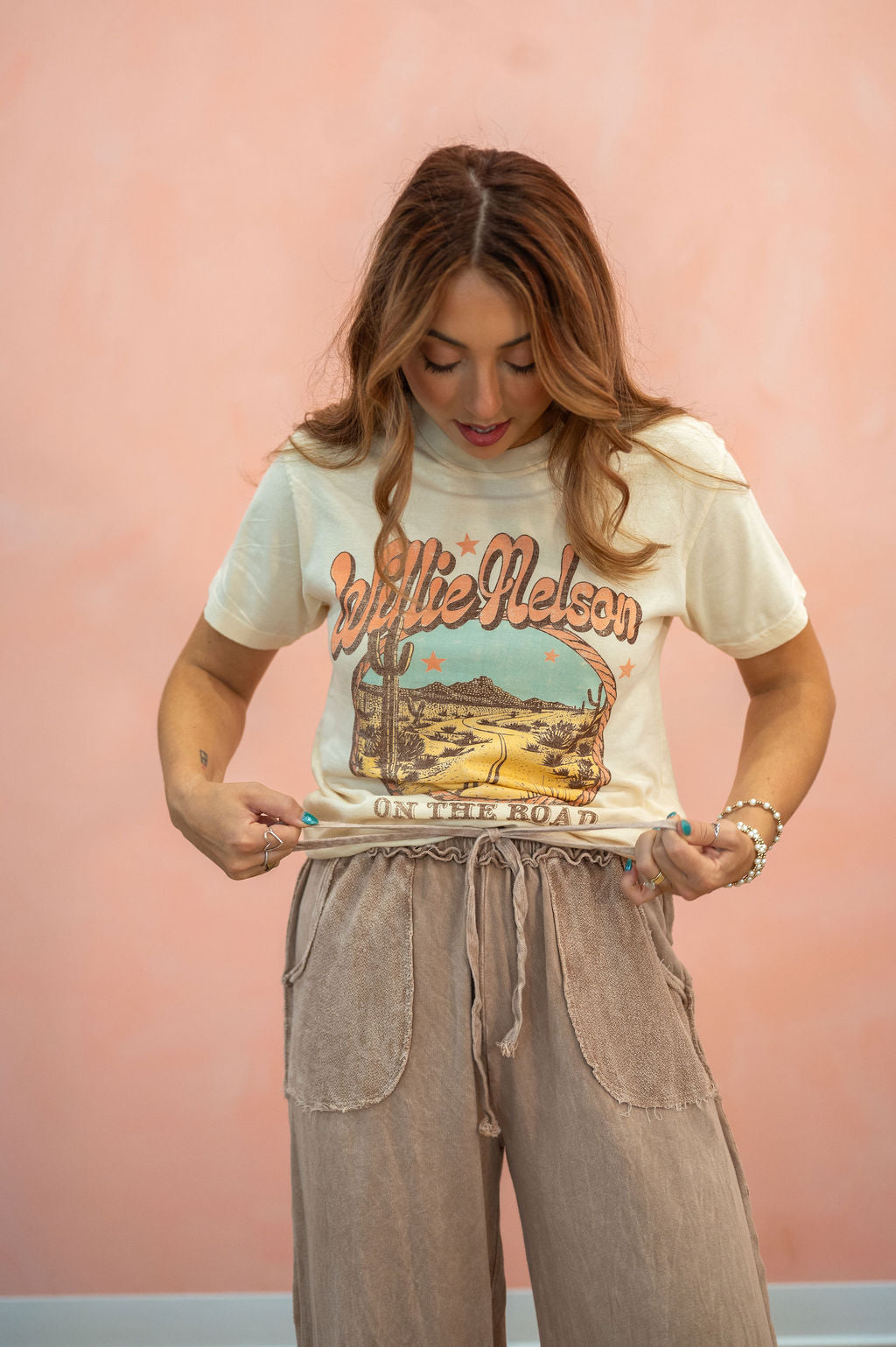 Hit the road in style with the Willie Nelson On the Road Again Tee! Crafted from 100% super soft cotton, this unisex tee keeps you comfy whether you're jamming out or just kicking back. Perfect for fans who want to wear a classic tune on their sleeve—literally.