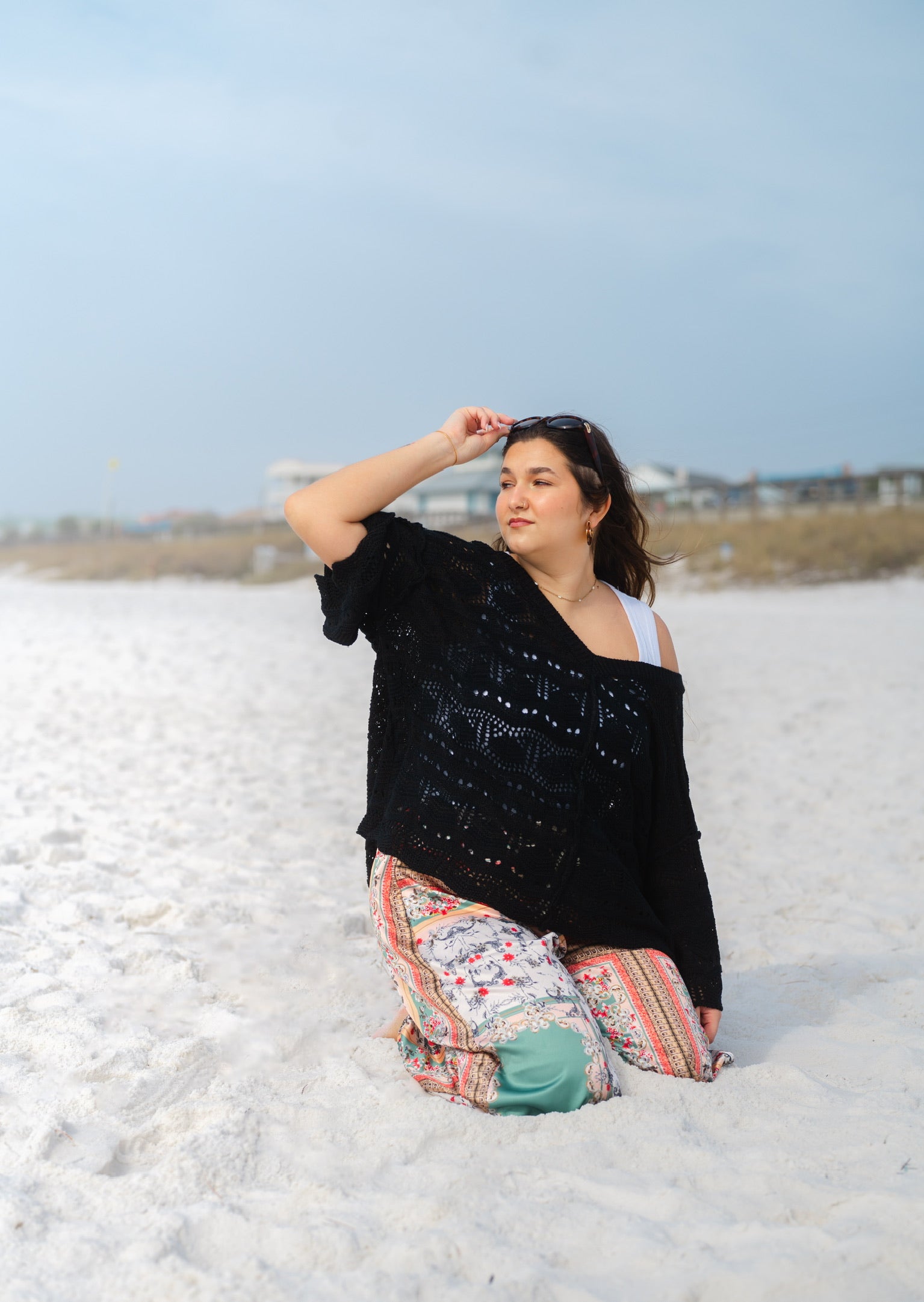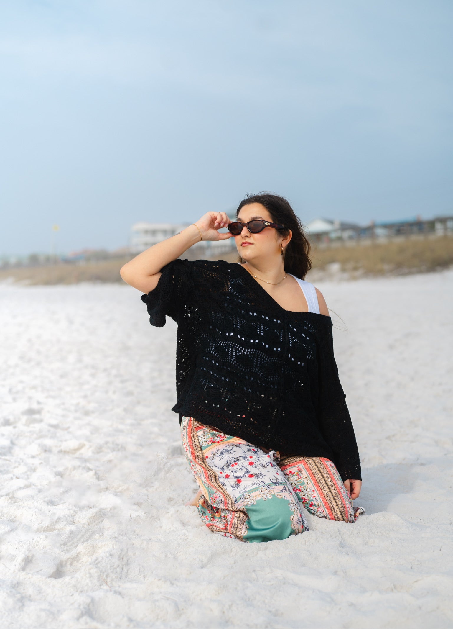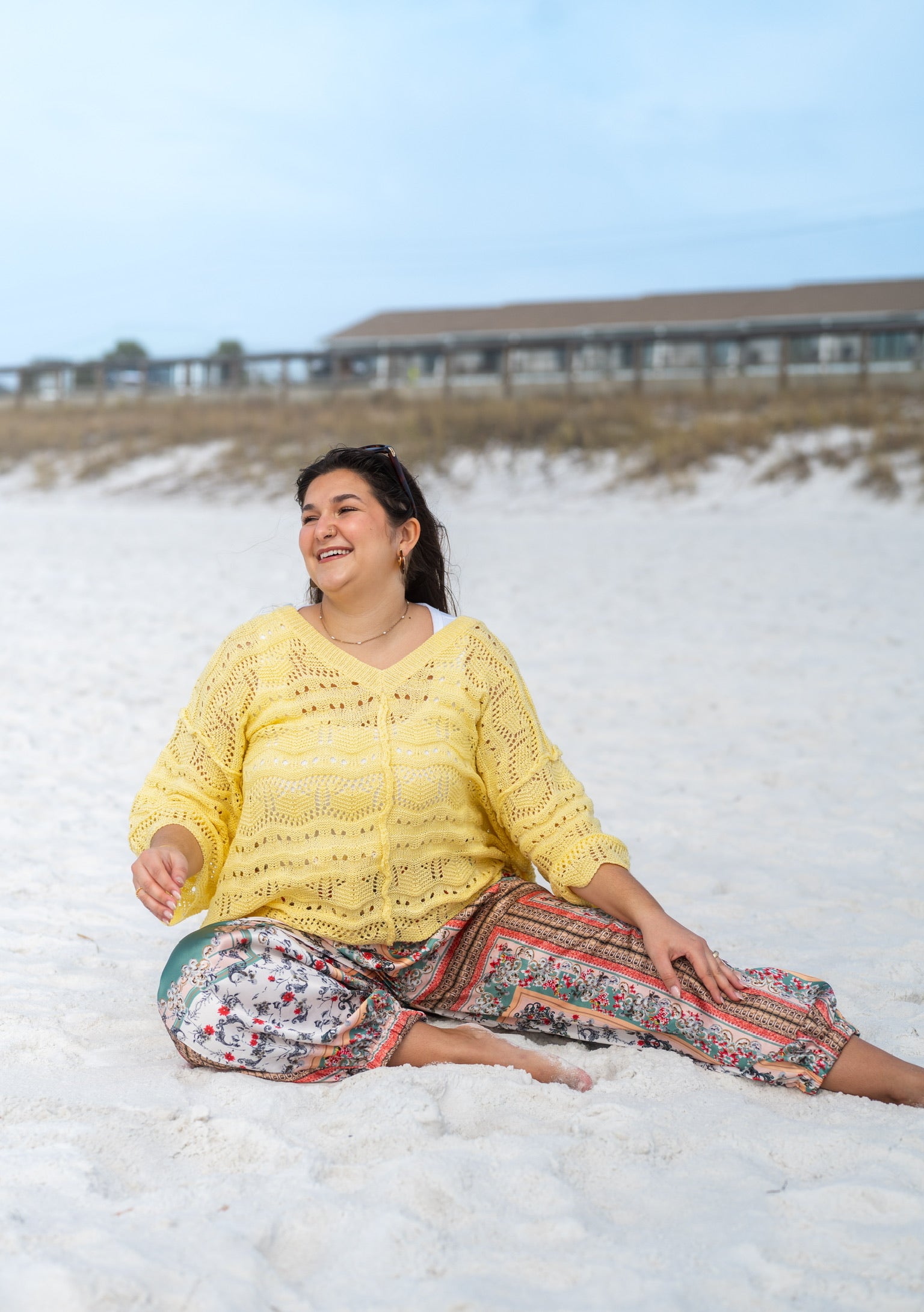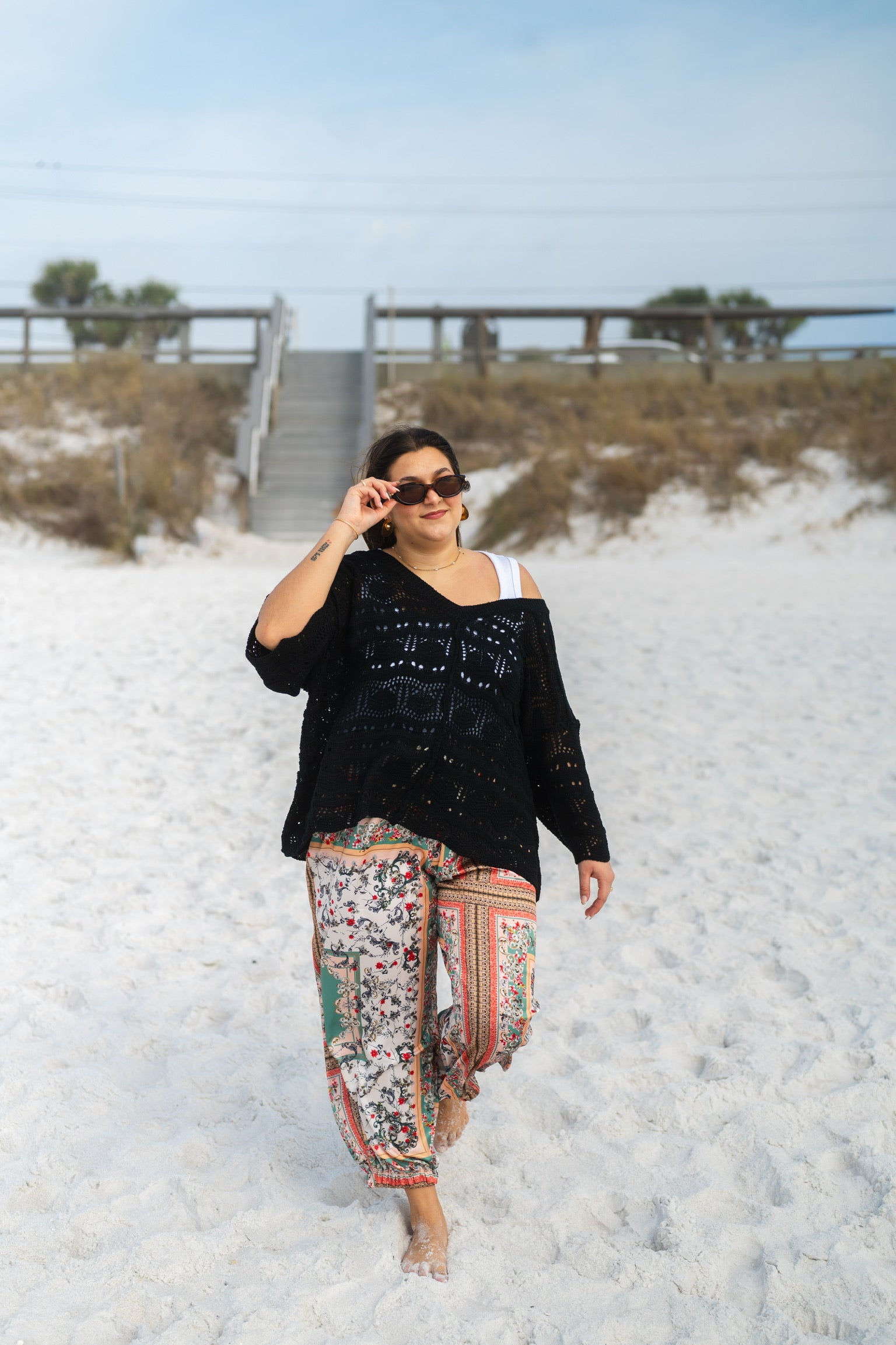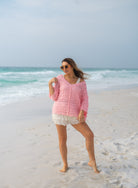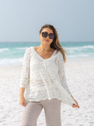 Throw on this oversized crochet-knit sweater for effortless layering that takes you from spring through fall. The relaxed fit and delicate V-neckline make it perfect as a lightweight tank or rock-style coverup—dress it up or down depending on your vibe. Three-quarter sleeves keep things breezy without sacrificing warmth, while the airy knit construction ensures you'll stay comfortable all season long.