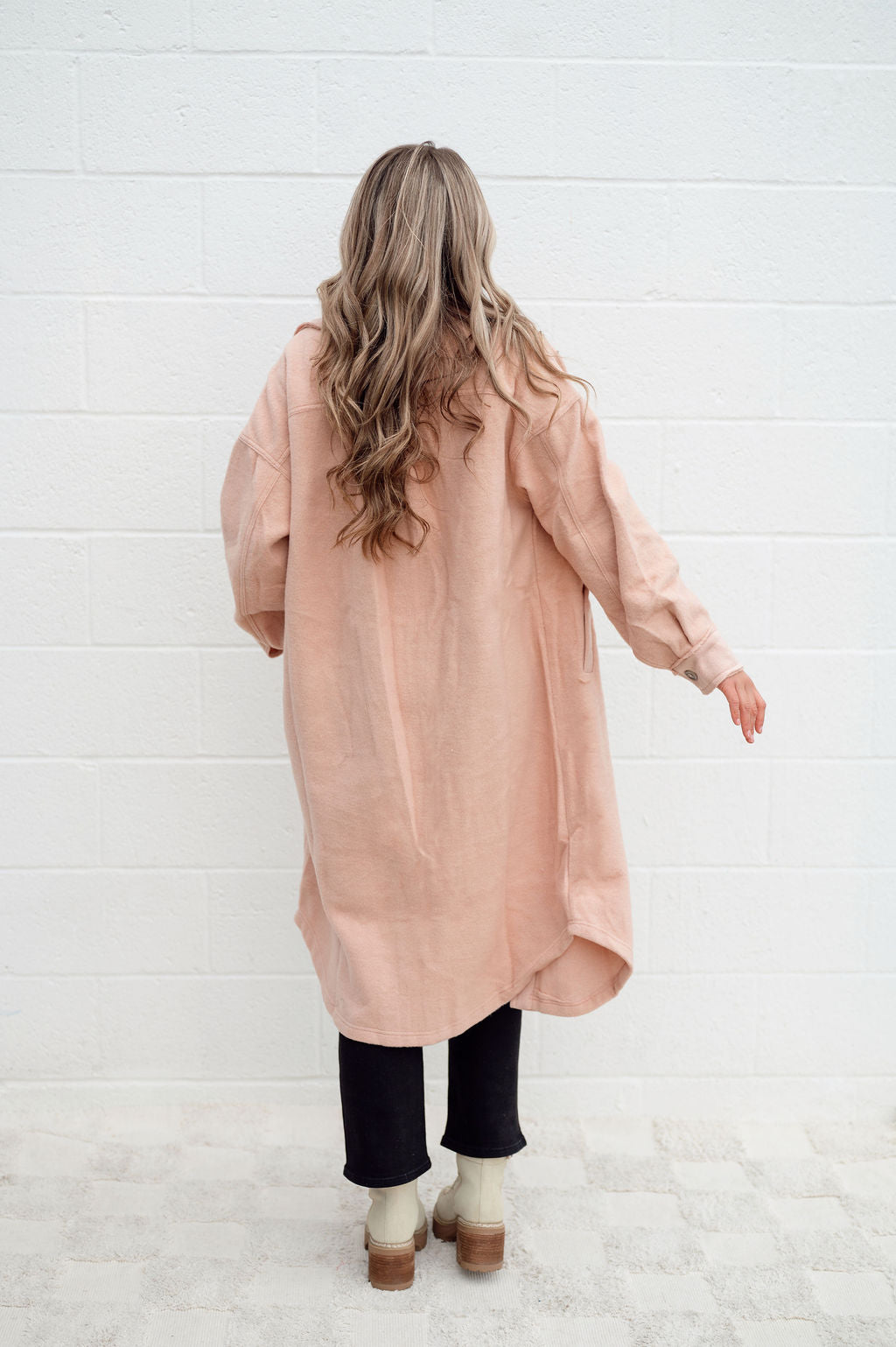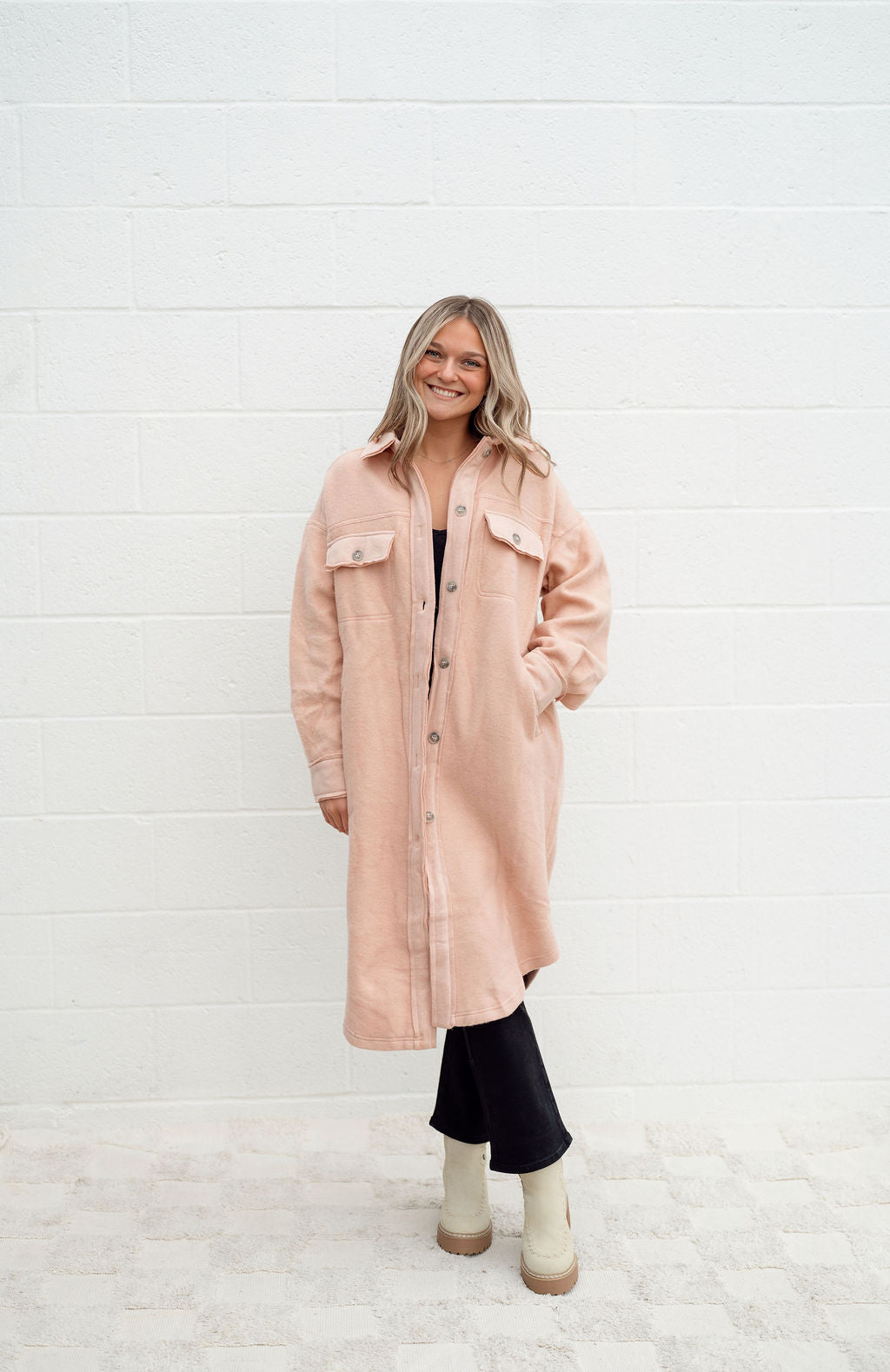Meet your new favorite layering piece—a pink button-down shacket that's equal parts cozy and cute. With long sleeves, practical side pockets, and an extended length, it's designed to keep you warm while looking effortlessly put-together. Whether you're running errands or grabbing coffee, this versatile shacket is ready for anything.