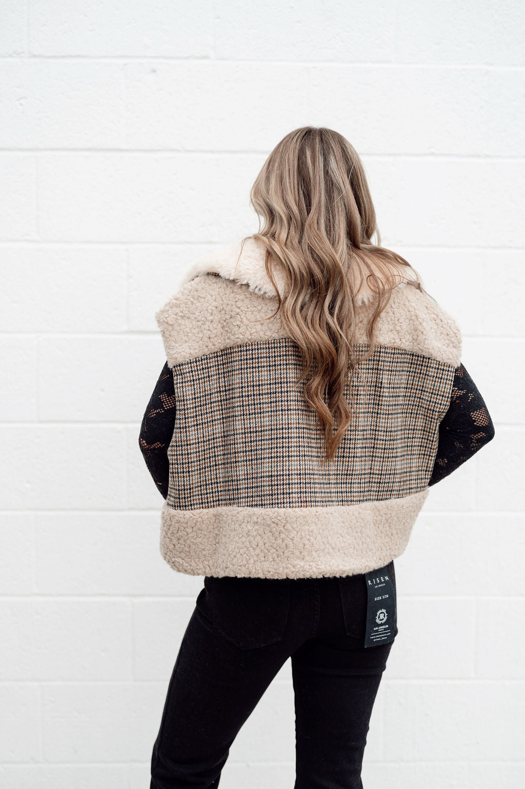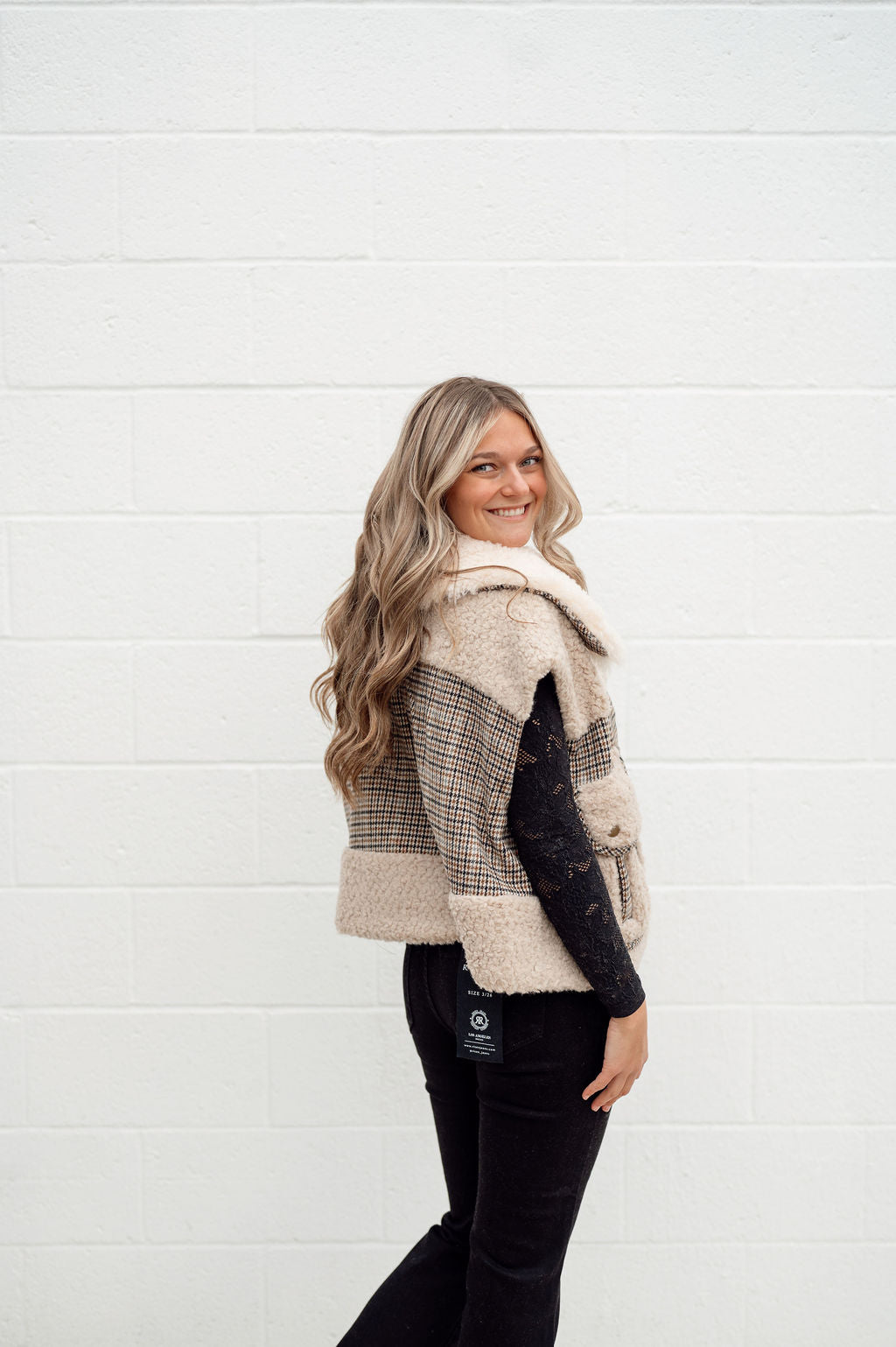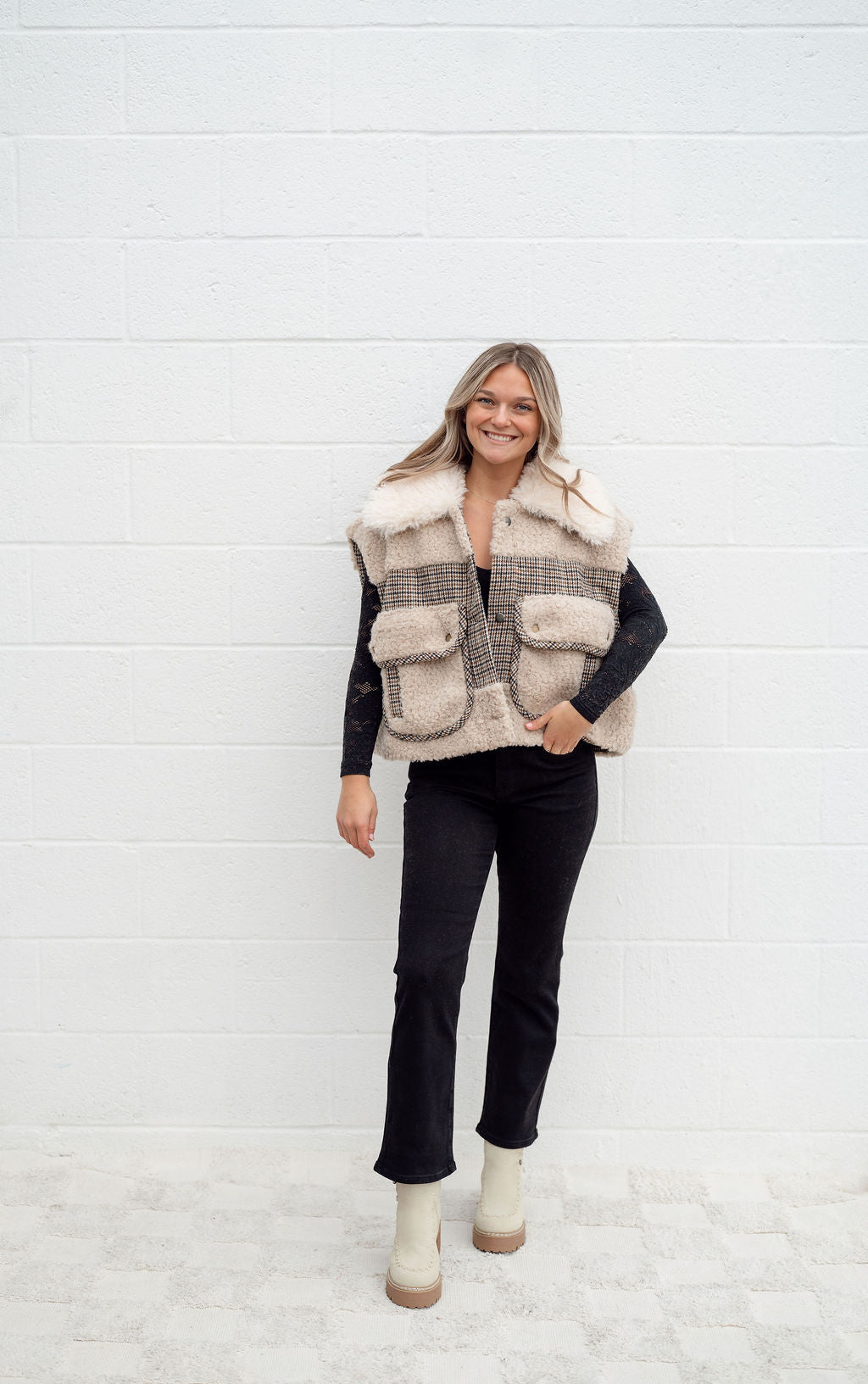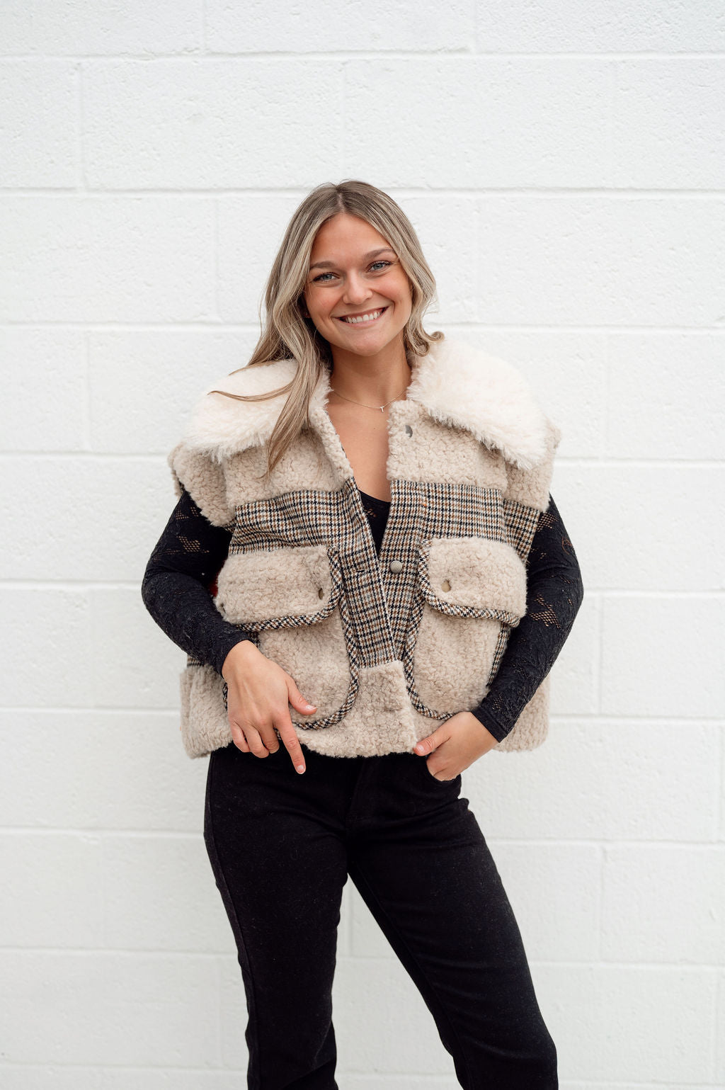 Slip into this plaid sherpa cropped vest and instantly feel like you've got your style figured out. The mineral wash finish delivers that coveted vintage-cool aesthetic, while the relaxed, easy-going cut keeps comfort front and center. Wrapped in buttery-soft sherpa with a fuzzy fur collar that's almost too cute, this vest is basically a hug you can wear. Handy front pockets keep your essentials within reach, and the cropped length works magic over everything from fitted basics to oversized layers. One vest, infinite outfit possibilities.