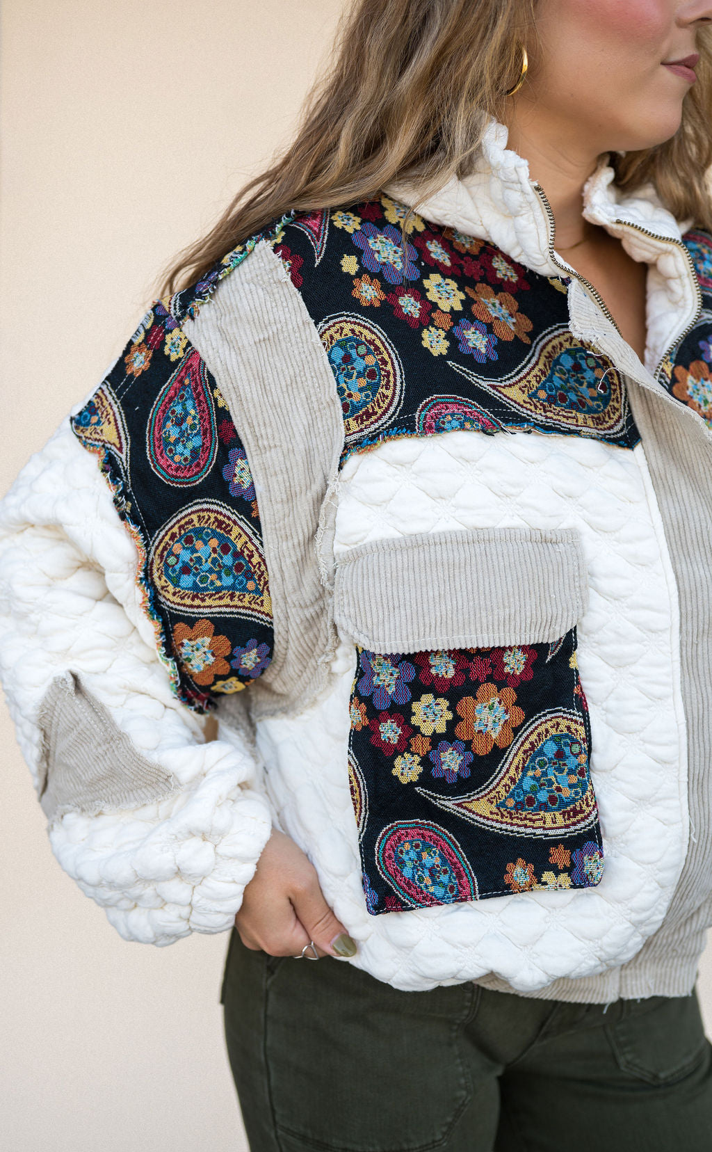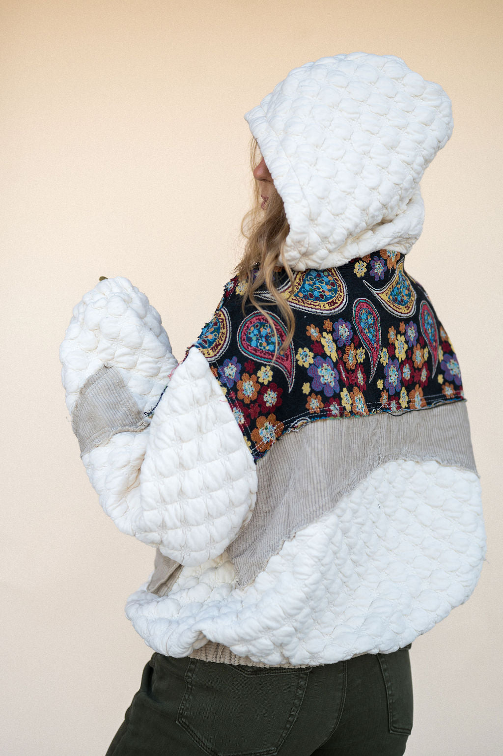 Embrace cozy vibes this fall with the POL Patch and Poetry Zip-Up Hoodie. Featuring charming patchwork and soft corduroy details, this hoodie brings a playful boho twist with its high neck and balloon sleeves. The zip-up design makes it easy to layer for crisp days, while the hood adds extra warmth and style. Perfect for staying cute and comfortable all season long.