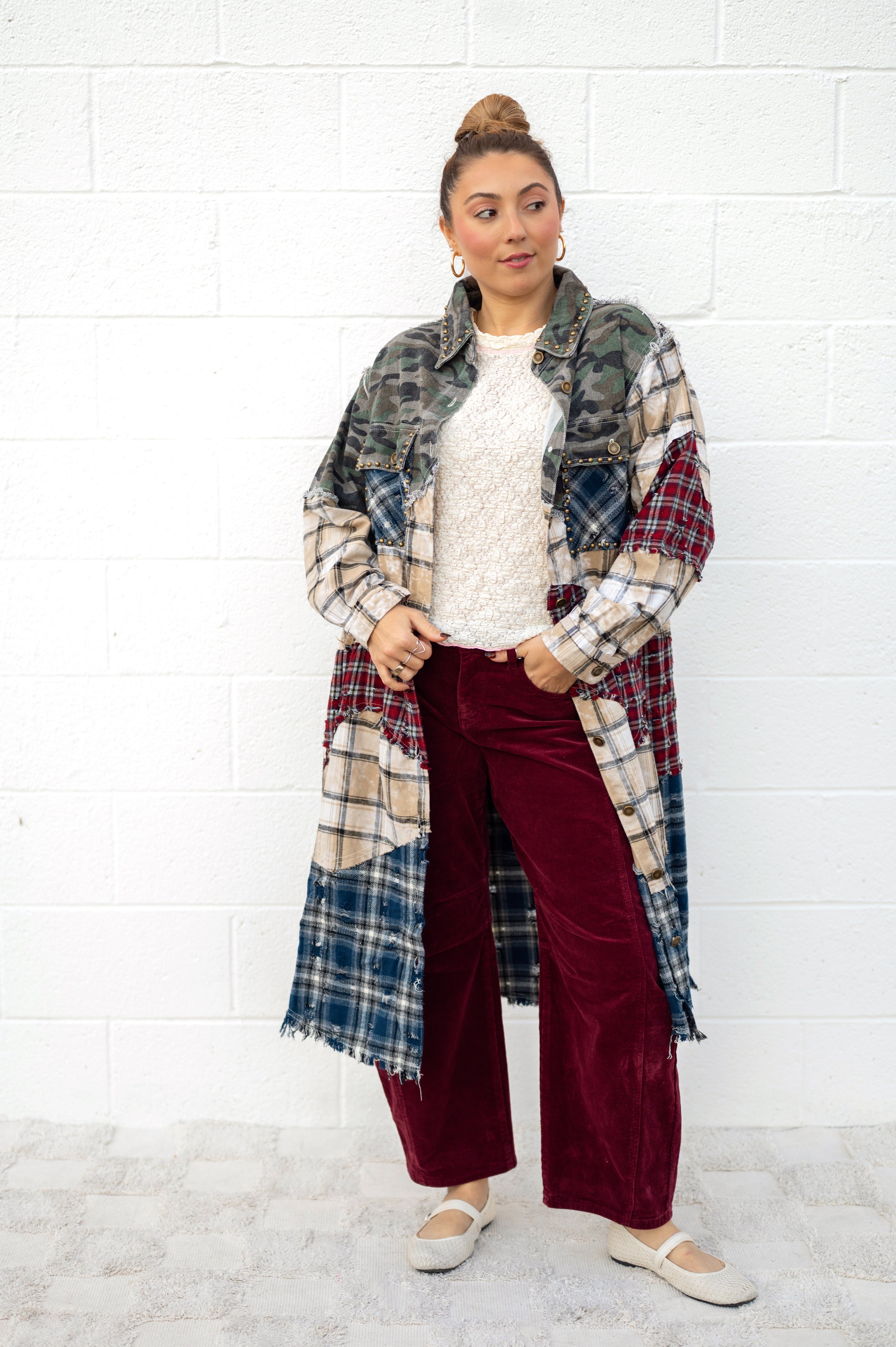 Embrace your inner free spirit with this POL Multi Camo Kimono Flannel—where edgy meets effortless. Featuring a relaxed, flowy silhouette perfect for layering, this long-sleeve stunner blends flannel and camo prints in a patchwork design that's anything but ordinary. Dual flap patch pockets keep your essentials close while studded accents and novelty details add that perfect boho-funky edge. Whether you're channeling laid-back vibes or making a bold statement, this piece is your new go-to for cute, unconventional style that refuses to blend in.