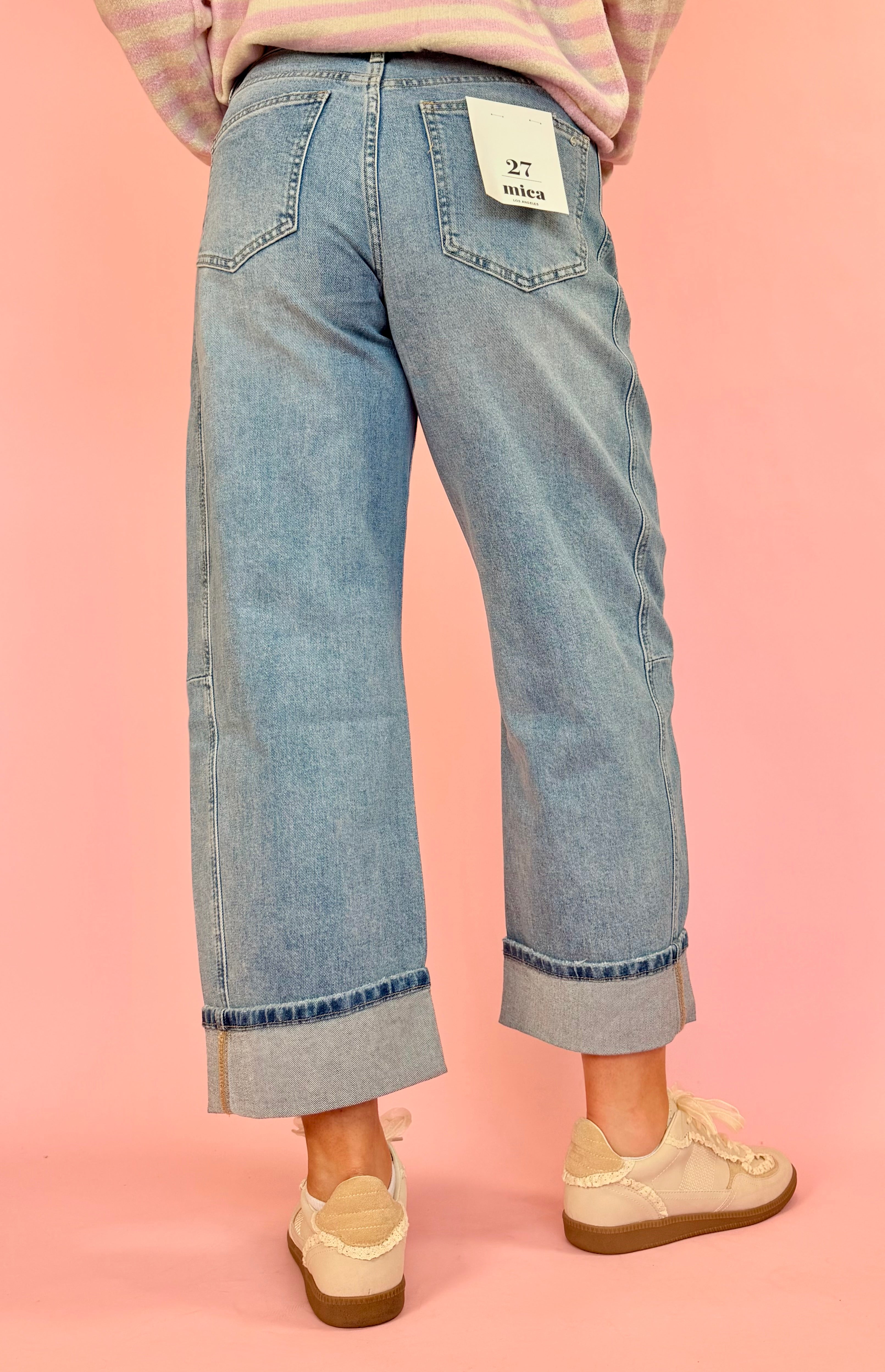 Meet your new denim obsession: the MICA Dusty Sky. This light-medium washed barrel jean sits at a flattering high-to-mid rise and features a subtly tapered leg that's totally versatile—cuff it for a cropped moment or wear it full length. The built-in stretch keeps you comfortable without sacrificing that structured, rigid feel that holds its shape beautifully. Cute, flattering, and ready for anything.