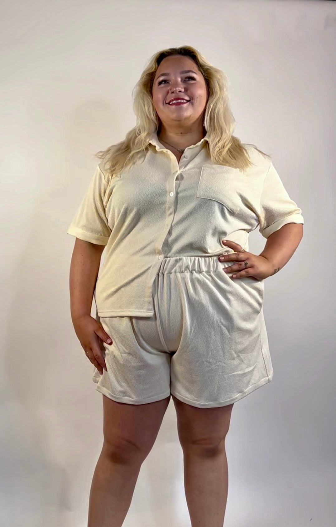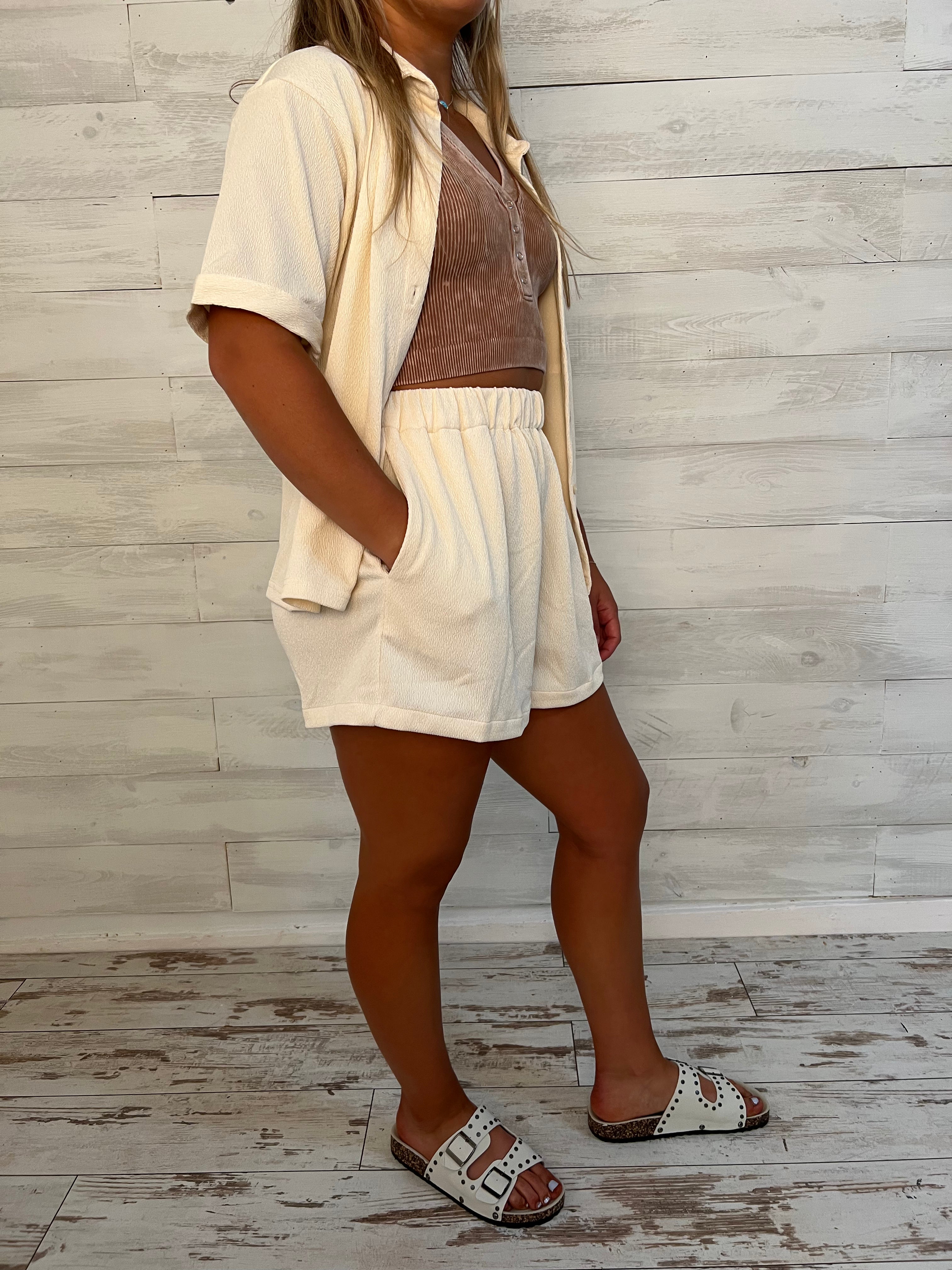 Bring effortless summer style to your wardrobe with the Easy Livin' Cream Set. Neutral colors mix and match with other beach essentials, while a button-down shirt and elastic-waist shorts with pockets offer casual comfort to your look. Perfect for those fun days in the sun, this comfy set is easy to style and sure to become your favorite!