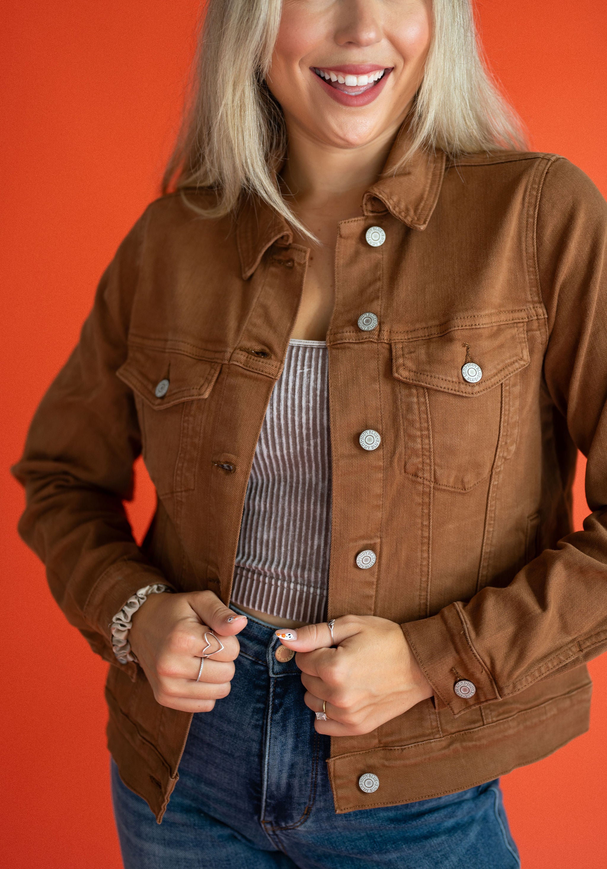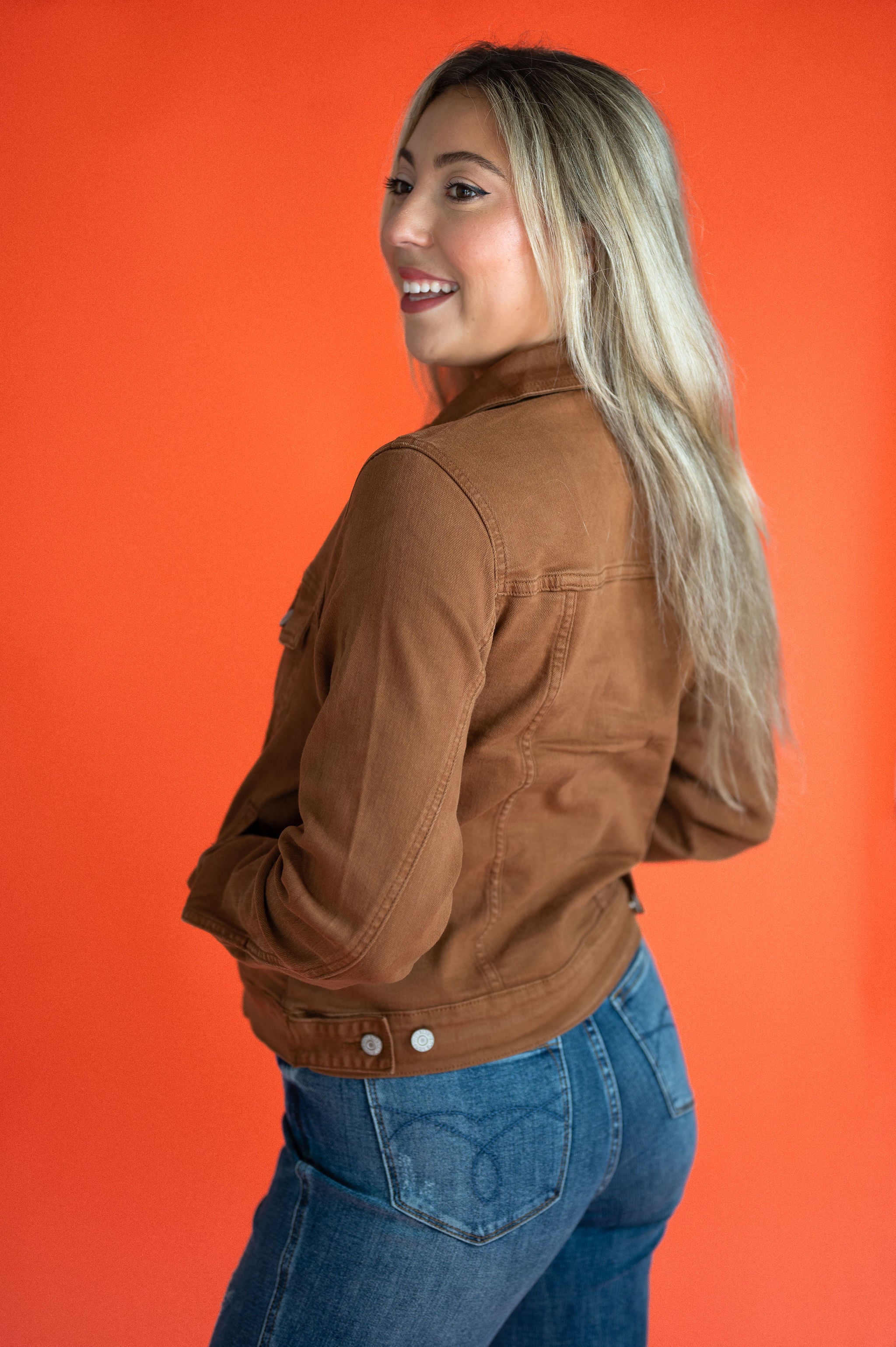 Stay in style this season with our Judy Blue Camel Denim Jacket. Made with a super stretch fabric, this jacket offers a perfect fit and essential comfort. Its non-oversized classic design in the perfect fall color will elevate any outfit. Size up for an oversized look. Stop searching, this wardrobe piece is a must-have for any fashionista!