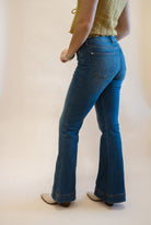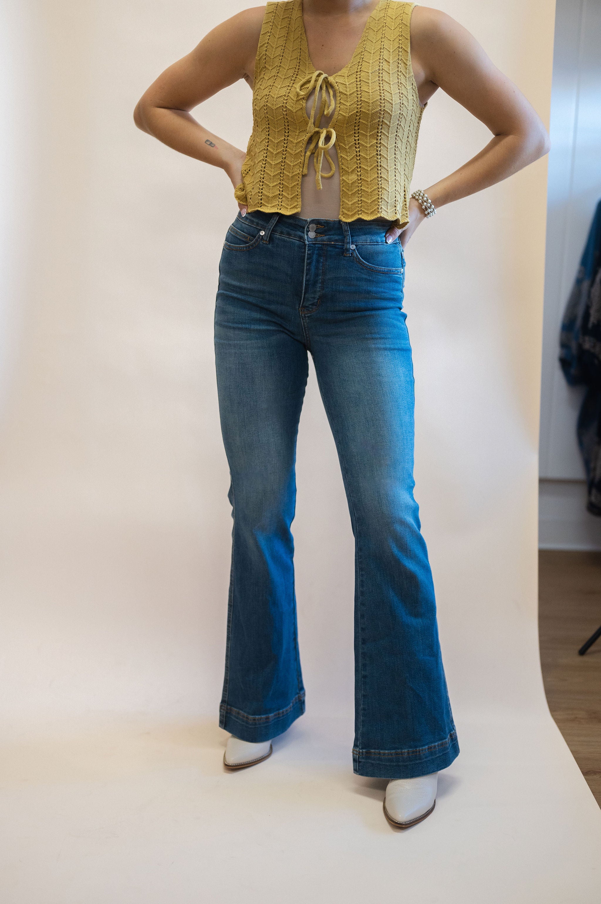 These flares hug your curves with a high waist and tummy control panel that smooths and shapes. The double button waistband adds a fun twist while giving extra support. Featuring a soft vintage wash and flared leg, they effortlessly elongate your legs and boost your confidence. Made from comfy stretch denim, they move with you without losing their shape—perfect for dressing up or keeping it casual!