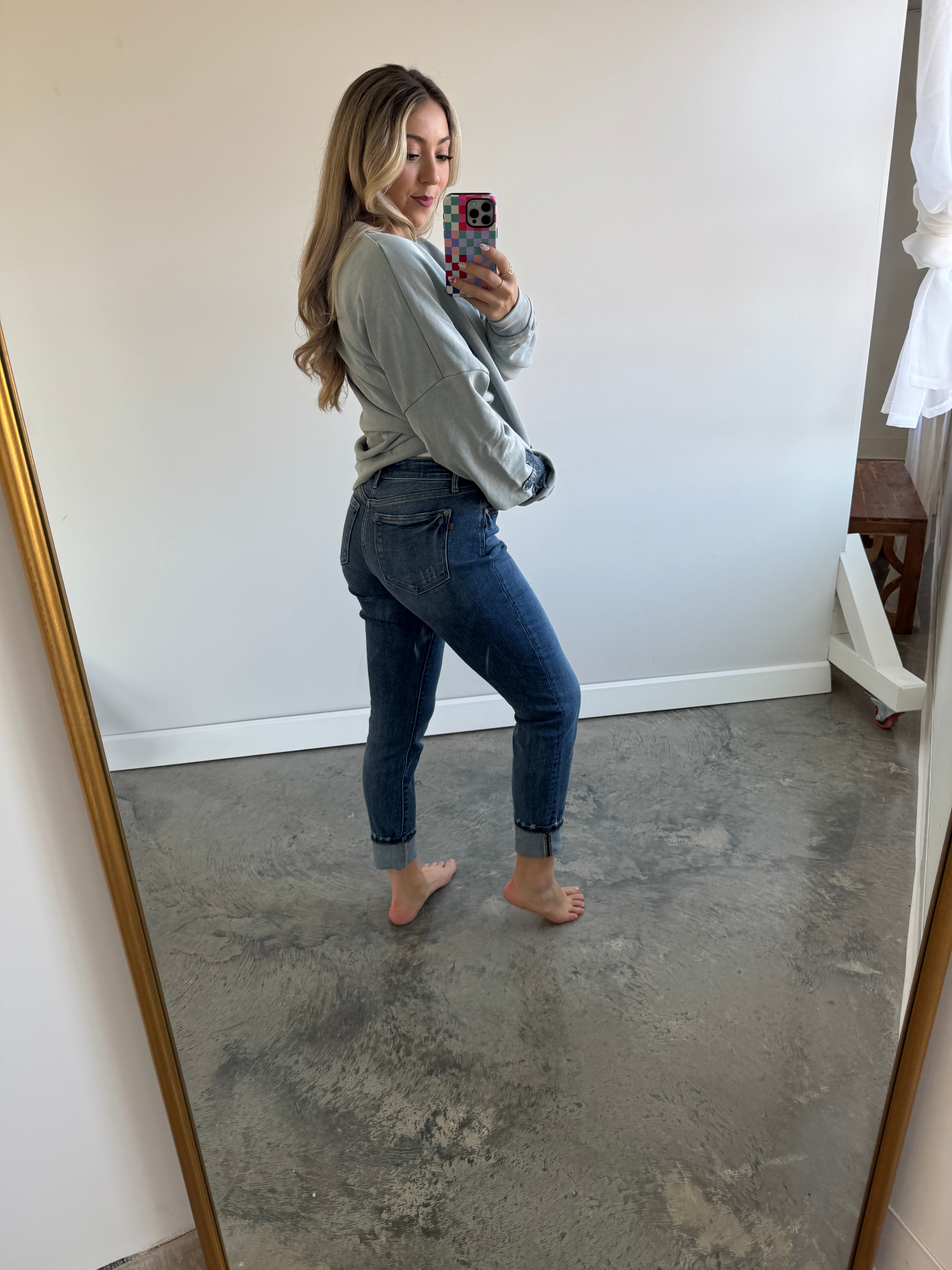 Unleash your inner cool kid with Judy Blue Mid Rise Vintage Boyfriend Jeans. These versatile jeans feature a cuffed design and come in a trendy inky vintage medium to dark wash. Dress them up or down, they're perfect for any occasion. Available in regular and plus sizes, these stretchy jeans are a best seller!