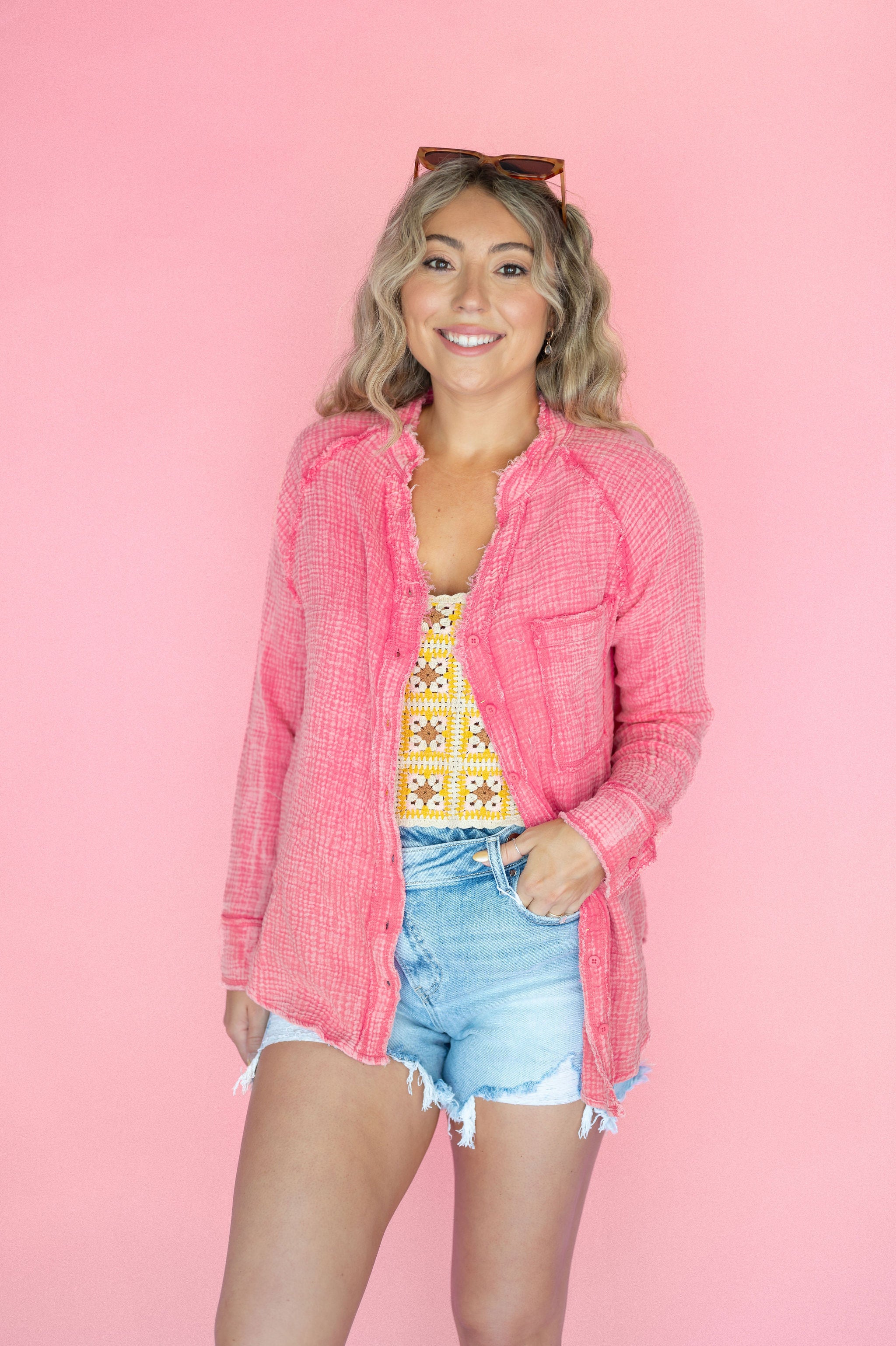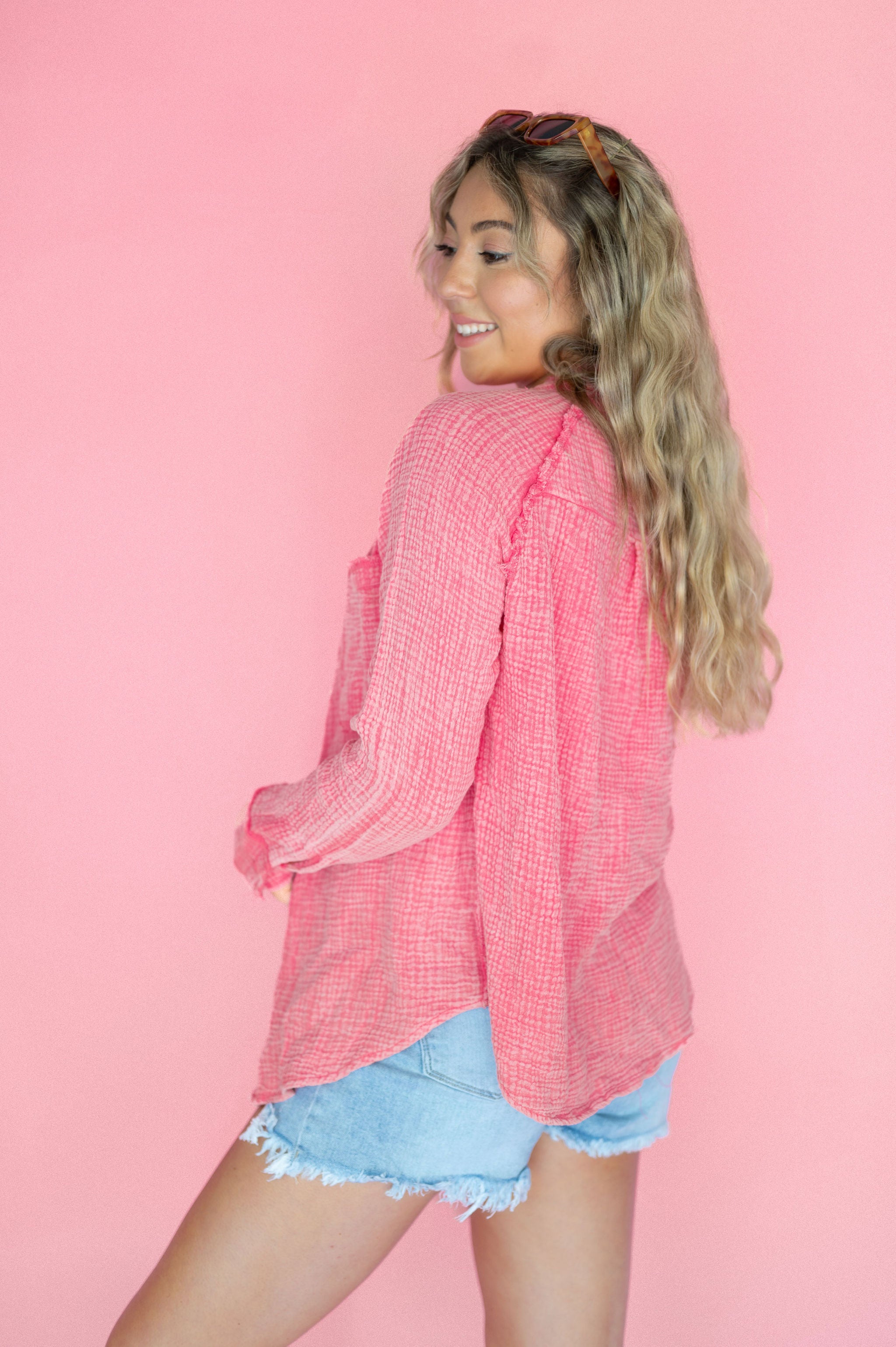 Add some cool comfort to your wardrobe with our Mineral Washed Woven Crinkled Linen Gauze Shirt. This oversized top features a stand collar and button up design, making it perfect for effortlessly stylish outfits. Its pink color adds a girly touch, while the raglan long sleeves and patch pockets add a laid back, transitional vibe.