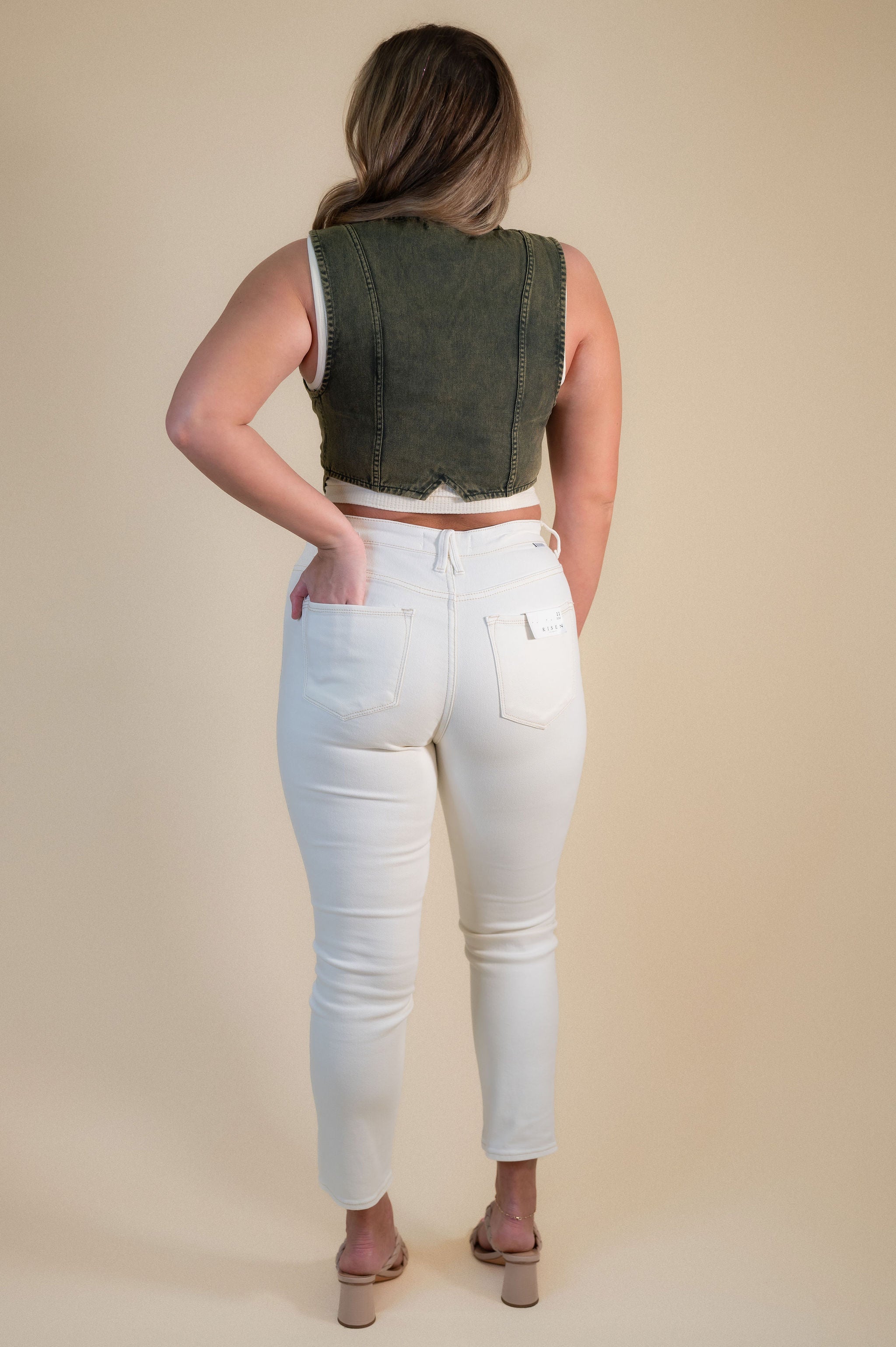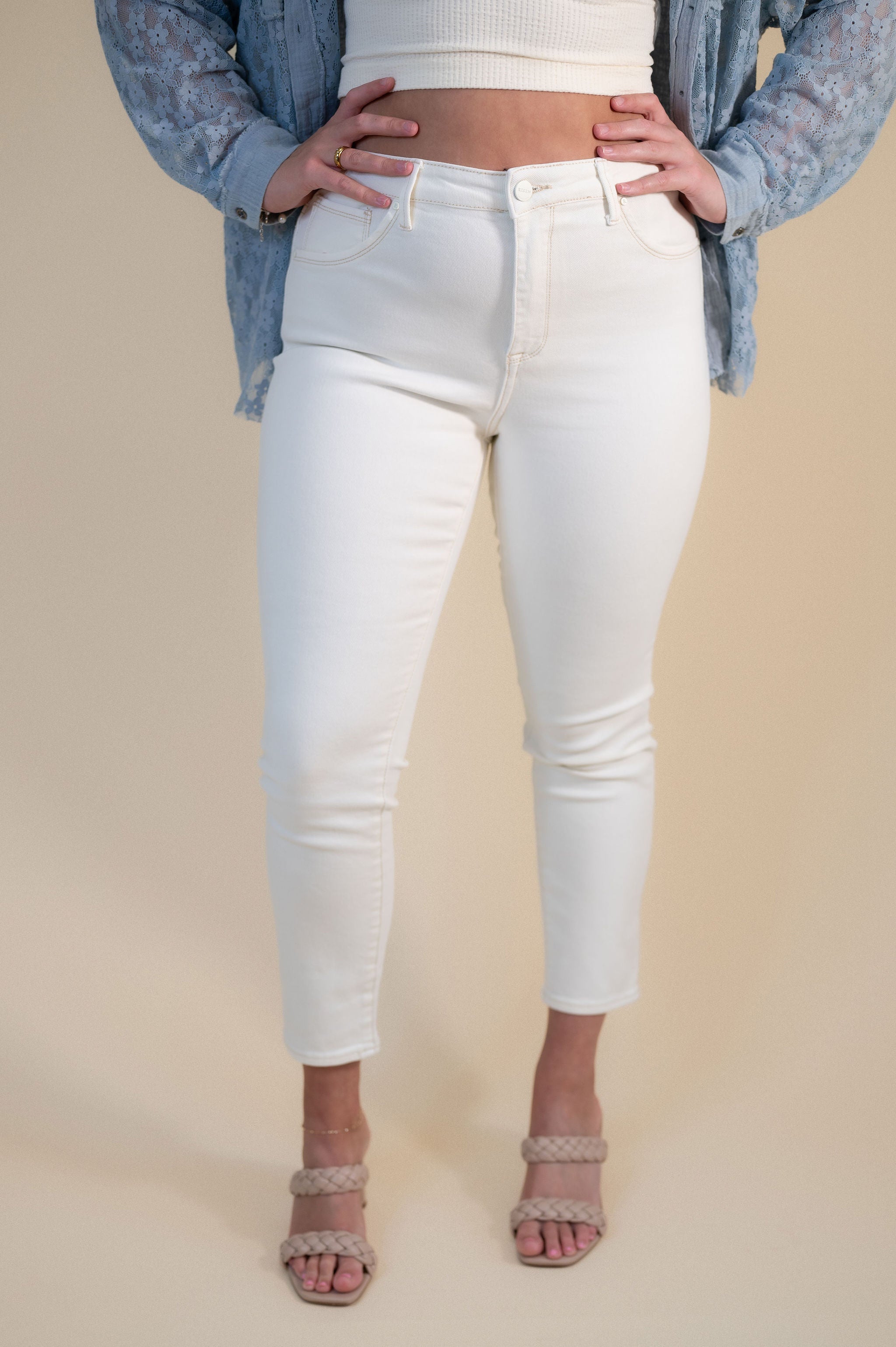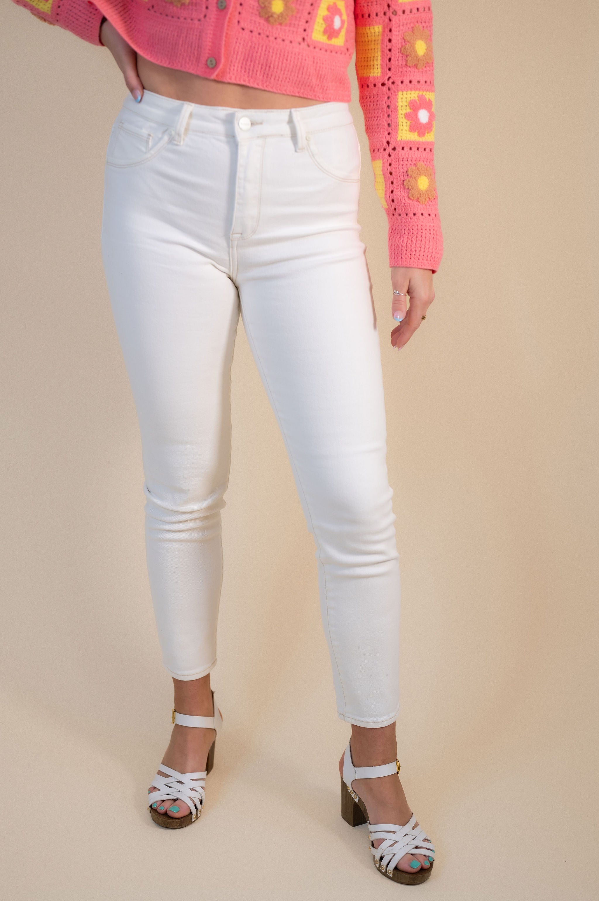 Rise to the occasion in our Risen High Rise Skinny Jeans! Made of comfy, stretchy fabric, these cream-colored jeans feature faux front pockets and functional back pockets for a sleek look. With a 27.5" inseam and high rise fit, these jeans will have you feeling confident and stylish all day long.