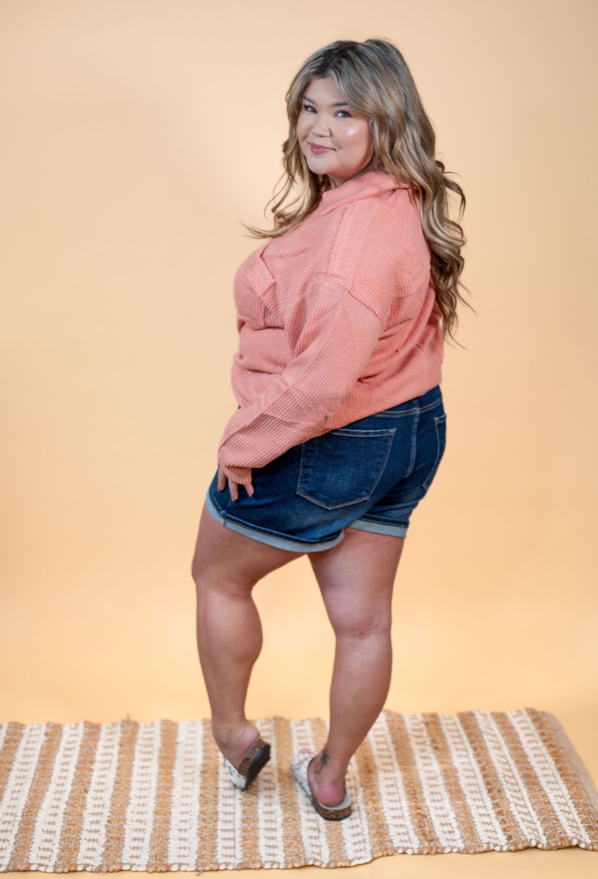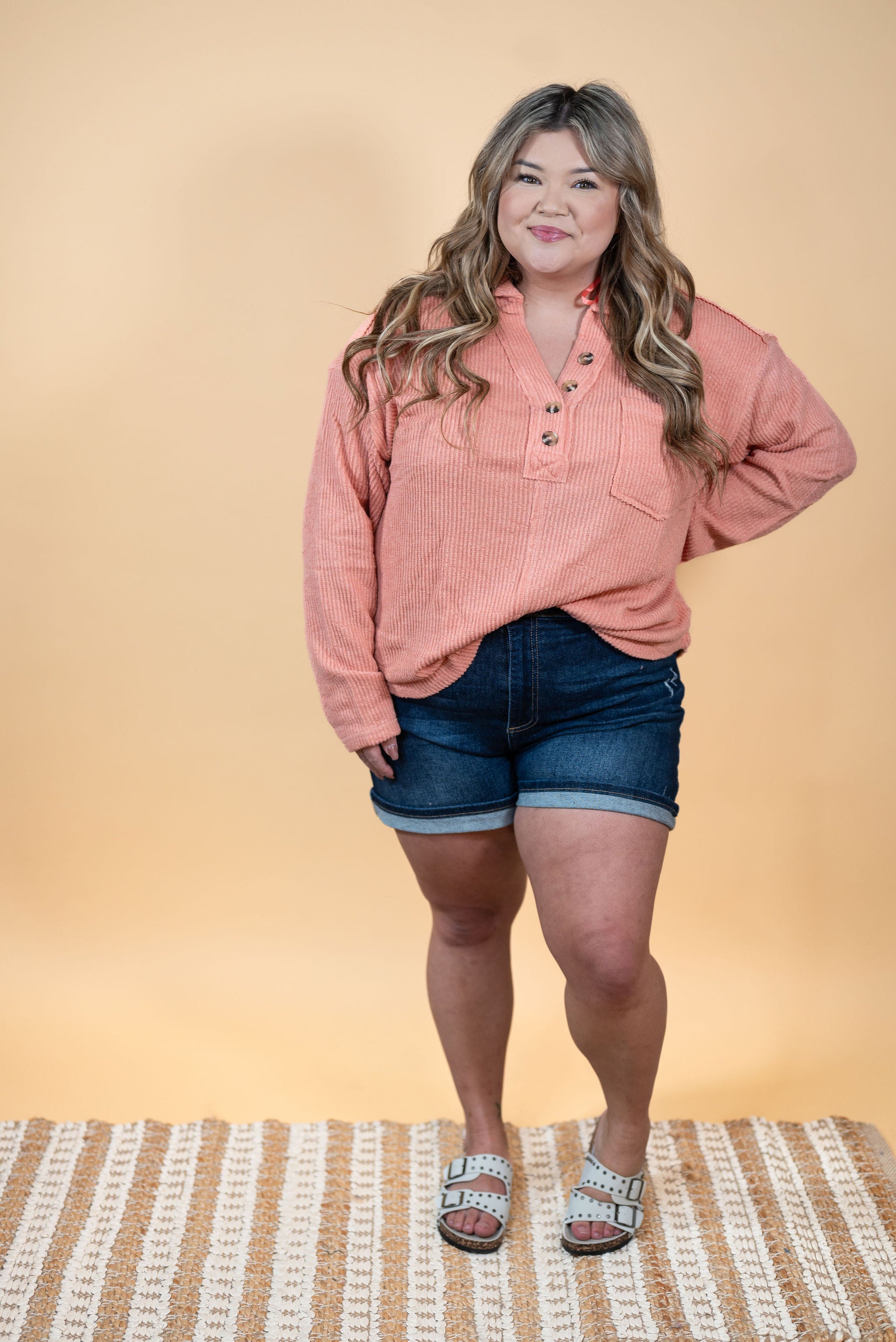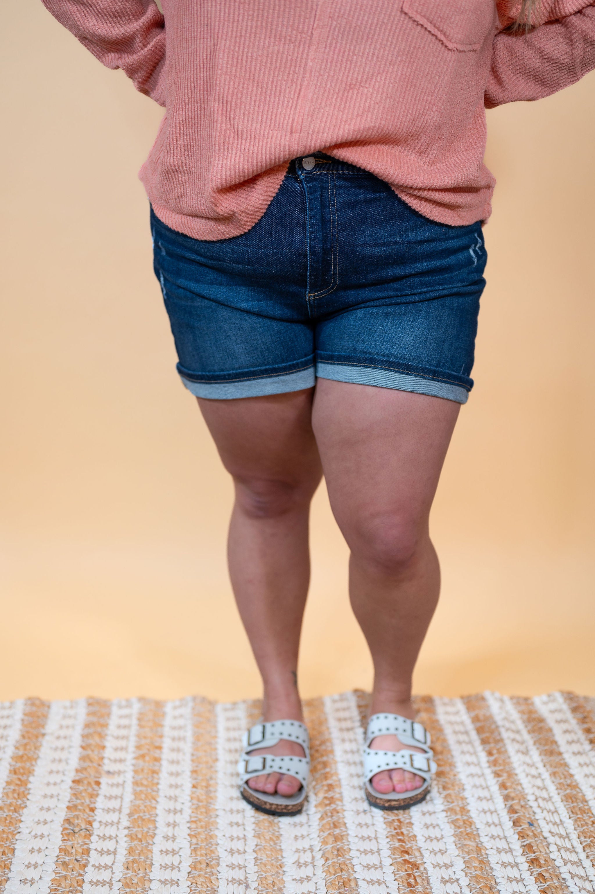 Embrace your playful side with Risen High Rise Turn Up Cuff Shorts. Made with stretchy fabric, these shorts come in a dark wash with minimal distressing for a trendy, effortlessly cool look. Plus, the midi length allows you to easily cuff or uncuff the hem for a versatile and fun style.