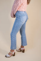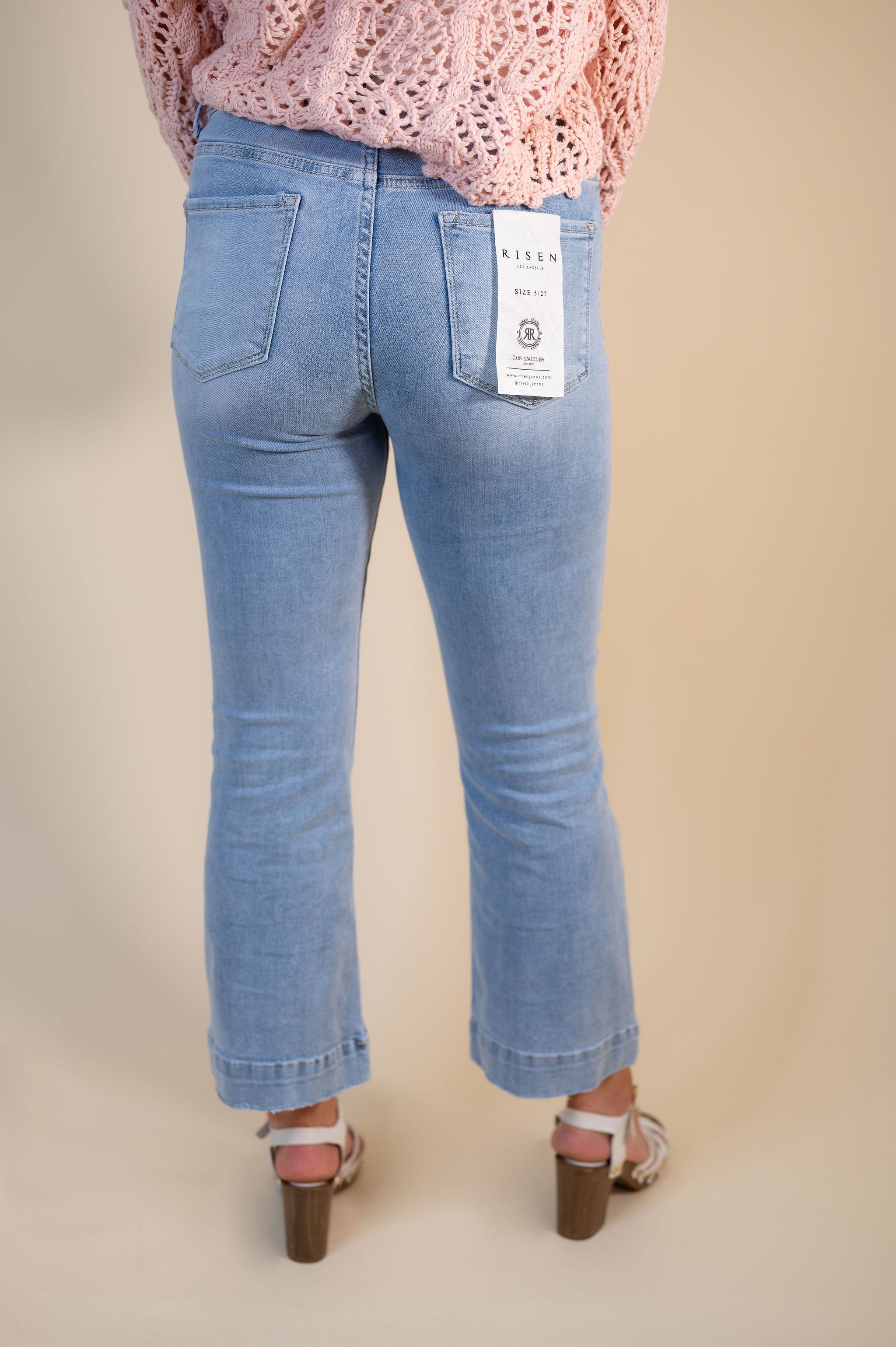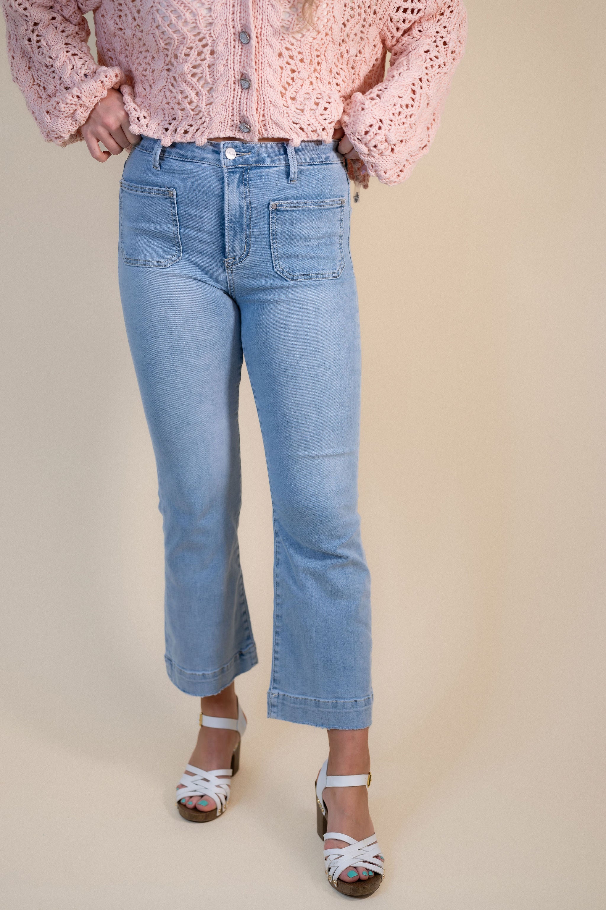 Sail away in style with our Risen Sailor Girl Crop Ankle Flare Jeans. These high-rise jeans feature a front patch pocket and ankle flare cut, perfect for showing off your favorite pair of shoes. The light wash and non-distressed design make them versatile for any occasion.