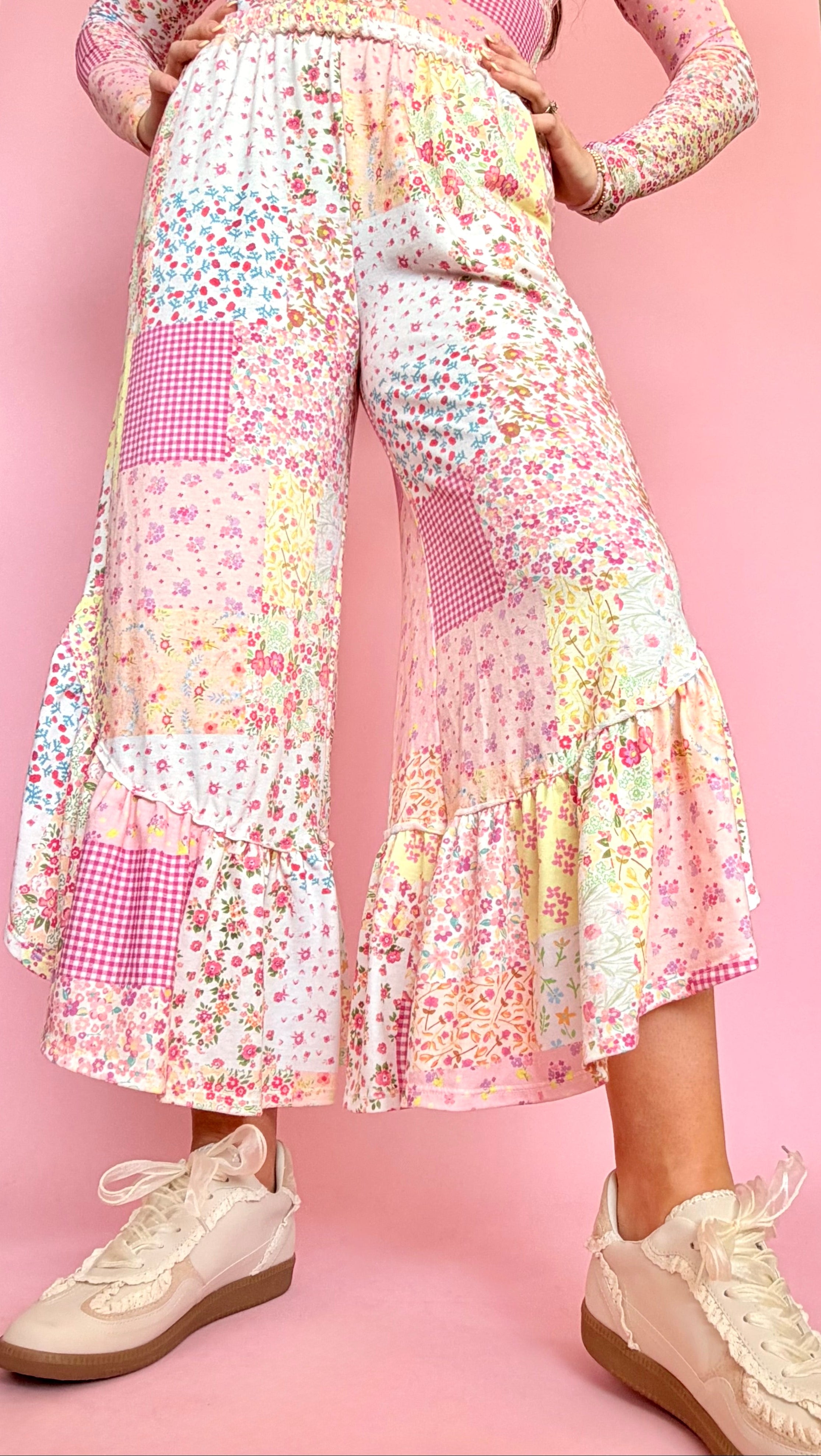 Spring Picnic Patch Print Ruffle Pants