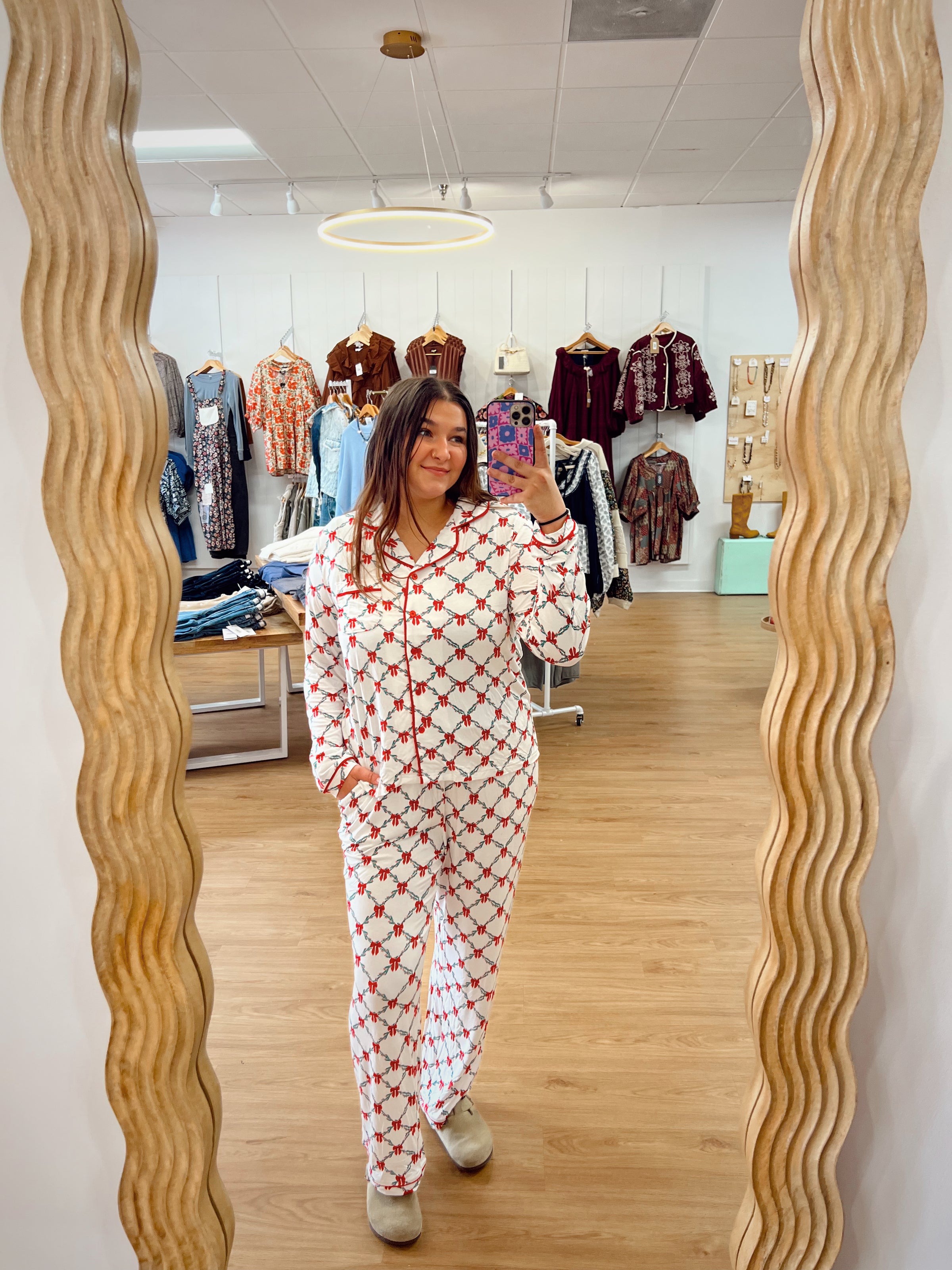 Slip into the cozy spirit of the season with the Charlotte Lattice Garland Christmas Pajama Set. This soft, long-sleeve top and pants combo features a festive white base adorned with charming green garland details and bright red bows. Perfect for lounging or holiday mornings, these pajamas bring warmth and a cute holiday vibe to your celebrations.