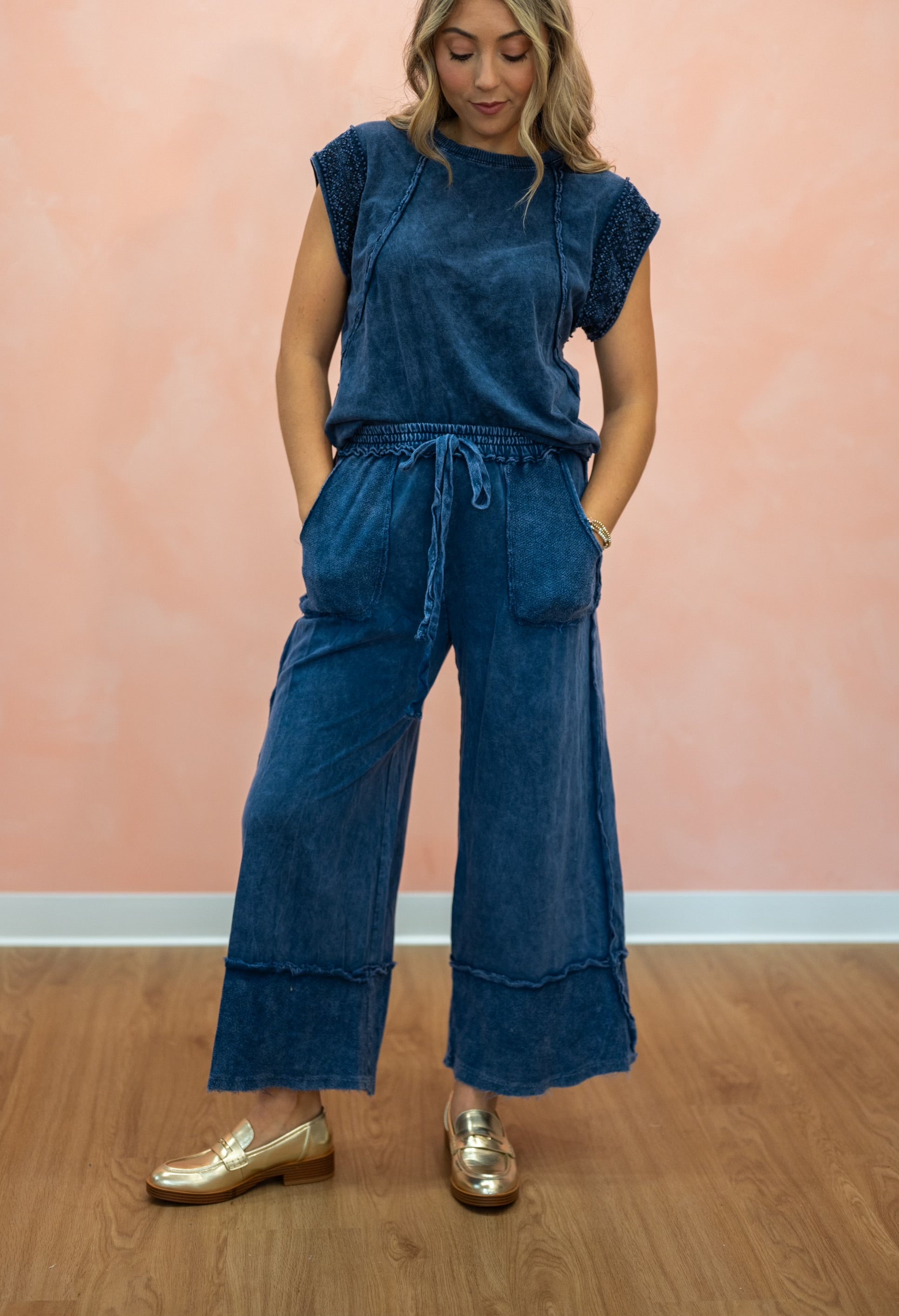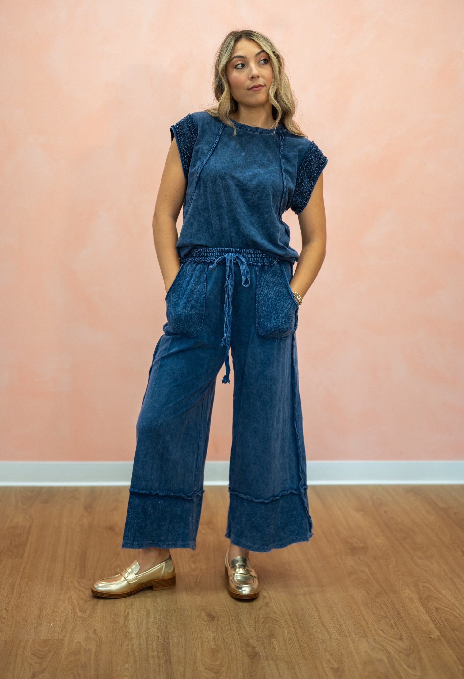 Dress up in this playful Mineral Wash Boheme Cap Sleeve Blouse in navy. Made with 100% cotton, it's true to size and features a unique mineral wash trim. Perfectly pairs with our matching pants. Actual colors may vary, but the fun style will stay the same.