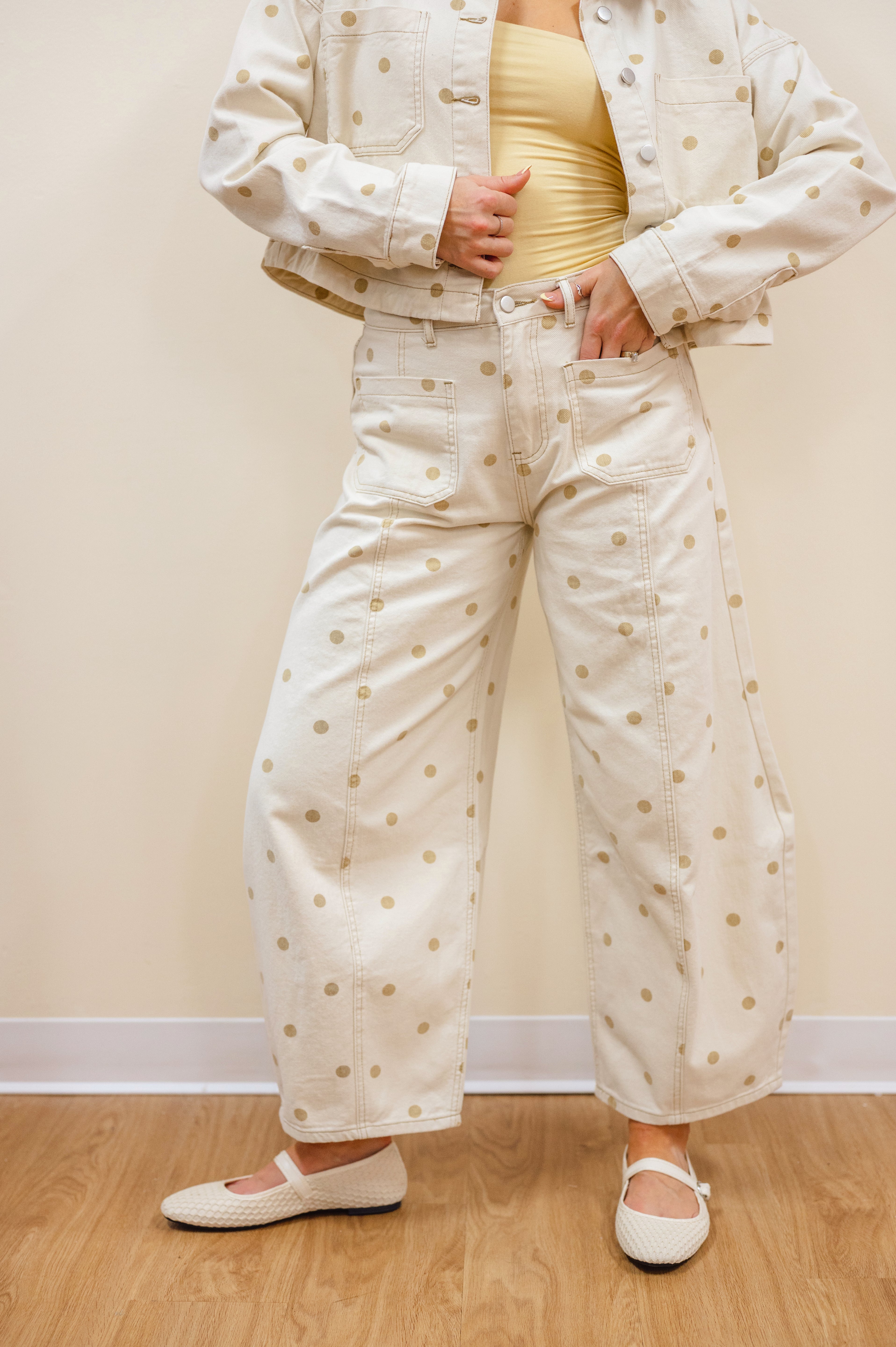 Sprinkle some sweetness into your wardrobe with these cream barrel pants featuring a charming butterscotch polka dot print on soft twill denim. Designed with functional front pockets and a flattering tapered leg, they're equally fabulous worn solo or styled with the matching barn jacket for a coordinated ensemble. Style versatility that actually delivers.