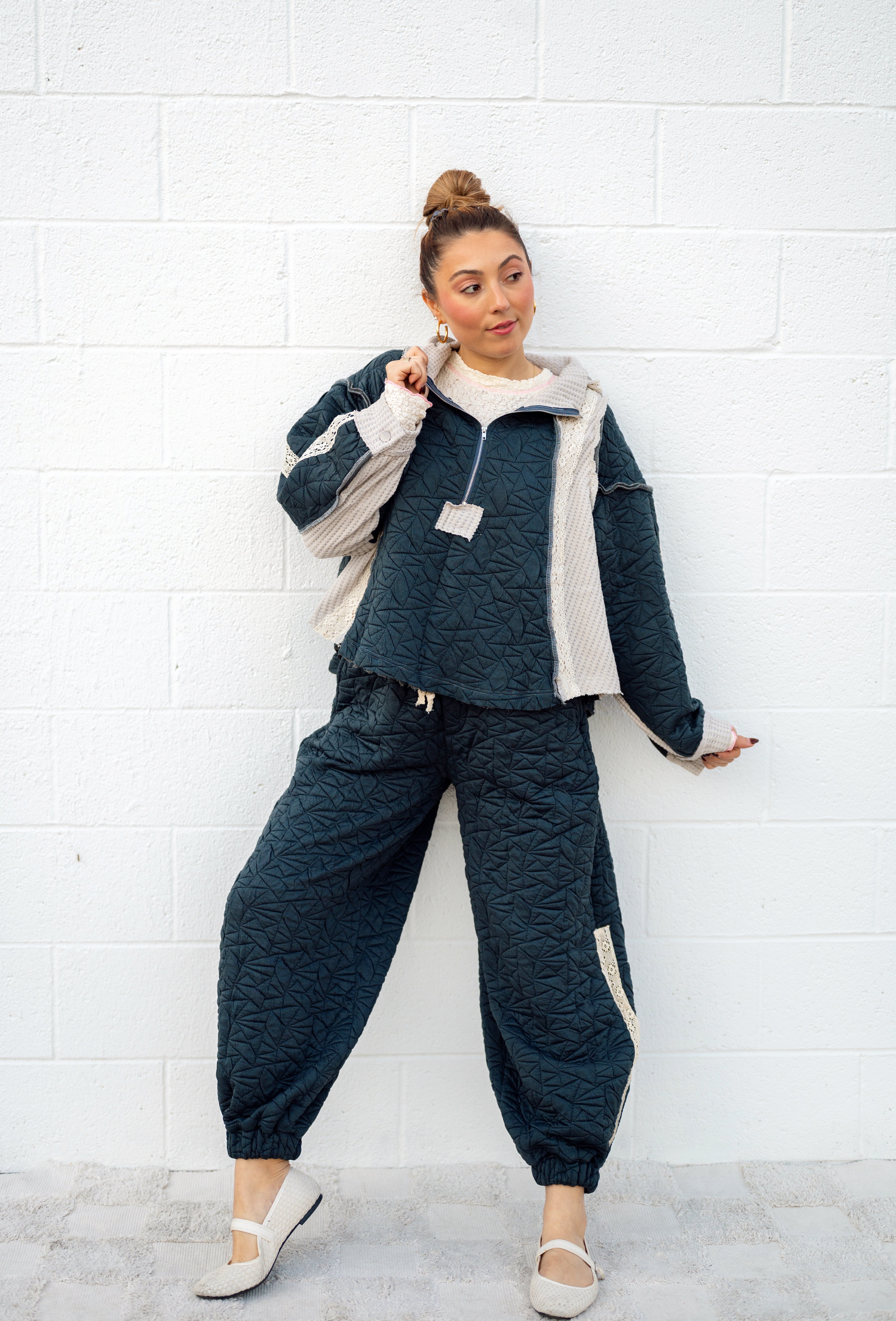 Snuggle up in style with the POL Charcoal Quilted Quarter Zip Hoodie. This relaxed-fit, quilted pullover mixes cozy comfort with cute boho vibes, featuring delicate cream and lace details. The quarter zip and hoodie add playful charm and practicality, making it your new favorite go-to for easy, laid-back days.