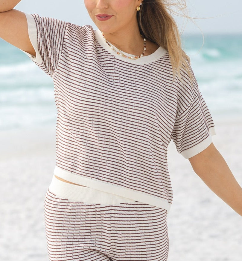 This charming striped tee is your new wardrobe MVP! With its boxy crop cut and relaxed fit, it's designed to feel as good as it looks. The chocolate and cream stripes add playful personality, while the soft knit fabric keeps you comfy all day long. Wear it standalone for instant cool-girl vibes or match it with coordinating bottoms for a totally put-together moment.