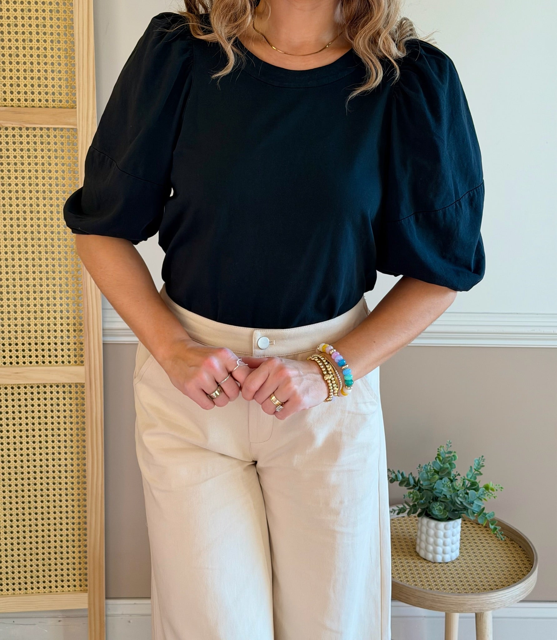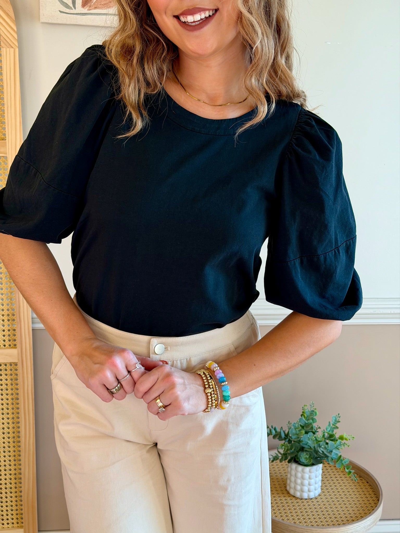 Everyday Chic Round Neck Puff Sleeve Top: Black