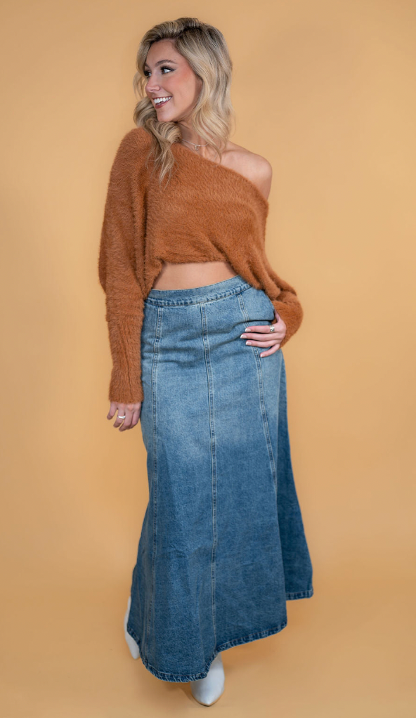 Fall's hottest trend is the denim maxi skirt! This skirt features paneling to give it an edgy twist, along with a side zip to make getting dressed a cinch. Enjoy a classic ombre medium wash to match any blouse, while its non distressed look gives a chic vibe for work or weekend wear. Style with your favorite low or tall boots for an elevated look!