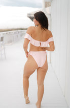 An off-the-shoulder crop bikini top with supportive underwire and playful ruffle overlay. Kate is best paired with our Poppi Bottom.