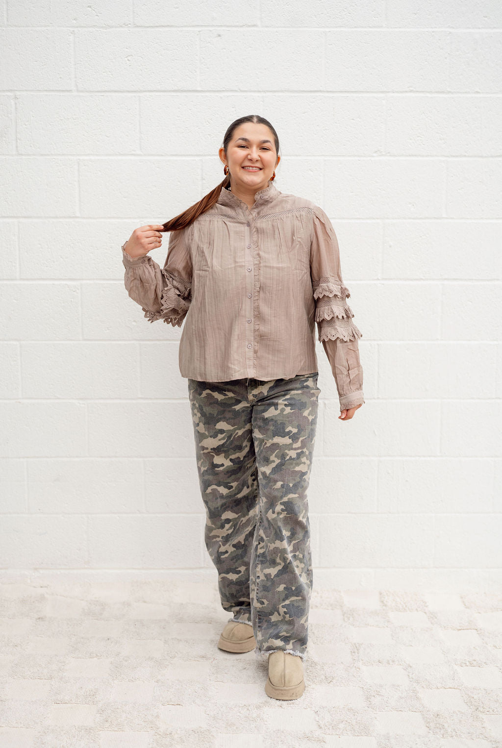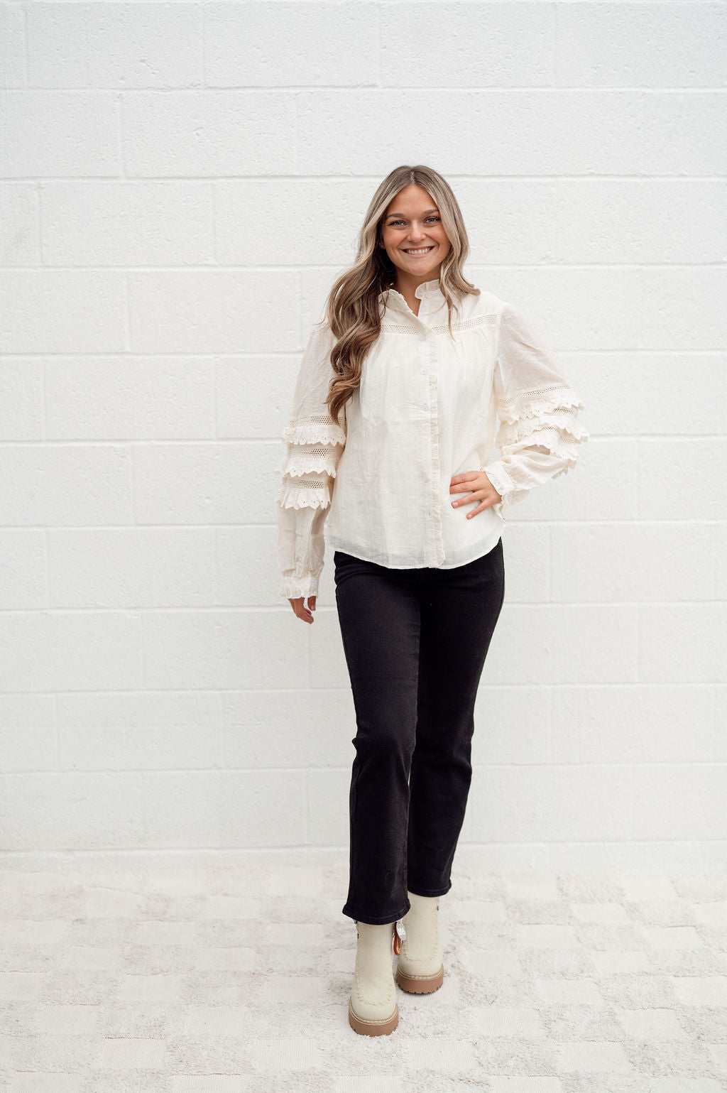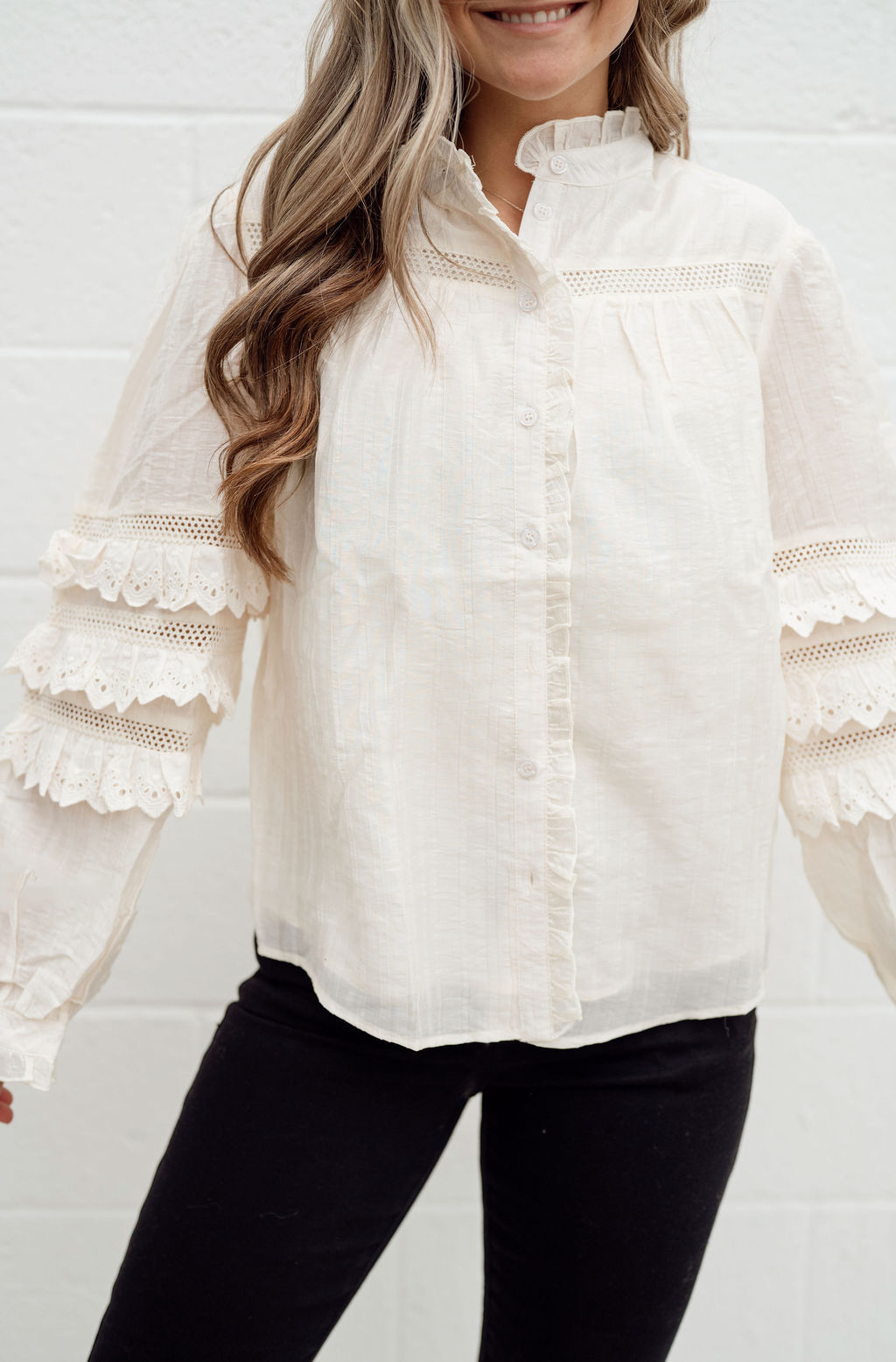 Embrace effortless elegance with this charming blouse that marries vintage romance with modern comfort. Crafted from soft, textured fabric adorned with tonal pintucks, it features delicate lace inserts across the chest and cascading eyelet ruffles on the sleeves for undeniable charm. The relaxed fit, gathered yoke, and lined body create a flattering, breathable silhouette perfect for tucking into denim or layering under your favorite pieces. Button-front closure makes dressing a breeze, while the intricate details—from mini ruffles framing the collar to ladder lace accents—add that sweet, vintage-inspired touch you'll love.