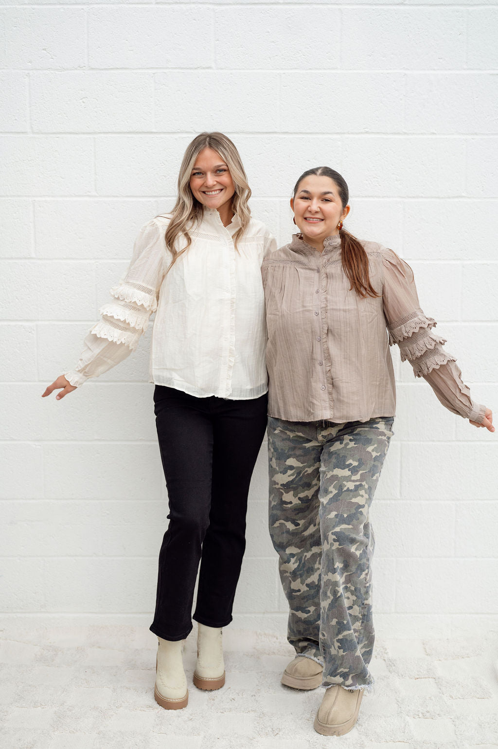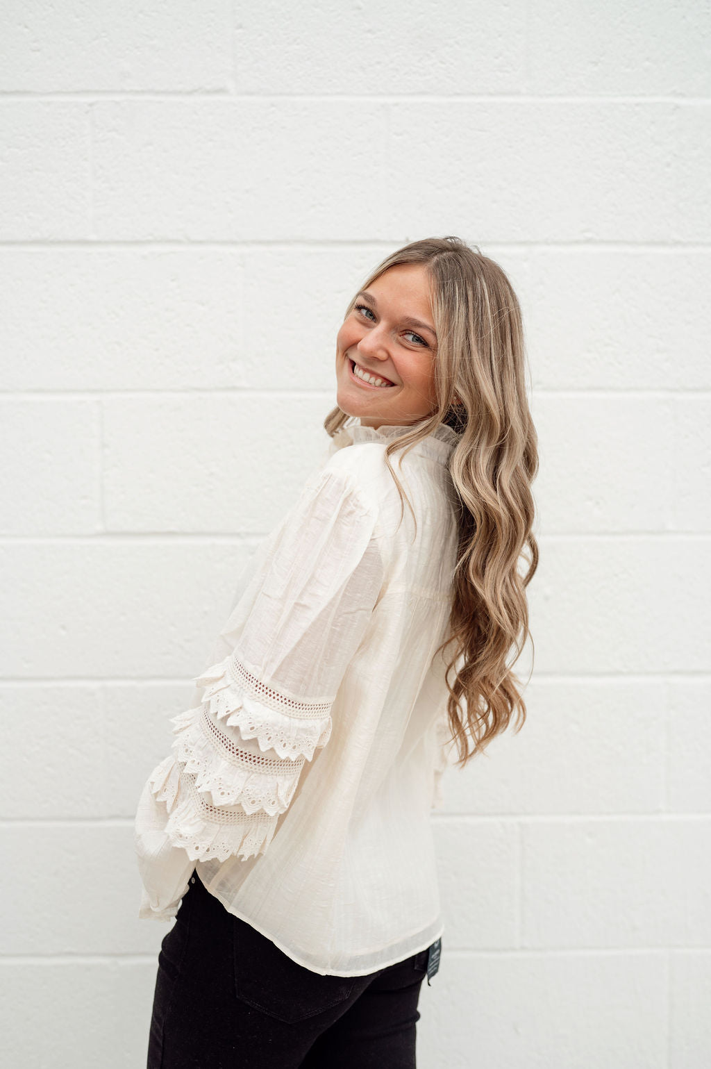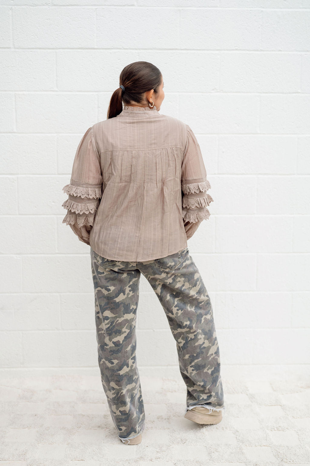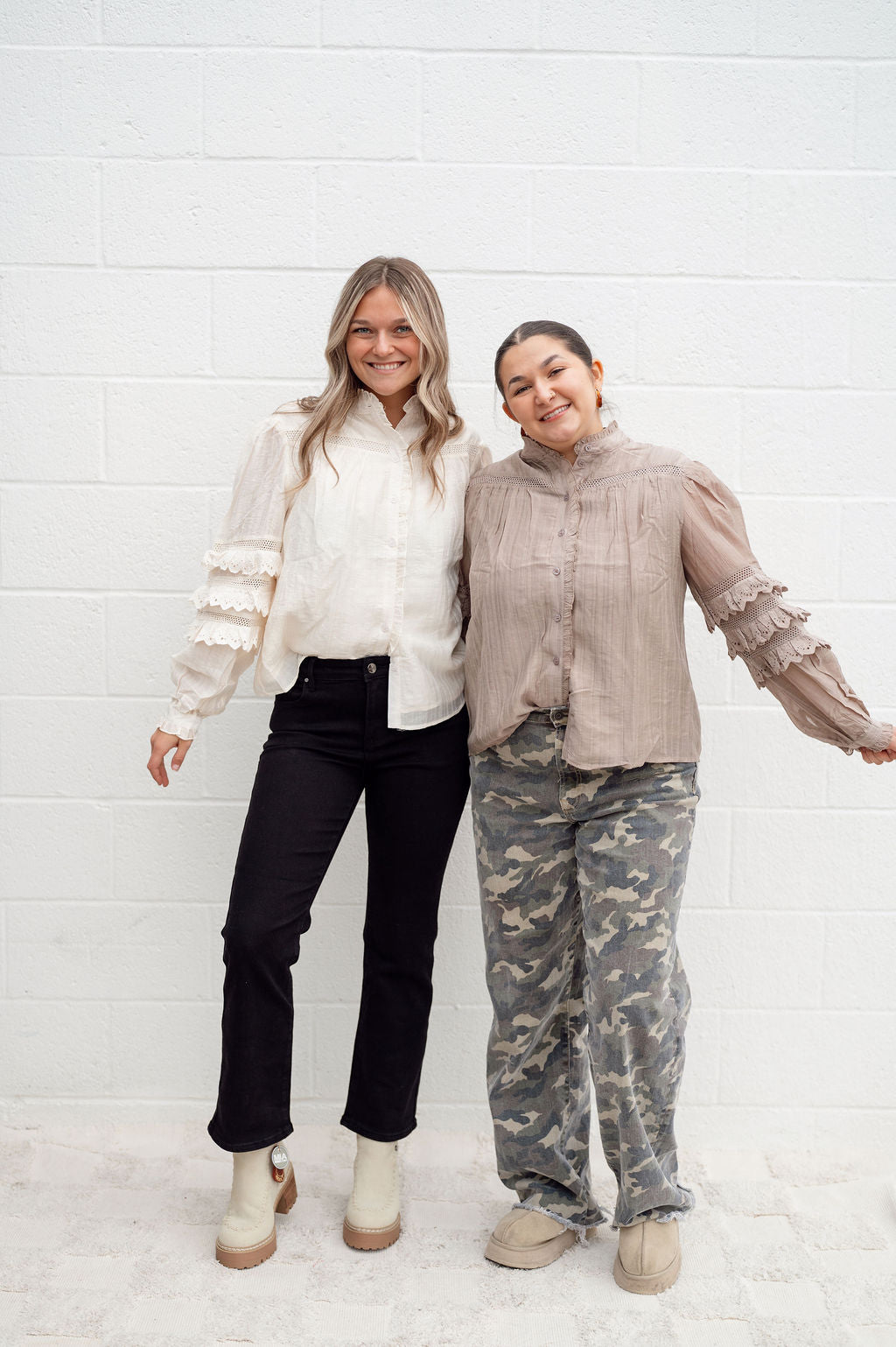 Embrace effortless elegance with this charming blouse that marries vintage romance with modern comfort. Crafted from soft, textured fabric adorned with tonal pintucks, it features delicate lace inserts across the chest and cascading eyelet ruffles on the sleeves for undeniable charm. The relaxed fit, gathered yoke, and lined body create a flattering, breathable silhouette perfect for tucking into denim or layering under your favorite pieces. Button-front closure makes dressing a breeze, while the intricate details—from mini ruffles framing the collar to ladder lace accents—add that sweet, vintage-inspired touch you'll love.