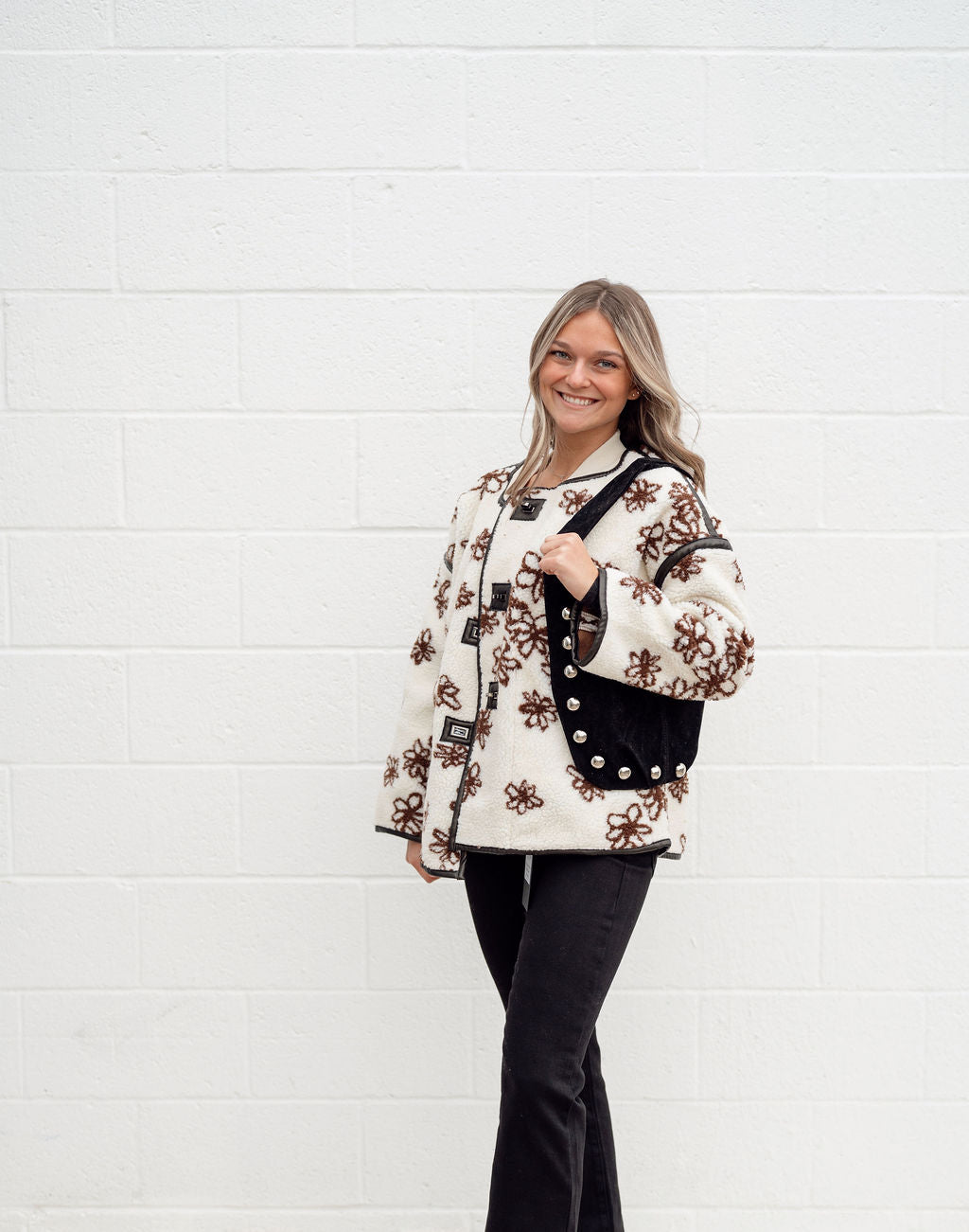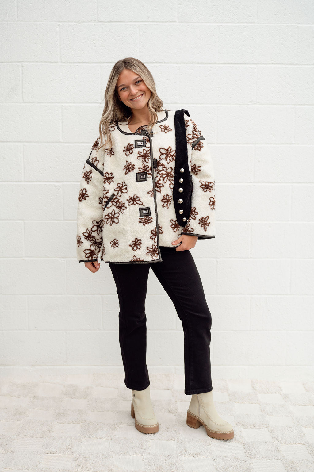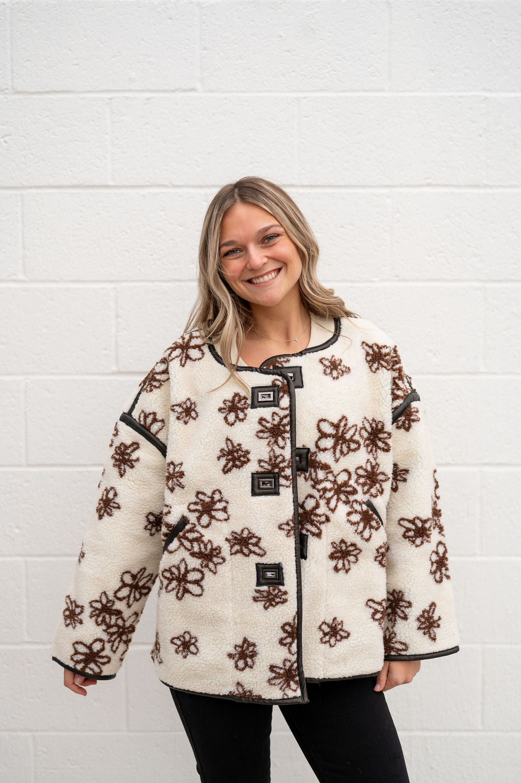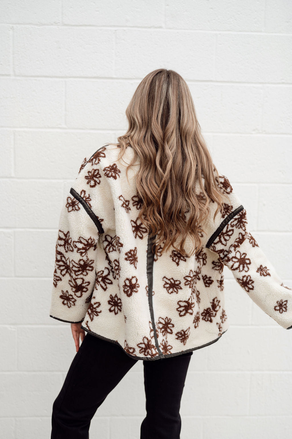 This oversized floral jacket is your new go-to for laid-back warmth and boho vibes. Snuggle into the plush fleece with suede lining while the relaxed fit keeps things breezy and comfortable. Metal clasp buttons add quirky charm, and the mineral-washed fabric gives it that effortlessly cool, vintage-inspired edge. Perfect for those days when you want to feel cute, cozy, and utterly at ease.