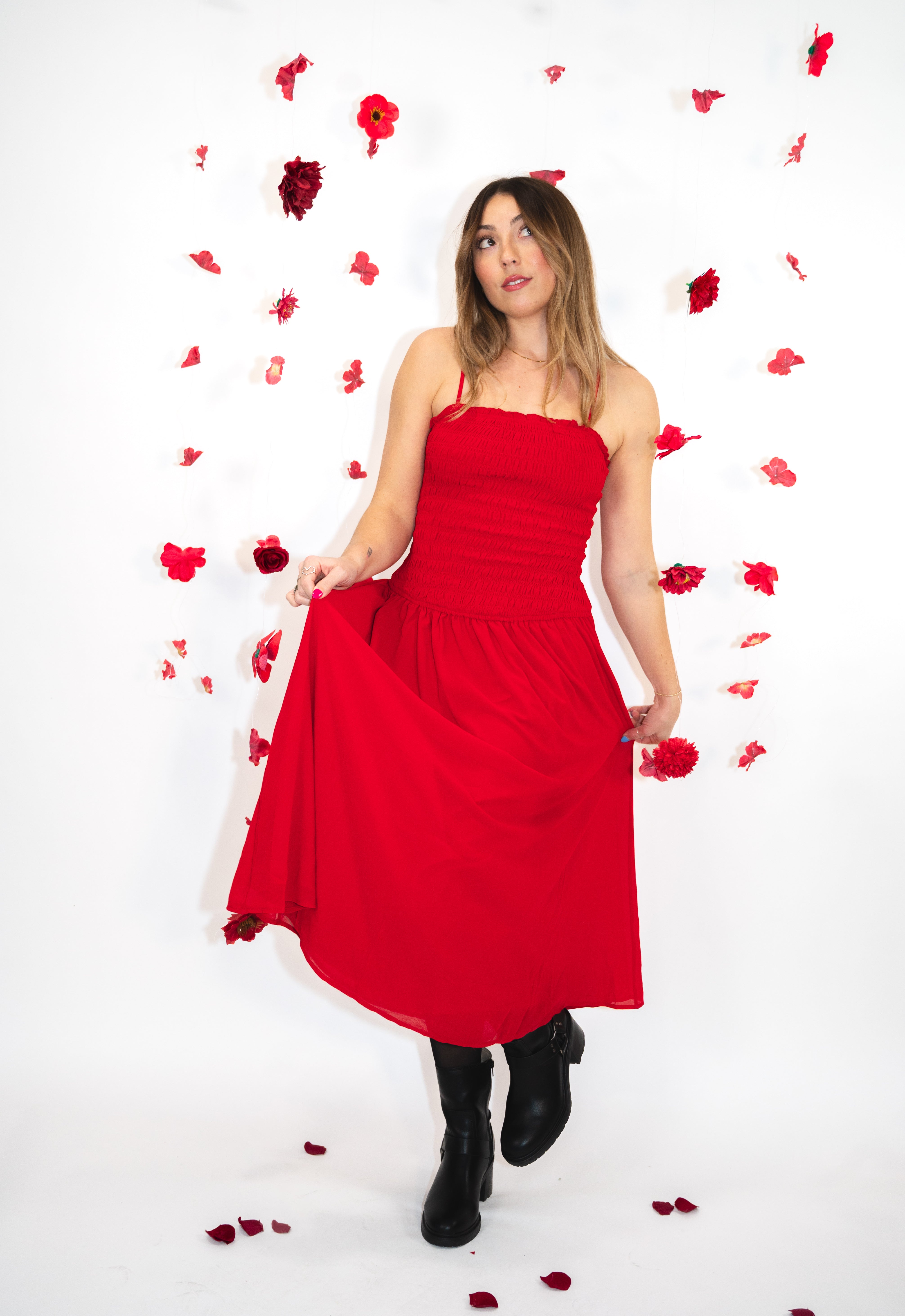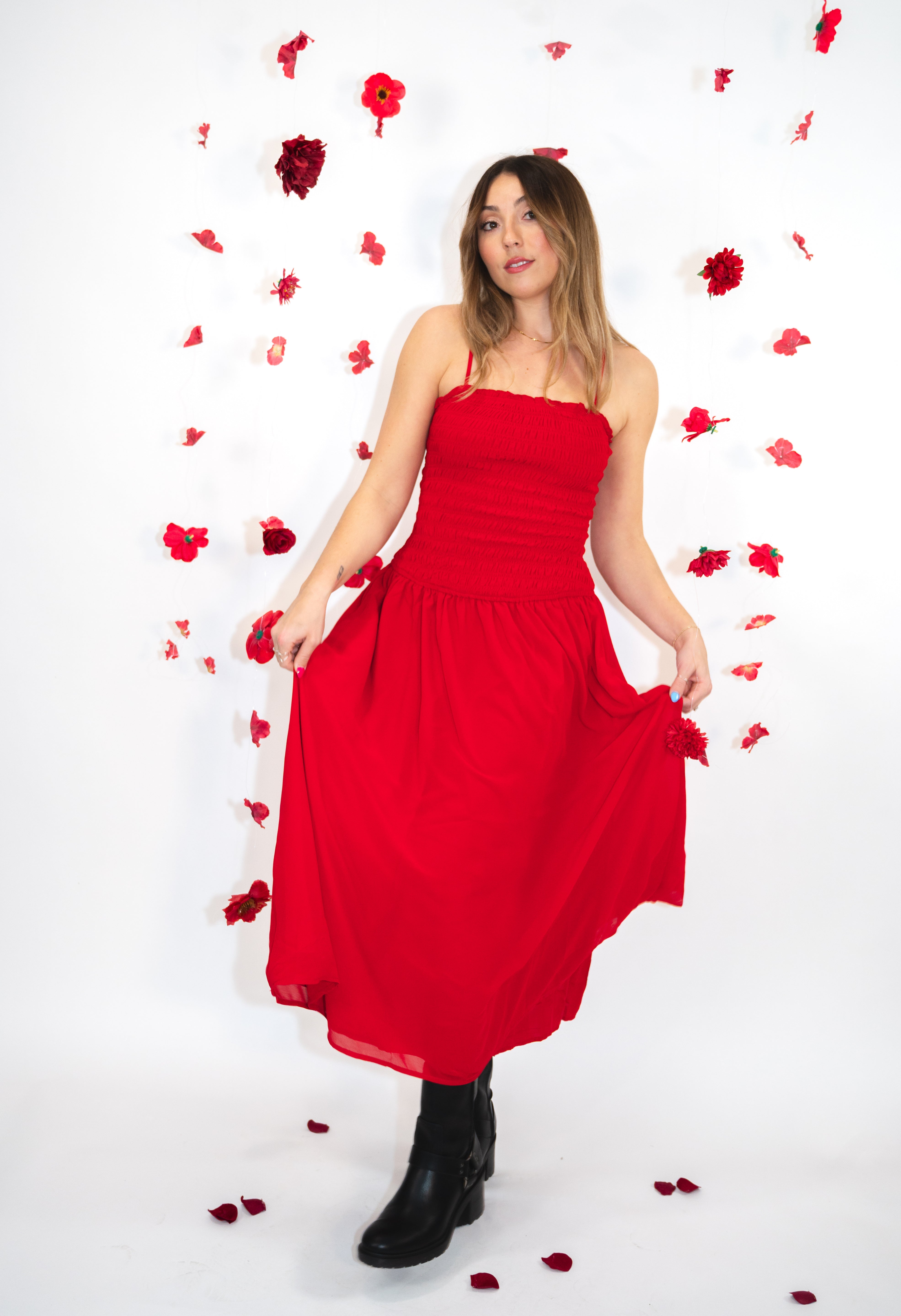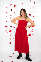 Your new favorite dress just arrived—and it's ready for anything. This cherry red midi features a beautifully smocked bodice that adds dimension and movement, paired with a dropped waistline for a flattering, relaxed fit. The midi length strikes that perfect balance between laid-back and polished, making it your go-to for everything from coffee dates to date nights. Throw on sneakers for casual cool or swap them for heels when you want to turn heads. One dress, infinite outfit possibilities.
