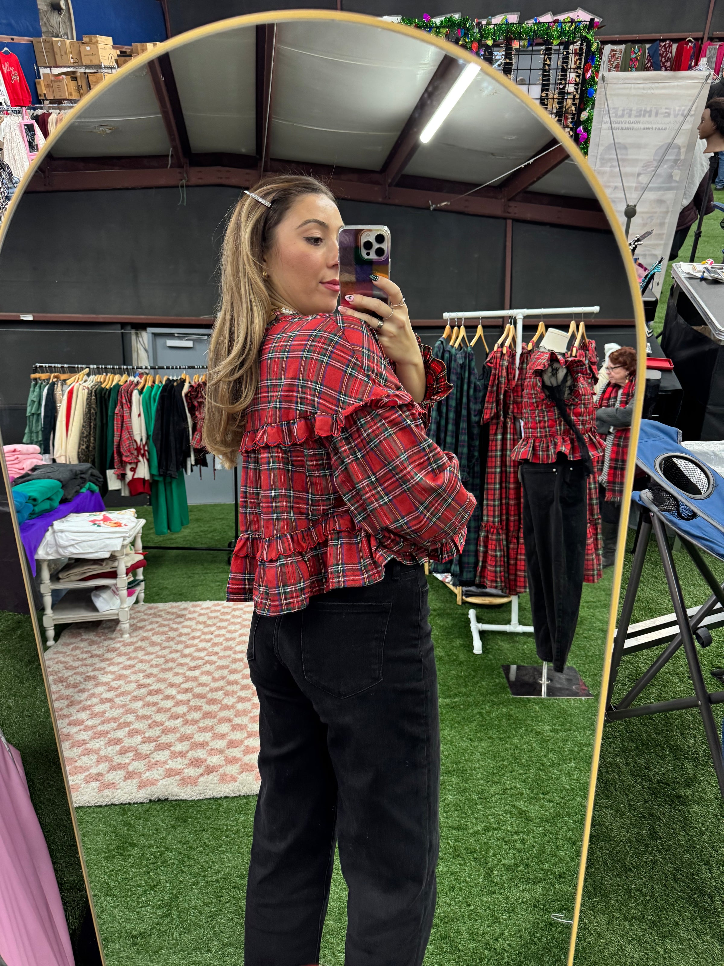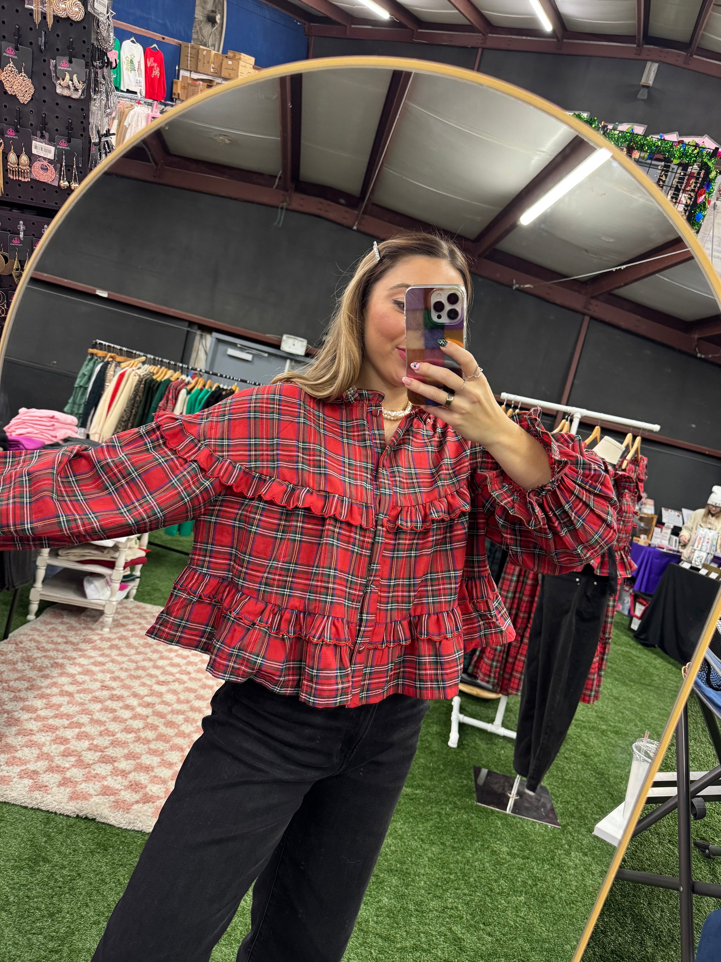 Get festive in this playful red tartan plaid blouse that screams holiday spirit! With its charming babydoll fit and whimsical ruffle accents, this button-up beauty brings that boho energy to your seasonal wardrobe. Long sleeves provide warmth while the classic plaid pattern delivers timeless appeal. Perfect for holiday parties, casual gatherings, or just spreading cheer—this cute blouse is your ticket to effortless, feel-good style.