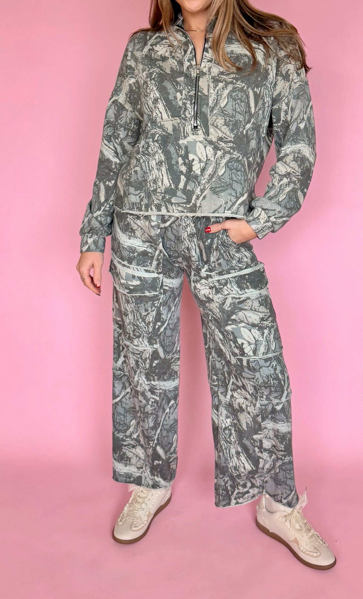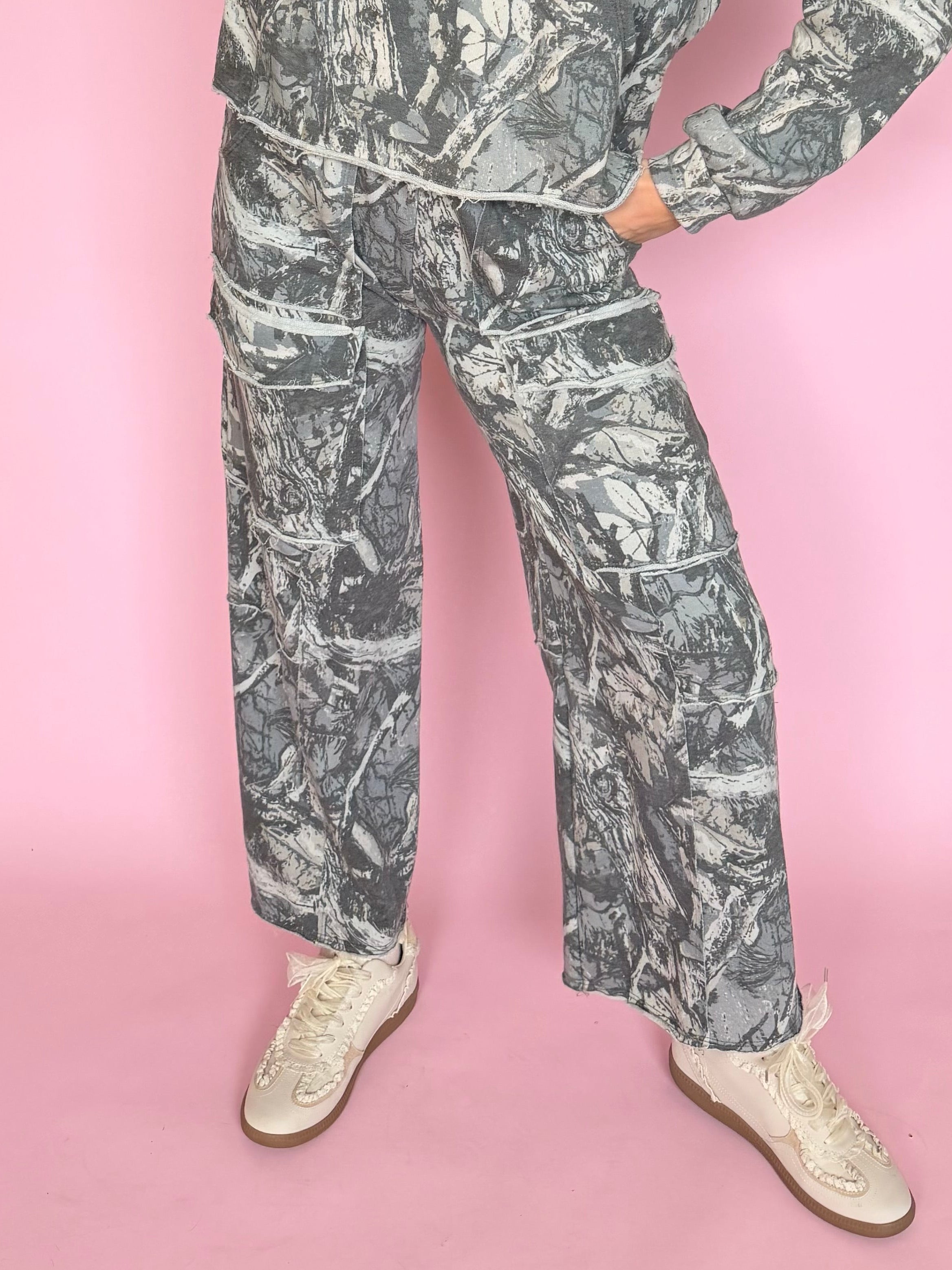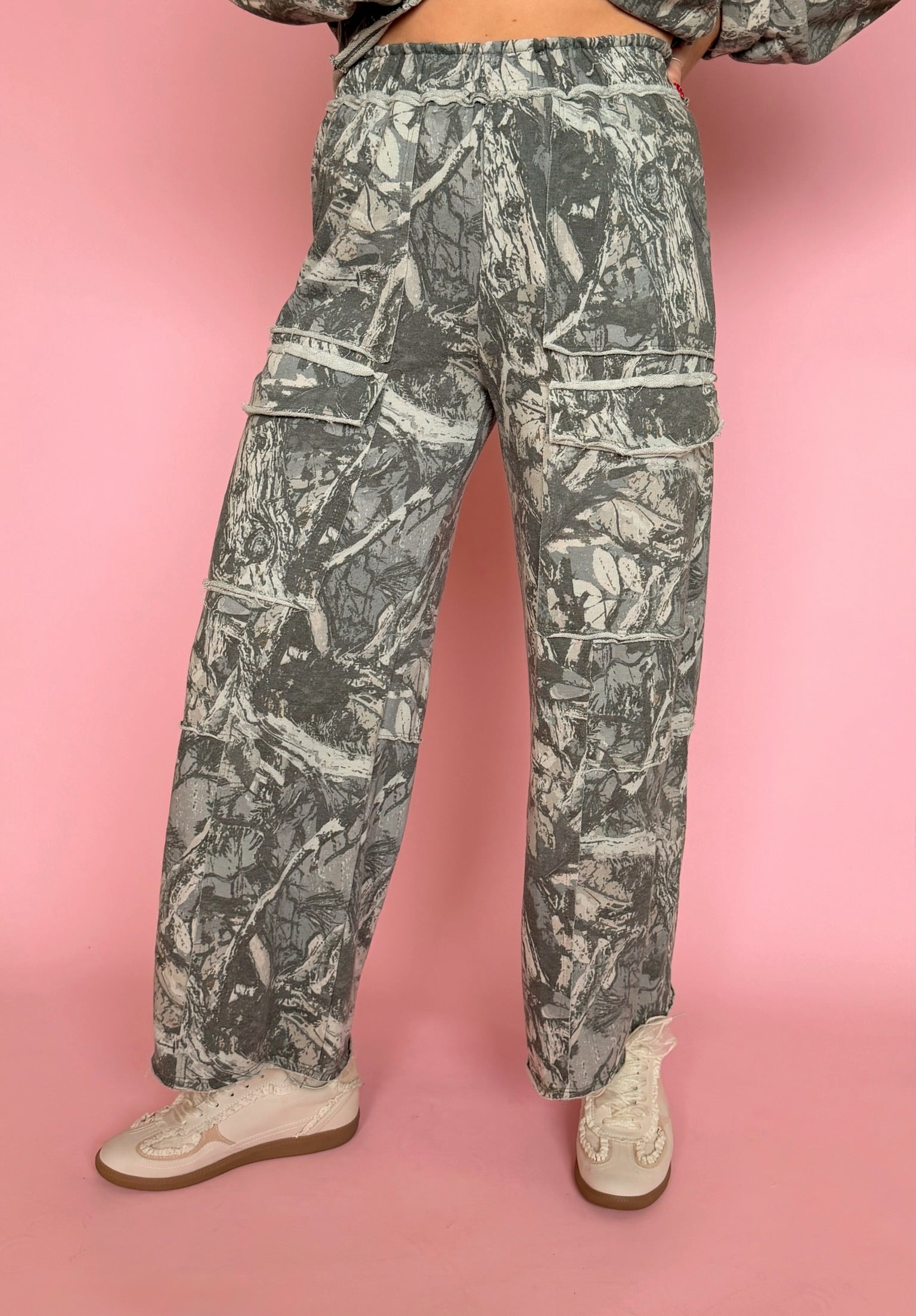 Mineral Wash Wide Leg Cargo Terry Pants are a standout addition to any wardrobe. These wide-leg terry pants feature a unique tree camo design, washed for a distinctive look and comfortable fit. Perfect for those valuing comfort. Don't miss out on these must-have pants!