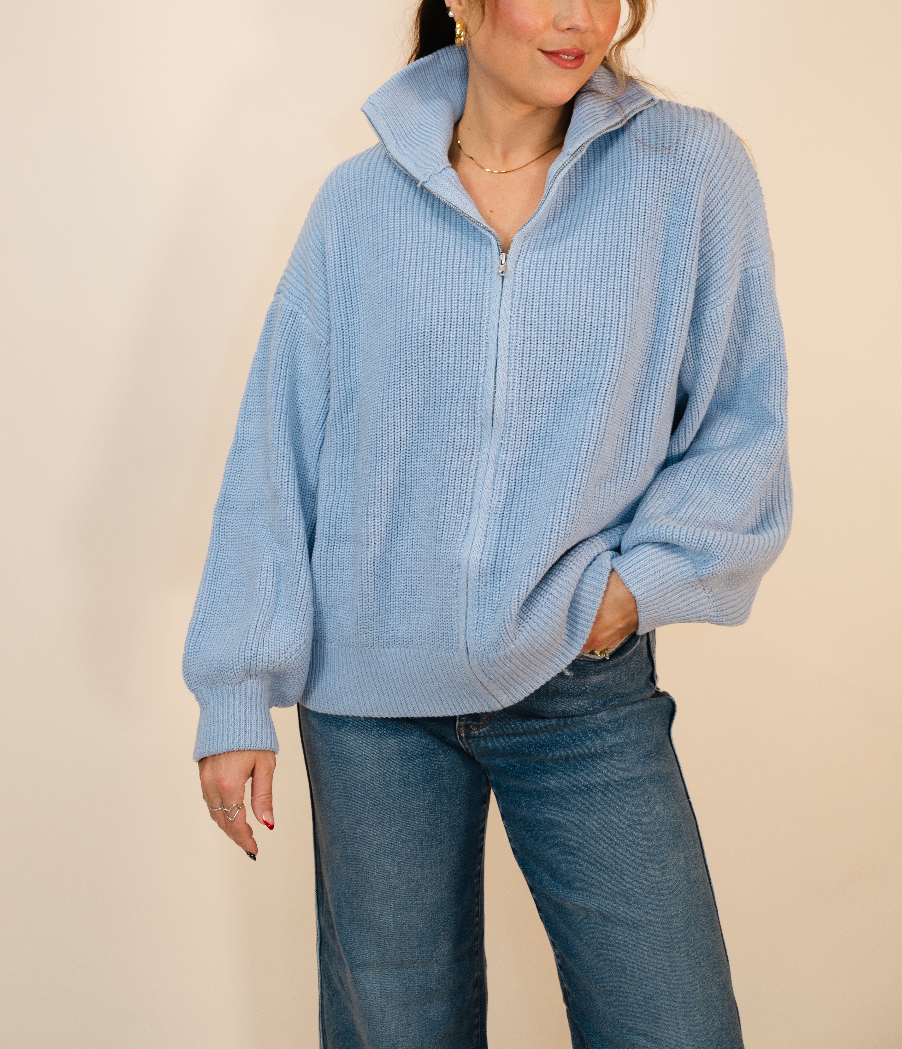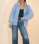 Introducing the sweater that does all the heavy lifting for you—this baby blue zip-up is soft, snuggly, and built for maximum chill vibes. The oversized silhouette drapes beautifully without any fuss, while the buttery-soft knit keeps you wrapped in comfort all day long. Zip it up for instant polish or leave it undone for that effortlessly cool aesthetic. One throw-on-and-go piece that's absolutely adorable.