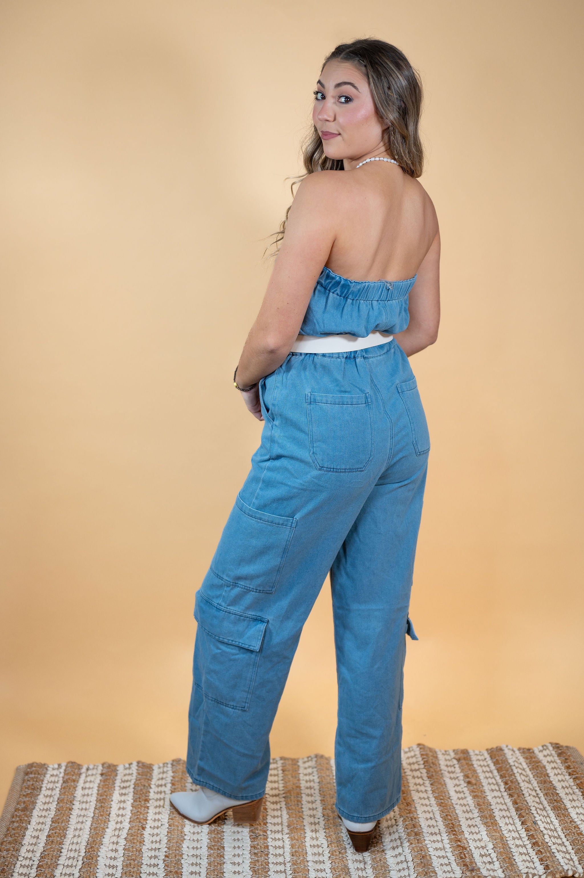 Broadway Babe Strapless Denim Jumpsuit